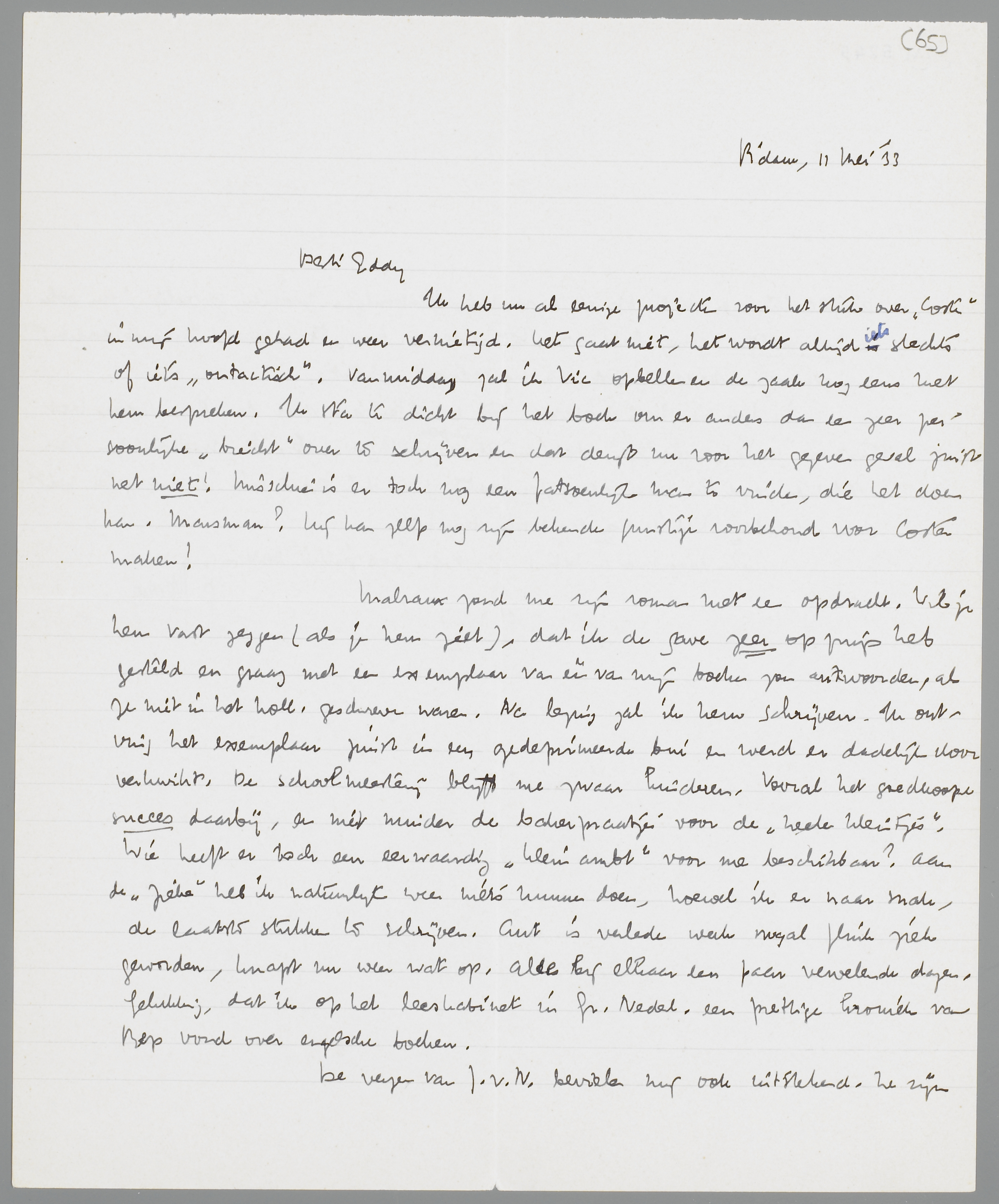 Ik heb nu al eenige projecten voor het stuk over Coster in mijn hoofd gehad en weer vernietigd. Het gaat niet, het wordt altijd iets slechts of iets ‘ontactisch’. Vanmiddag zal ik Vic opbellen en de zaak nog eens met hem bespreken. Ik sta te dicht bij het boek om er anders dan een zeer persoonlijke ‘biecht’ over te schrijven en dat deugt nu voor het gegeven geval juist net niet! Misschien is er toch nog een fatsoenlijk man te vinden, die het doen kan. Marsman? Hij kan zelfs nog zijn bekende gunstige voorbehoud voor Coster maken!