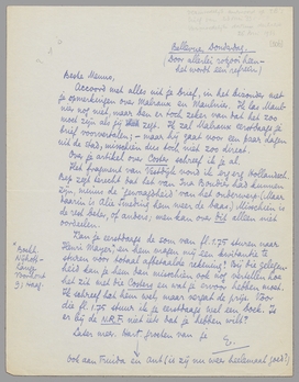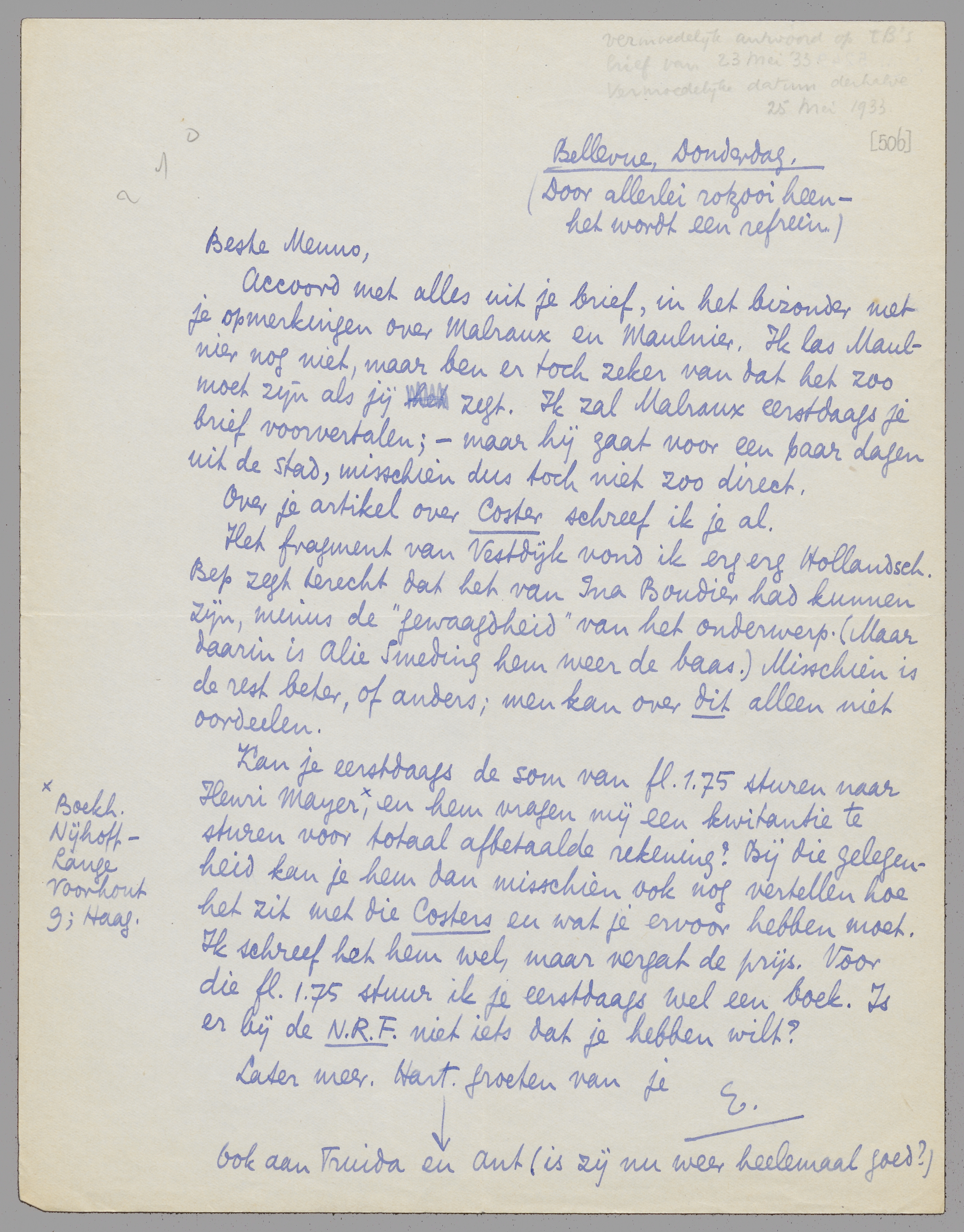 Kan je eerstdaags de som van fl. 1.75 sturen naar Henri Mayer (Boekh. Nyhoff-Lange Voorhout 9; Haag), en hem vragen mij een kwitantie te sturen voor totaal afbetaalde rekening? Bij die gelegenheid kan je hem dan misschien ook nog vertellen hoe het zit met die Costers en wat je ervoor hebben moet. Ik schreef het hem wel, maar vergat de prijs. Voor die fl. 1.75 stuur ik je eerstdaags wel een boek. Is er bij de N.R.F. niet iets dat je hebben wilt?