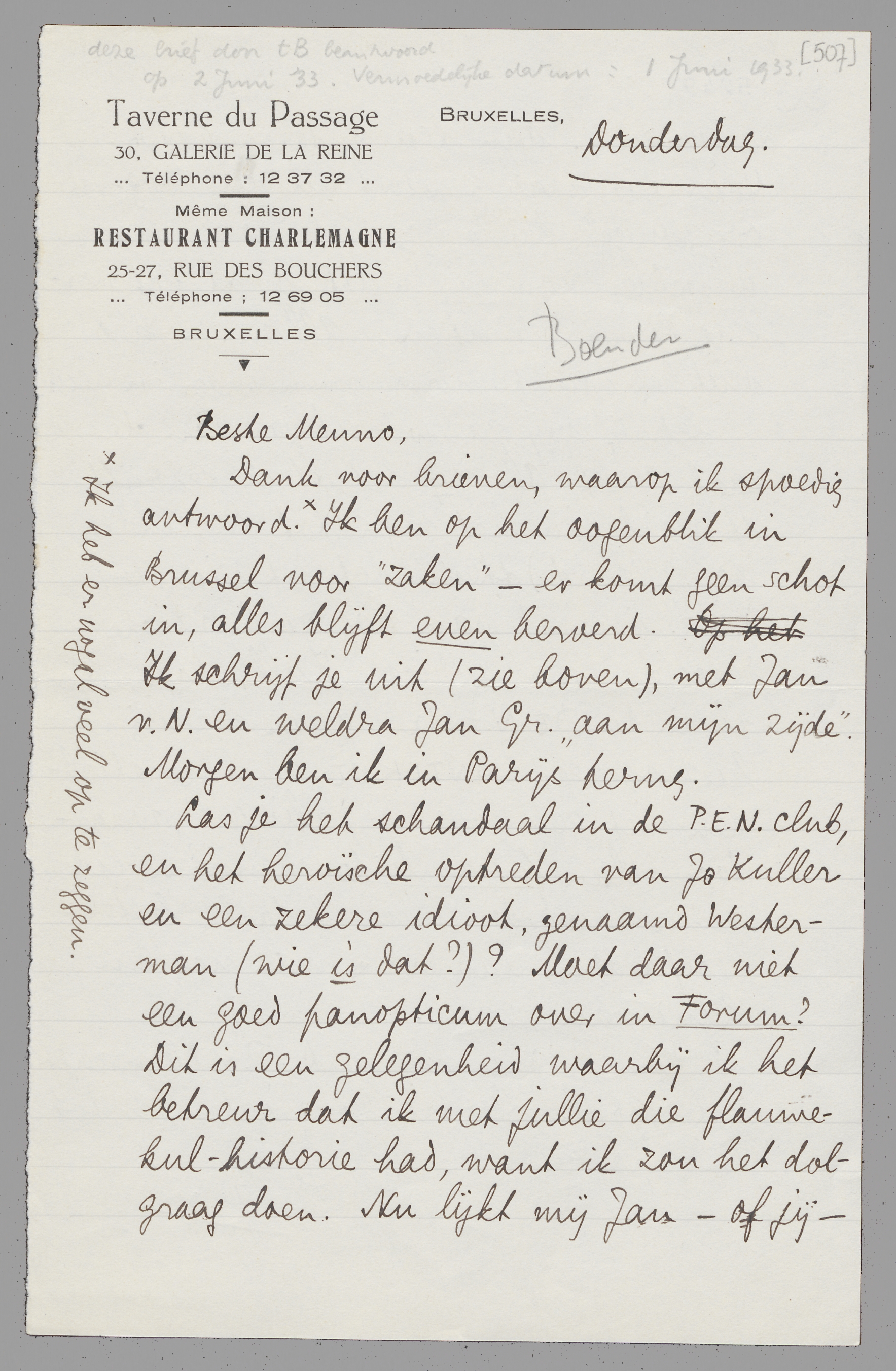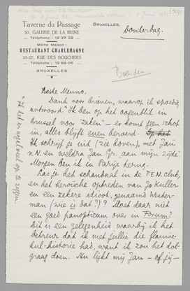 Dank voor brieven, waarop ik spoedig antwoord. [Ik heb er nogal veel op te zeggen.] Ik ben op het oogenblik in Brussel voor ‘zaken’ - er komt geen schot in, alles blijft even beroerd. Ik schrijf je uit (zie boven), met Jan v.N. en weldra Jan Gr. ‘aan mijn zijde’. Morgen ben ik in Parijs terug.