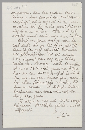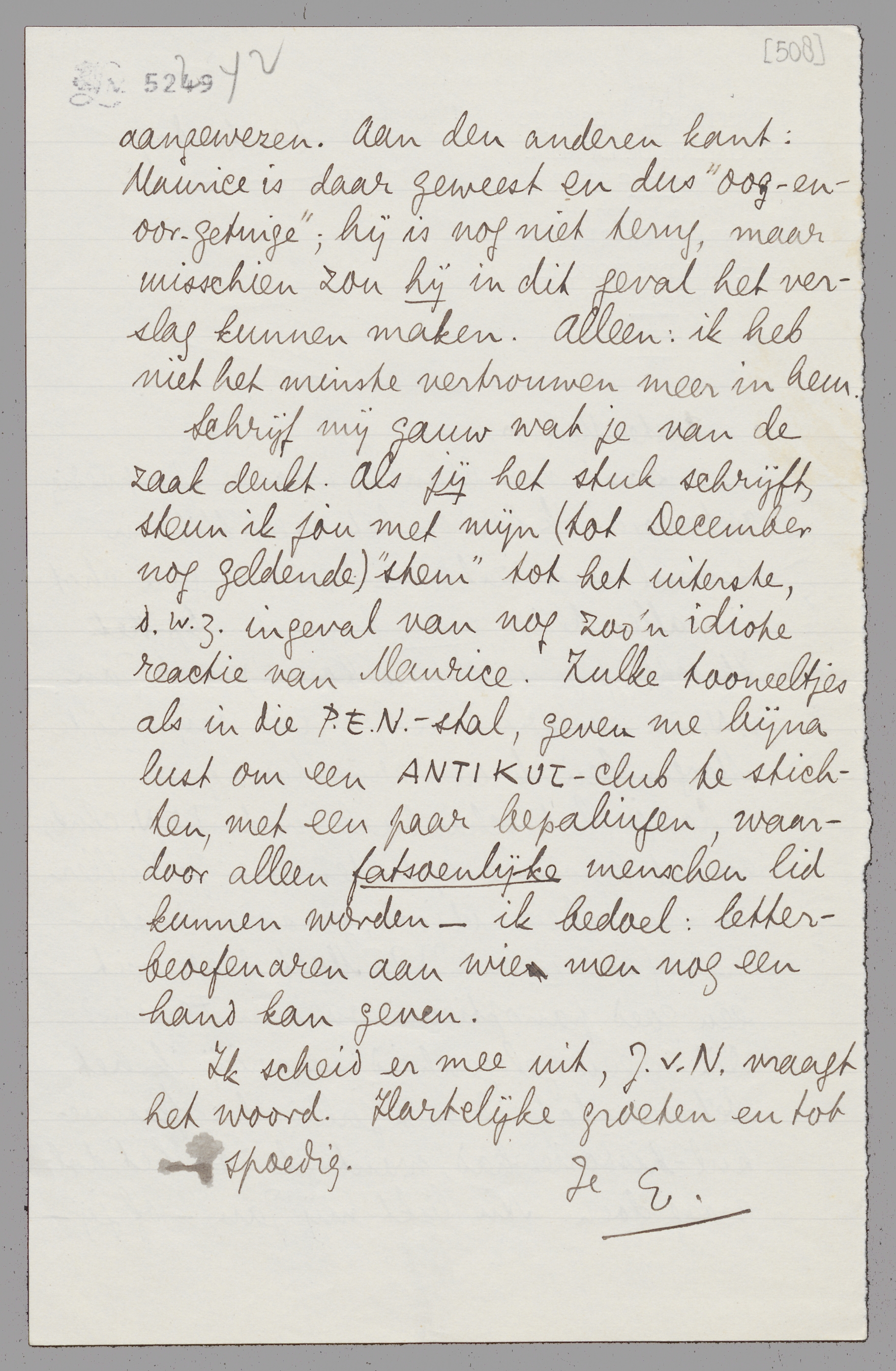 Schrijf mij gauw wat je van de zaak denkt. Als jij het stuk schrijft, steun ik jou met mijn (tot December nog geldende) ‘stem’ tot het uiterste, d.w.z. ingeval van nog zoo'n idiote reactie van Maurice. Zulke tooneeltjes als in die P.E.N. - stal, geven me bijna lust om een ANTIKUL - club te stichten, met een paar bepalingen, waardoor alleen fatsoenlijke menschen lid kunnen worden - ik bedoel: letterbeoefenaren aan wie men nog een hand kan geven.