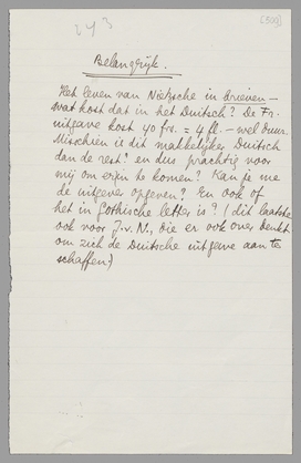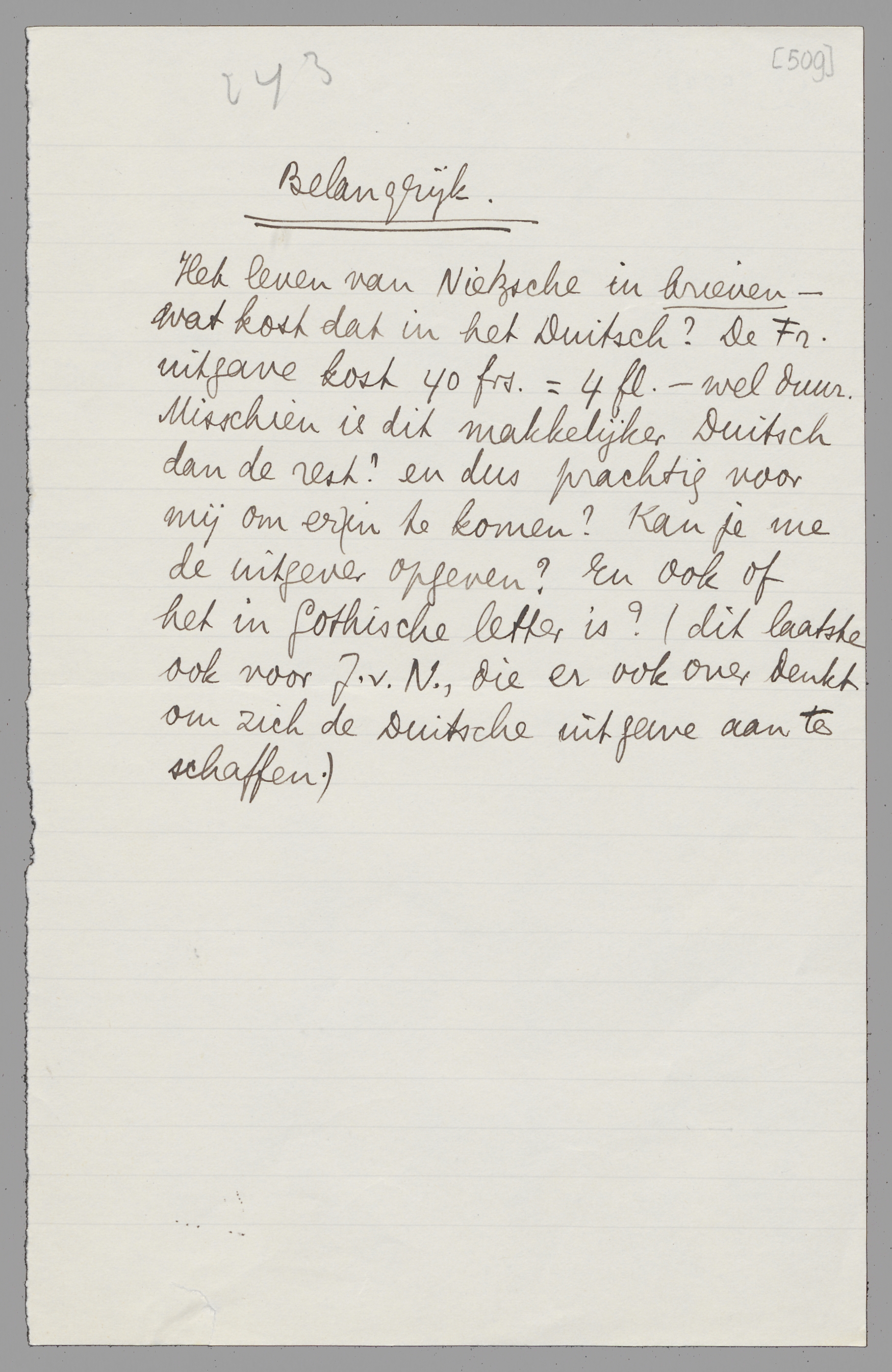 Het leven van Nietzsche in brieven - wat kost dat in het Duitsch? De Fr. uitgave kost 40 frs. = 4 fl. - wel duur. Misschien is dit makkelijker Duitsch dan de rest? en dus prachtig voor mij om er in te komen? Kan je me de uitgever opgeven? En ook of het in Gothische letter is? (dit laatste ook voor J.v.N., die er ook over denkt om zich de Duitsche uitgave aan te schaffen).