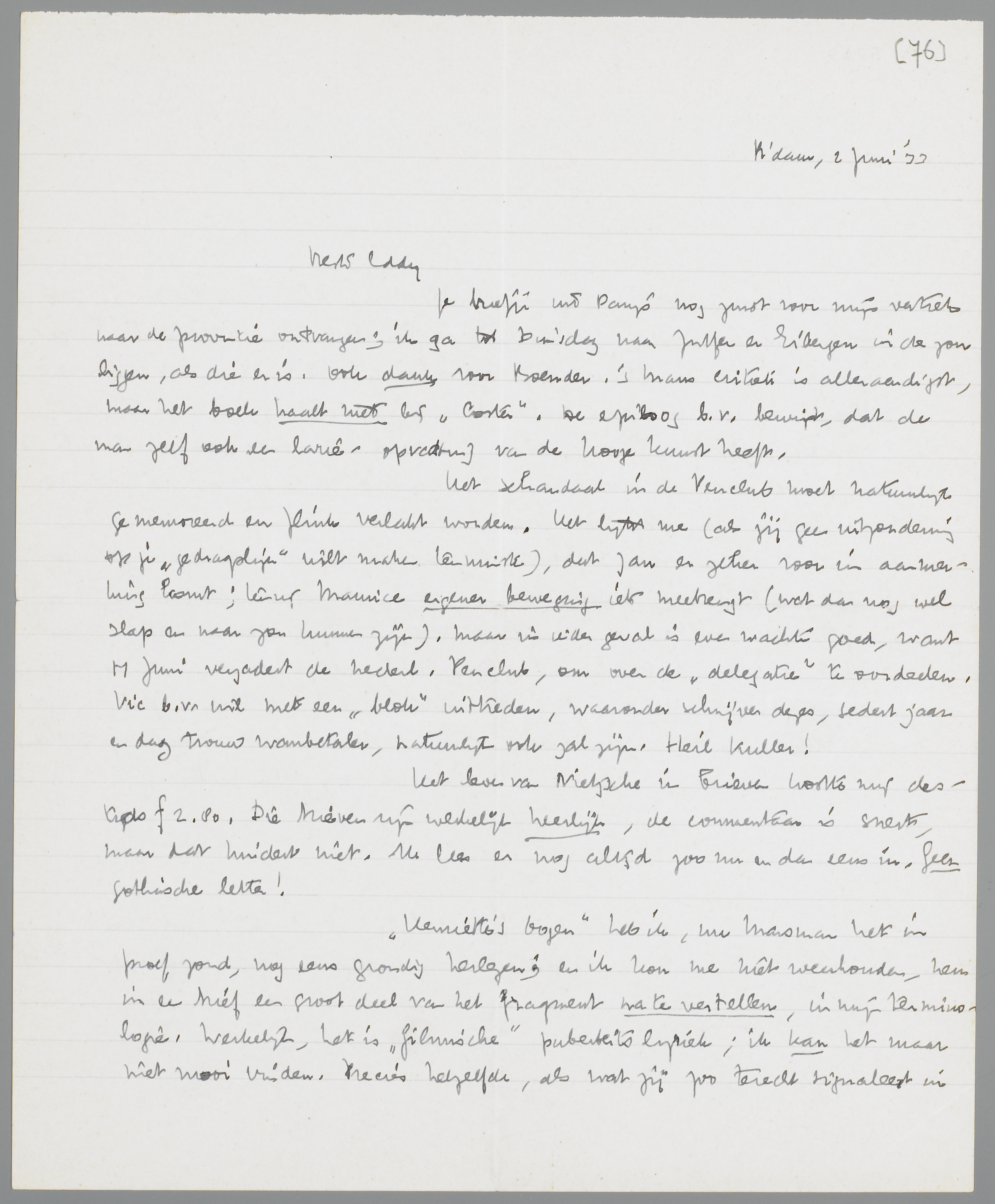 Henriëtte's oogen heb ik, nu Marsman het in proef zond, nog eens grondig herlezen; en ik kon me niet weerhouden, hem in een brief een groot deel van het fragment na te vertellen, in mijn terminologie. Werkelijk, het is ‘filmische’ puberteitslyriek; ik kan het maar niet mooi vinden. Precies hetzelfde, als wat jij zoo terecht signaleert in zijn ‘harde en bittere’ (of zooiets) Stendhal. Die meneer Rutgers is net zoo min van een ‘milde intelligentie’, als Stendhal hard en bitter is. En gemeenplaatsen, als er, dikgezaaid, in voorkomen! Ik heb hem dat nu onverbloemd nog eens geschreven en wacht nu zijn reactie af. Henriëtte's Oogen zou 24 pagina's Forum beslaan; ik vind dat zonde, nu we in Juli weer met 64 pag. moeten beginnen. Ronduit zonde. Voor mijn part 10 pagina's, maar zeker niet meer!