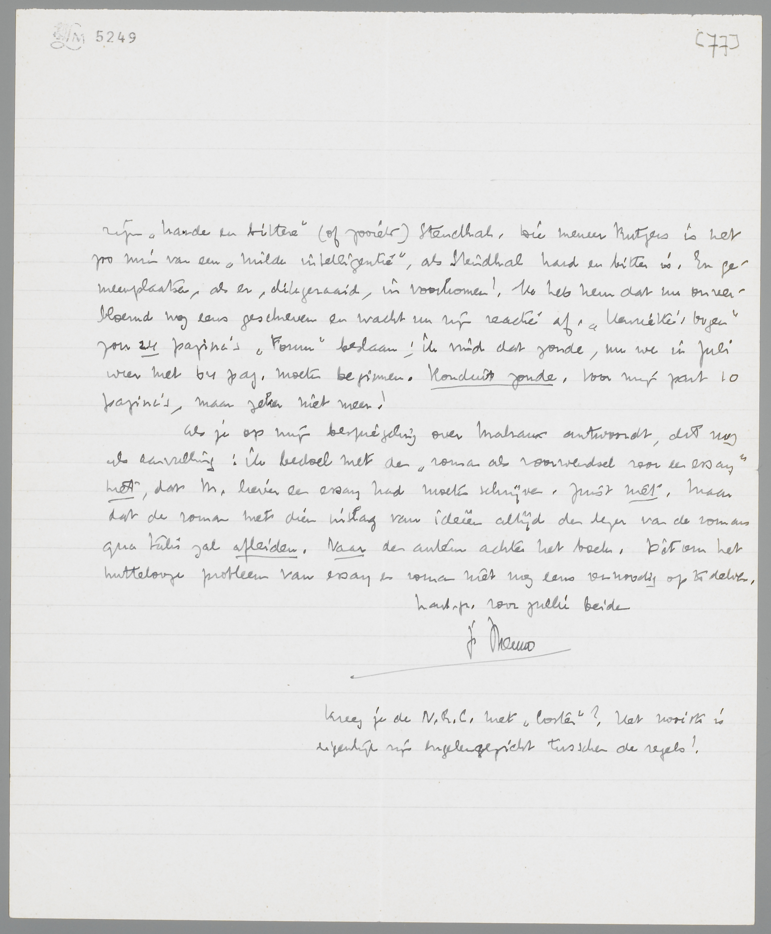 Als je op mijn bespiegeling over Malraux antwoordt, dit nog als aanvulling: ik bedoel met den ‘roman als voorwendsel voor een essay’ niet, dat M liever een essay had moeten schrijven. Juist niet. Maar dat de roman met dien inslag van ideeën altijd den lezer van de roman qua talis zal afleiden. Naar den auteur achter het boek. Dit om het nuttelooze probleem van essay en roman niet nog eens onnodig op te delven. hart. gr. voor jullie beiden