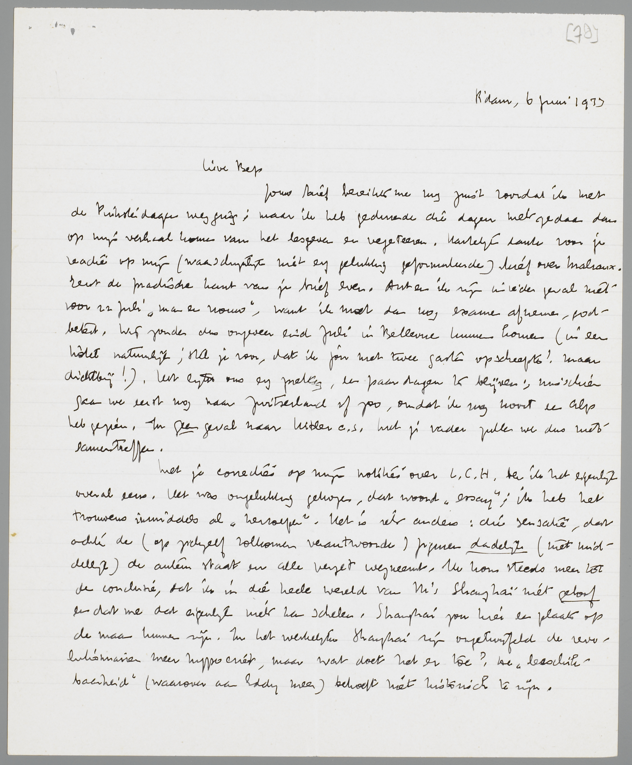 Jouw brief bereikte me nog juist voordat ik met de Pinksterdagen wegging; maar ik heb gedurende die dagen niets gedaan dan op mijn verhaal komen van het lesgeven en vegeteeren. Hartelijk dank voor je reactie op mijn (waarschijnlijk niet erg gelukkig geformuleerde) brief over Malraux. Eerst de practische kant van je brief even. Ant en ik zijn in ieder geval niet voor 22 Juli ‘man en vrouw’, want ik moet dan nog examen afnemen, godbetert. Wij zouden dus ongeveer eind Juli in Bellevue kunnen komen (in een hôtel natuurlijk; stel je voor, dat ik jou met twee gasten opscheepte! maar dichtbij!). Het lijkt ons erg prettig, een paar dagen te blijven; misschien gaan we eerst nog naar Zwitserland of zoo, omdat ik nog nooit een Alp heb gezien. In geen geval naar Hitler c.s. Met je vader zullen we dus niet samentreffen.