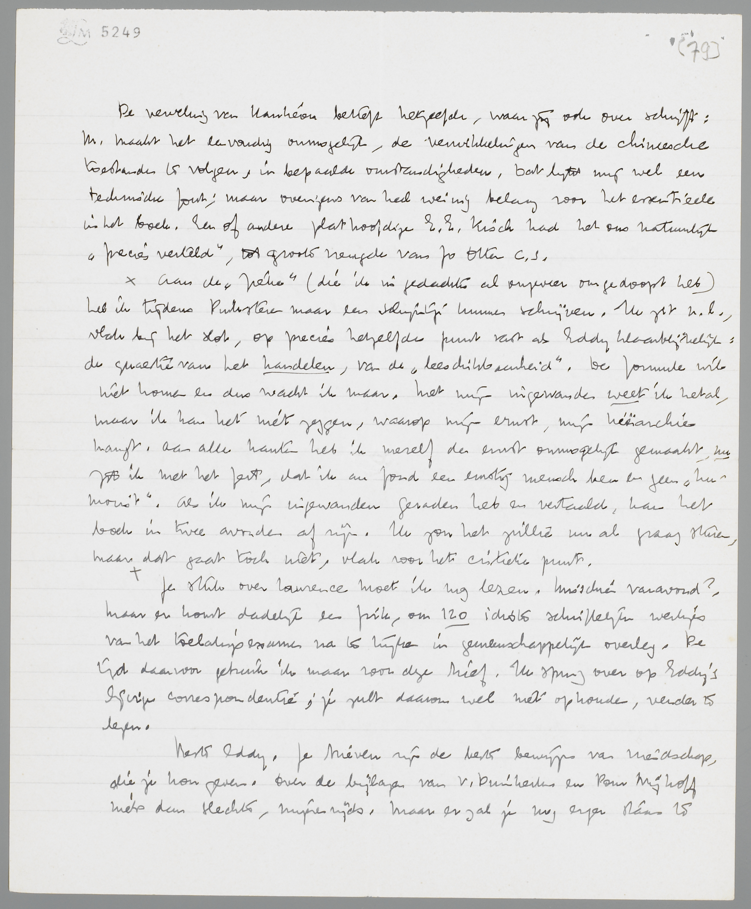 Je stuk over Lawrence moet ik nog lezen. Misschien vanavond? Maar er komt dadelijk een frik, om 120 idiote schriftelijke werkjes van het toelatingsexamen na te kijken in gemeenschappelijk overleg. De tijd daarvoor gebruik ik maar voor deze brief. Ik spring over op Eddy's lijvige correspondentie; je zult daarom wel niet ophouden, verder te lezen.