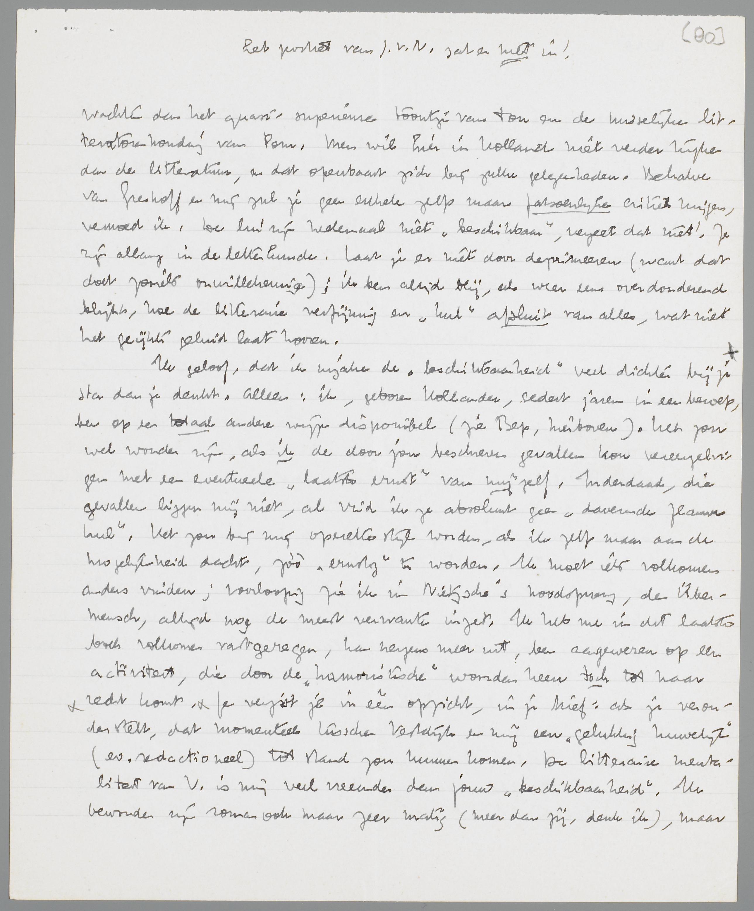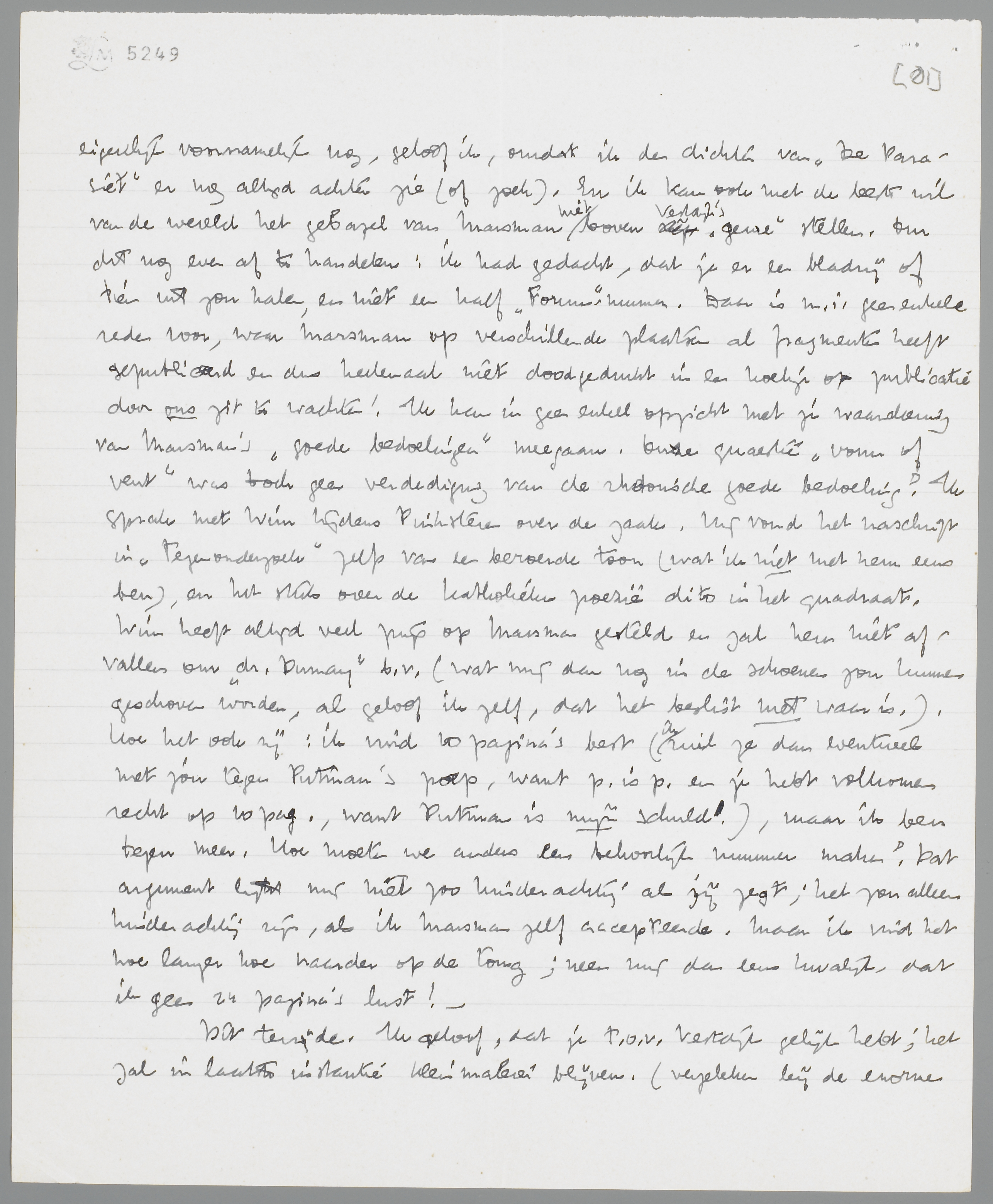 Ik geloof, dat ik inzake de ‘beschikbaarheid’ veel dichter bij je sta dan je denkt. Alleen: ik, geboren Hollander, sedert jaren in een beroep, ben op een totaal andere wijze disponibel (zie Bep, hierboven). Het zou wel wonder zijn, als ik de door jou beschreven gevallen kon vereenzelvigen met een eventueele ‘laatste ernst’ van mijzelf. Inderdaad, die gevallen liggen mij niet, al vind ik ze absoluut geen ‘daverende flauwe kul’. Het zou bij mij operettestijl worden, als ik zelfs maar aan de mogelijkheid dacht, zòò ‘ernstig’ te worden. Ik moet iets volkomen anders vinden; voorloopig zie ik in Nietzsche's noodsprong, den Übermensch, altijd nog de meest verwante inzet. Ik heb me in dit laatste boek volkomen vastgeregen, kan nergens meer uit, ben aangewezen op een activiteit, die door de ‘humoristische’ woorden heen toch tot haar recht komt. Je vergist je in één opzicht, in je brief: als je veronderstelt, dat momenteel tusschen Vestdijk en mij een gelukkig huwelijk. (ev. redactioneel) tot stand zou kunnen komen. De litteraire mentaliteit van V. is mij veel vreemder dan jouw ‘beschikbaarheid’. Ik bewonder zijn roman ook maar zeer matig (meer dan jij, denk ik), maar eigenlijk voornamelijk nog, geloof ik, omdat ik den dichter van De Parasiet er nog altijd achter zie (of zoek). En ik kan ook met de beste wil van de wereld het gebazel van Marsman niet boven Vestdijk's ‘genre’ stellen. Om dit nog even af te handelen: ik had gedacht, dat je er een bladzij of tien uit zou halen, en niet een half Forum-nummer. Daar is m.i. geen enkele reden voor, waar Marsman op verschillende plaatsen al fragmenten heeft gepubliceerd en dus heelemaal niet doodgedrukt in een hoekje op publicatie door ons zit te wachten! Ik kan in geen enkel opzicht met je waardeering van Marsman's ‘goede bedoelingen’ meegaan. Onze quaestie ‘vorm of vent’ was toch geen verdediging van de rhetorische goede bedoeling? Ik sprak met Wim tijdens Pinksteren over de zaak. Hij vond het naschrift in Tegenonderzoek zelfs van een beroerde toon (wat ik niet met hem eens ben), en het stuk over de Katholieke poëzie dito in het quadraat. Wim heeft altijd veel prijs op Marsman gesteld en zal hem niet afvallen om dr. Dumay b.v. (wat mij dan nog in de schoenen zou kunnen geschoven worden, al geloof ik zelf, dat het beslist niet waar is.). Hoe het ook zij: ik vind 10 pagina's best (ik ruil ze dan eventueel met jou tegen Putman's poep, want p. is p. en je hebt volkomen recht op 10 pag., want Putman is mijn schuld!), maar ik ben tegen meer. Hoe moeten we anders een behoorlijk nummer maken? Dat argument lijkt mij niet zoo kinderachtig als jij zegt; het zou alleen kinderachtig zijn, als ik Marsman zelf accepteerde. Maar ik vind het hoe langer hoe naarder op de tong; neem mij dan eens kwalijk, dat ik geen 24 pagina's lust! -