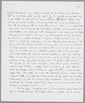 Aan de Zieke (die ik in gedachten al ongeveer omgedoopt heb) heb ik tijdens Pinksteren maar een schijntje kunnen schrijven. Ik zit n.l., vlak bij het slot, op precies hetzelfde punt vast als Eddy klaarblijkelijk: de quaestie van het handelen, van de ‘beschikbaarheid’. De formule wil niet komen en dus wacht ik maar. Met mijn ingewanden weet ik het al, maar ik kan het niet zeggen, waarop mijn ernst, mijn hiërarchie hangt. Aan alle kanten heb ik mezelf de ernst onmogelijk gemaakt, nu zit ik met het feit, dat ik au fond een ernstig mensch ben en geen ‘humorist’. Als ik mijn ingewanden geraden heb en vertaald, kan het boek in twee avonden af zijn. Ik zou het jullie nu al graag sturen, maar dat gaat toch niet, vlak voor het critieke punt.