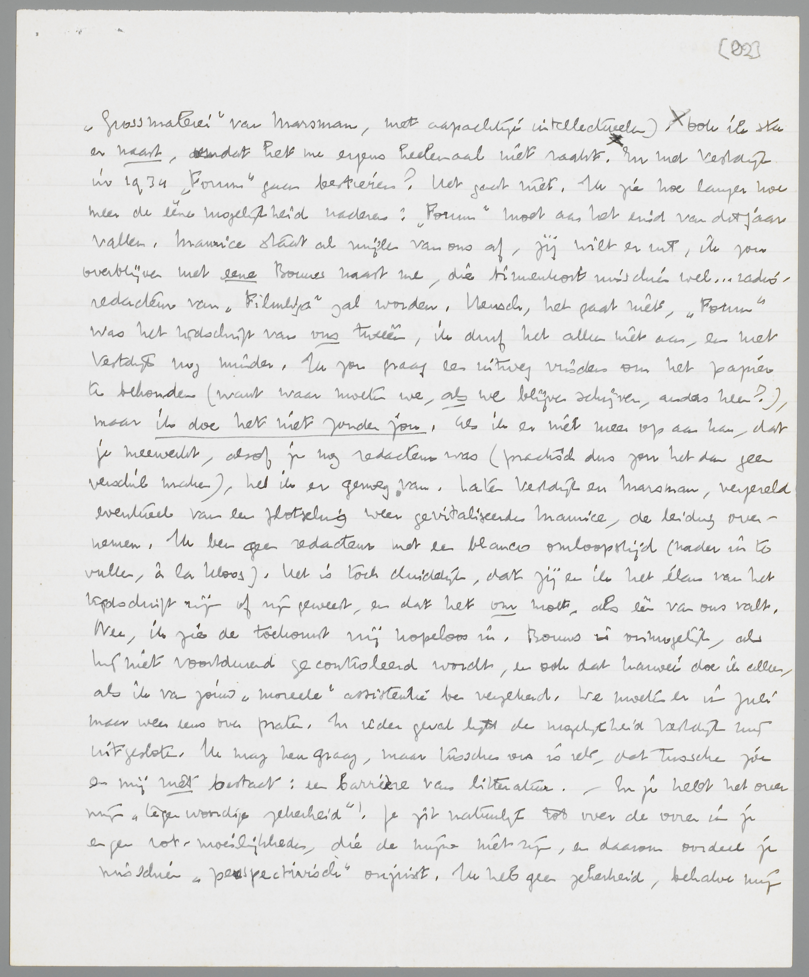 Dit terzijde. Ik geloof, dat je t.o.v. Vestdijk gelijk hebt; het zal in laatste instantie kleinmalerei blijven. (vergeleken bij de enorme ‘Grossmalerei’ van Marsman, met aapachtige intellectueelen). Ook ik sta er naast, omdat het me ergens heelemaal niet raakt. En met Vestdijk in 1934 Forum gaan bestieren? Het gaat niet. Ik zie hoe langer hoe meer de ééne mogelijkheid naderen: Forum moet aan het eind van dit jaar vallen. Maurice staat al mijlen van ons af, jij wilt er uit, ik zou overblijven met eene Bouws naast me, die binnenkort misschien wel... radioredacteur van Filmliga zal worden. Heusch, het gaat niet, Forum was het tijdschrift van ons tweeën, ik durf het alleen niet aan, en met Vestdijk nog minder. Ik zou graag een uitweg vinden om het papier te behouden (want waar moeten we, als we blijven schrijven, anders heen?), maar ik doe het niet zonder jou. Als ik er niet meer op aan kan, dat je meewerkt, alsof je nog redacteur was (practisch dus zou het dan geen verschil maken), heb ik er genoeg van. Laten Vestdijk en Marsman, vergezeld eventueel van een plotseling weer gevitaliseerde Maurice, de leiding overnemen. Ik ben geen redacteur met een blanco omloopstijd (nader in te vullen, à la Kloos). Het is toch duidelijk, dat jij en ik het élan van het tijdschrift zijn of zijn geweest, en dat het om moet, als één van ons valt. Nee, ik zie de toekomst vrij hopeloos in. Bouws is onmogelijk, als hij niet voortdurend gecontroleerd wordt, en ook dat karwei doe ik alleen, als ik van jouw ‘moreele’ assistentie ben verzekerd. We moeten er in Juli maar weer eens over praten. In ieder geval lijkt de mogelijkheid Vestdijk mij uitgesloten. Ik mag hem graag, maar tusschen ons is iets, dat tusschen jou en mij niet bestaat: een barrière van litteratuur. - En je hebt het over mijn ‘tegenwoordige zekerheid’! Je zit natuurlijk tot over de ooren in je eigen rotmoeilijkheden, die de mijne niet zijn, en daarom oordeel je misschien ‘perspectivisch’ onjuist. Ik heb geen zekerheid, behalve mijn tallooze zekerheden, dat overal woorden en nog eens woorden ons oplichten, alle negatieve zekerheden tegen de ‘geestelijke’ aanmatiging op ieder gebied. Maar ik sta precies zoo ‘beschikbaar’ als jij, alleen met een totaal ander temperament, met andere gegevens, en in andere condities.