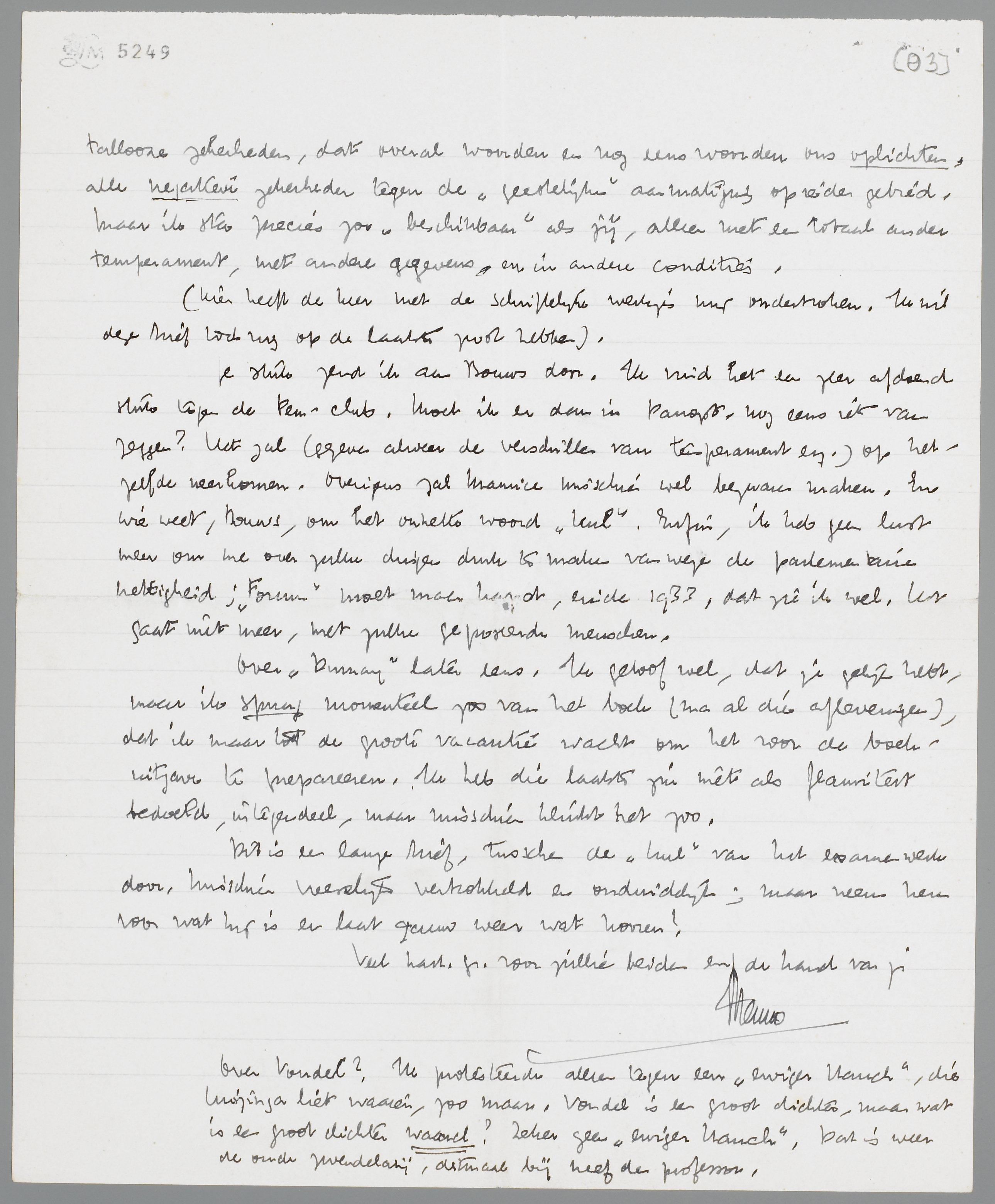 Over Vondel? Ik protesteerde alleen tegen een ‘ewiger Hauch’, die Huizinga liet waaien, zoo maar. Vondel is een groot dichter, maar wat is een groot dichter waard? Zeker geen ‘ewiger Hauch’. Dat is weer de oude zwendelarij, ditmaal bij neef den professor.