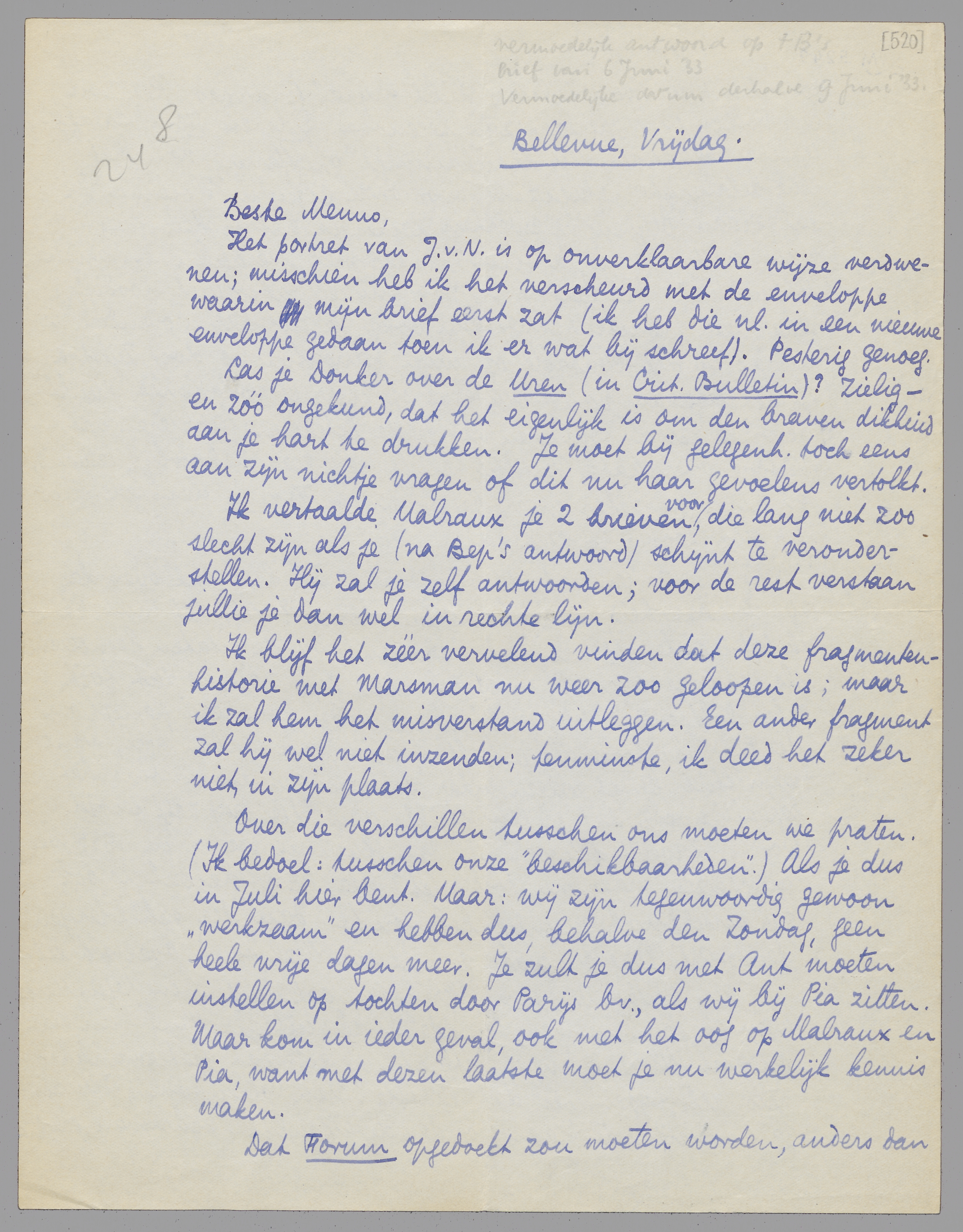 Over die verschillen tusschen ons moeten we praten. (Ik bedoel: tusschen onze ‘beschikbaarheden’.) Als je dus in Juli hier bent. Maar: wij zijn tegenwoordig gewoon ‘werkzaam’ en hebben dus, behalve den Zondag, geen heele vrije dagen meer. Je zult je dus met Ant moeten instellen op tochten door Parijs bv., als wij bij Pia zitten. Maar kom in ieder geval, ook met het oog op Malraux en Pia, want met dezen laatste moet je nu werkelijk kennis maken.