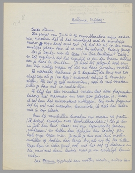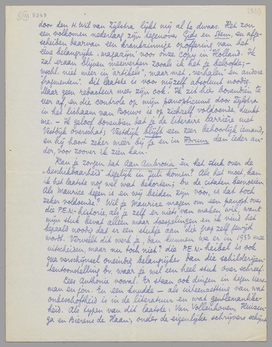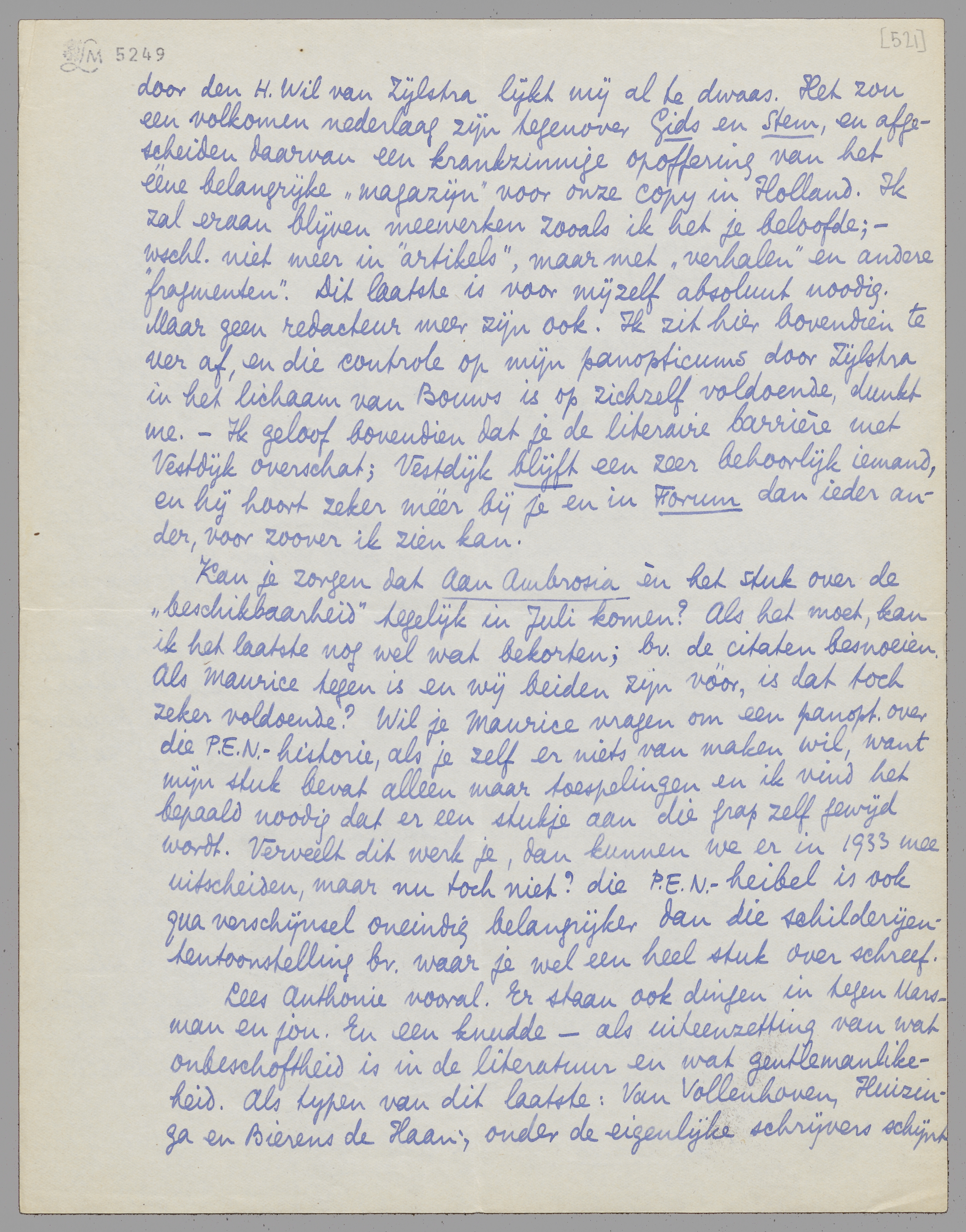 Kan je zorgen dat Aan Ambrosia èn het stuk over de ‘beschikbaarheid’ tegelijk in Juli komen? Als het moet, kan ik het laatste nog wel wat bekorten; bv. de citaten besnoeien. Als Maurice tegen is en wij beiden zijn vóór, is dat toch zeker voldoende? Wil je Maurice vragen om een panopt. over die P.E.N. - historie, als je zelf er niets van maken wil, want mijn stuk bevat alleen maar toespelingen en ik vind het bepaald noodig dat er een stukje aan die grap zelf gewijd wordt. Verveelt dit werk je, dan kunnen we er in 1933 mee uitscheiden maar nu toch niet? die P.E.N. - heibel is ook qua verschijnsel oneindig belangrijker dan die schilderijen-tentoonstelling bv. waar je wel een heel stuk over schreef.