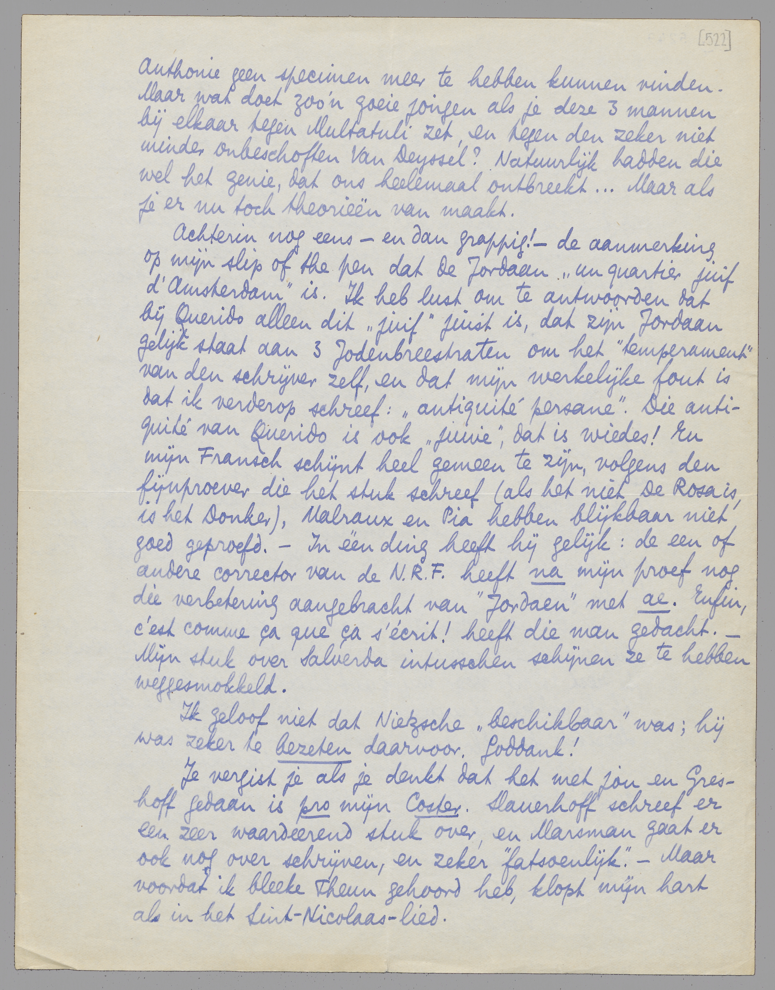 Achterin nog eens - en dan grappig! - de aanmerking op mijn slip of the pen dat de Jordaan ‘un quartier juif d'Amsterdam’ is. Ik heb lust om te antwoorden dat bij Querido alleen dit ‘juif’ juist is, dat zijn Jordaan gelijk staat aan 3 Jodenbreestraten om het ‘temperament’ van den schrijver zelf, en dat mijn werkelijke fout is dat ik verderop schreef: ‘antiquité persane’. Die antiquité van Querido is ook ‘juive’, dat is wiedes! En mijn Fransch schijnt heel gemeen te zijn, volgens den fijnproever die het stuk schreef (als het niet De Rosa is, is het Donker), Malraux en Pia hebben blijkbaar niet goed geproefd. - In één ding heeft hij gelijk: de een of andere corrector van de N.R.F. heeft na mijn proef nog die verbetering aangebracht van ‘Jordaen’ met ae. Enfin, c'est comme ça que ça s'écrit! heeft die man gedacht. - Mijn stuk over Salverda intusschen schijnen ze te hebben weggesmokkeld.