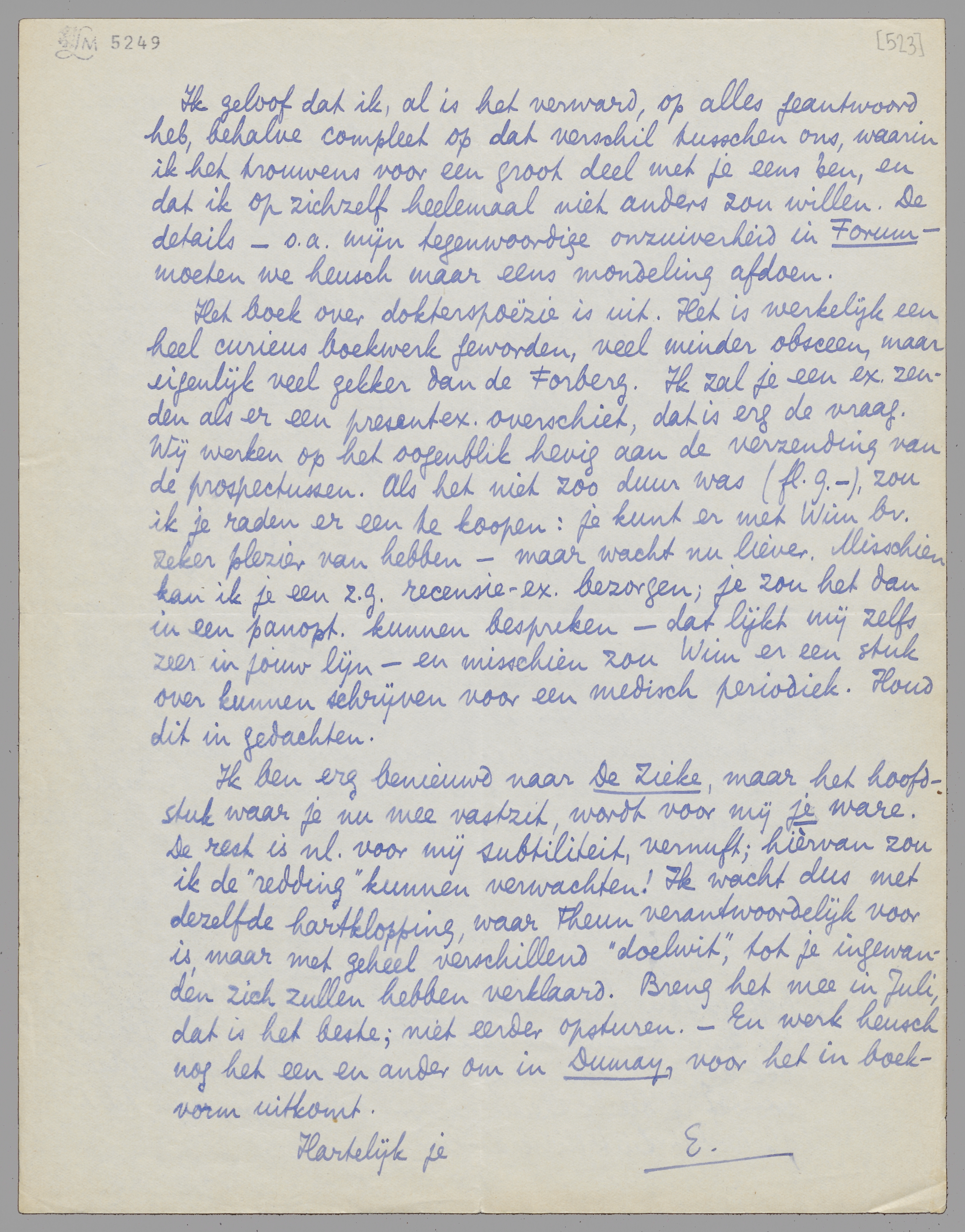 Het boek over dokterspoëzie is uit. Het is werkelijk een heel curieus boekwerk geworden, veel minder obsceen, maar eigenlijk veel gekker dan de Forberg. Ik zal je een ex. zenden als er een presentex. overschiet, dat is erg de vraag. Wij werken op het oogenblik hevig aan de verzending van de prospectussen. Als het niet zoo duur was (fl. 9.-), zou ik je raden er een te koopen: je kunt er met Wim bv. zeker plezier van hebben - maar wacht nu liever. Misschien kan ik je een z.g. recensie-ex. bezorgen; je zou het dan in een panopt. kunnen bespreken - dat lijkt mij zelfs zeer in jouw lijn - en misschien zou Wim er een stuk over kunnen schrijven voor een medisch periodiek. Houd dit in gedachten.
