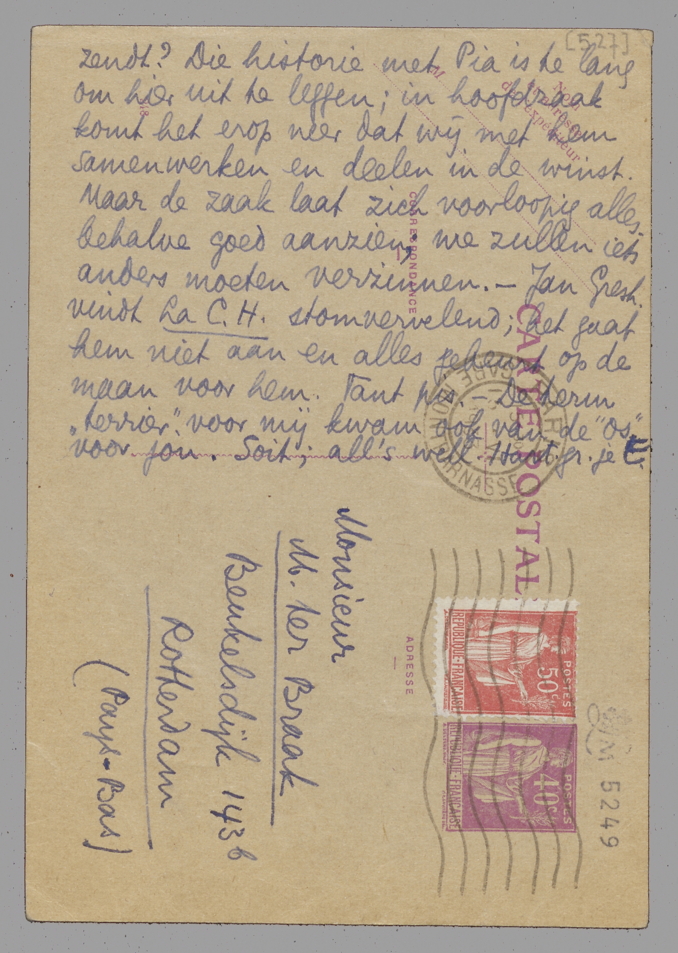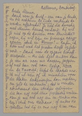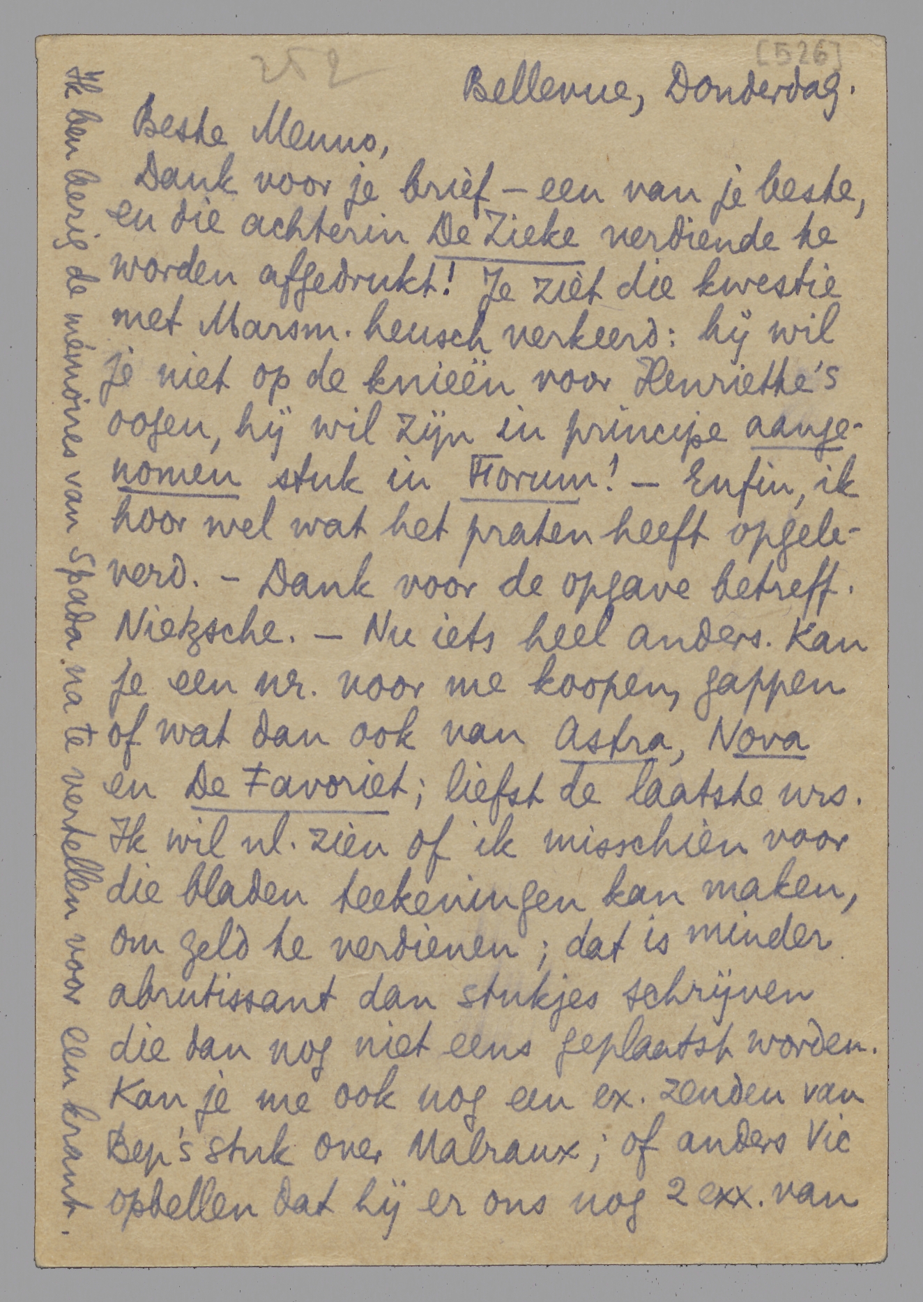 Dank voor je brief - een van je beste, en die achterin De Zieke verdiende te worden afgedrukt! Je ziet die kwestie met Marsm. heusch verkeerd: hij wil je niet op de knieën voor Henriette's oogen, hij wil zijn in principe aangenomen stuk in Forum! - Enfin, ik hoor wel wat het praten heeft opgeleverd. - Dank voor de opgave betreff. Nietzsche. - Nu iets heel anders. Kan je een nr. voor me koopen, gappen of wat dan ook van Astra, Nova en De Favoriet; liefst de laatste nrs. Ik wil nl. zien of ik misschien voor die bladen teekeningen kan maken, om geld te verdienen; dat is minder abrutissant dan stukjes schrijven die dan nog niet eens geplaatst worden. Kan je me ook nog een ex. zenden van Bep's stuk over Malraux; of anders Vic opbellen dat hij er ons nog 2 exx. van zendt? Die historie met Pia is te lang om hier uit te leggen; in hoofdzaak komt het erop neer dat wij met hem samenwerken en deelen in de winst. Maar de zaak laat zich voorloopig allesbehalve goed aanzien; we zullen iets anders moeten verzinnen. - Jan Gresh. vindt La C.H. stomvervelend; het gaat hem niet aan en alles gebeurt op de maan voor hem. Tant pis. - De term ‘terrier’ voor mij kwam ook van de ‘Os’ voor jou. Soit; all's well. Hart. gr. je