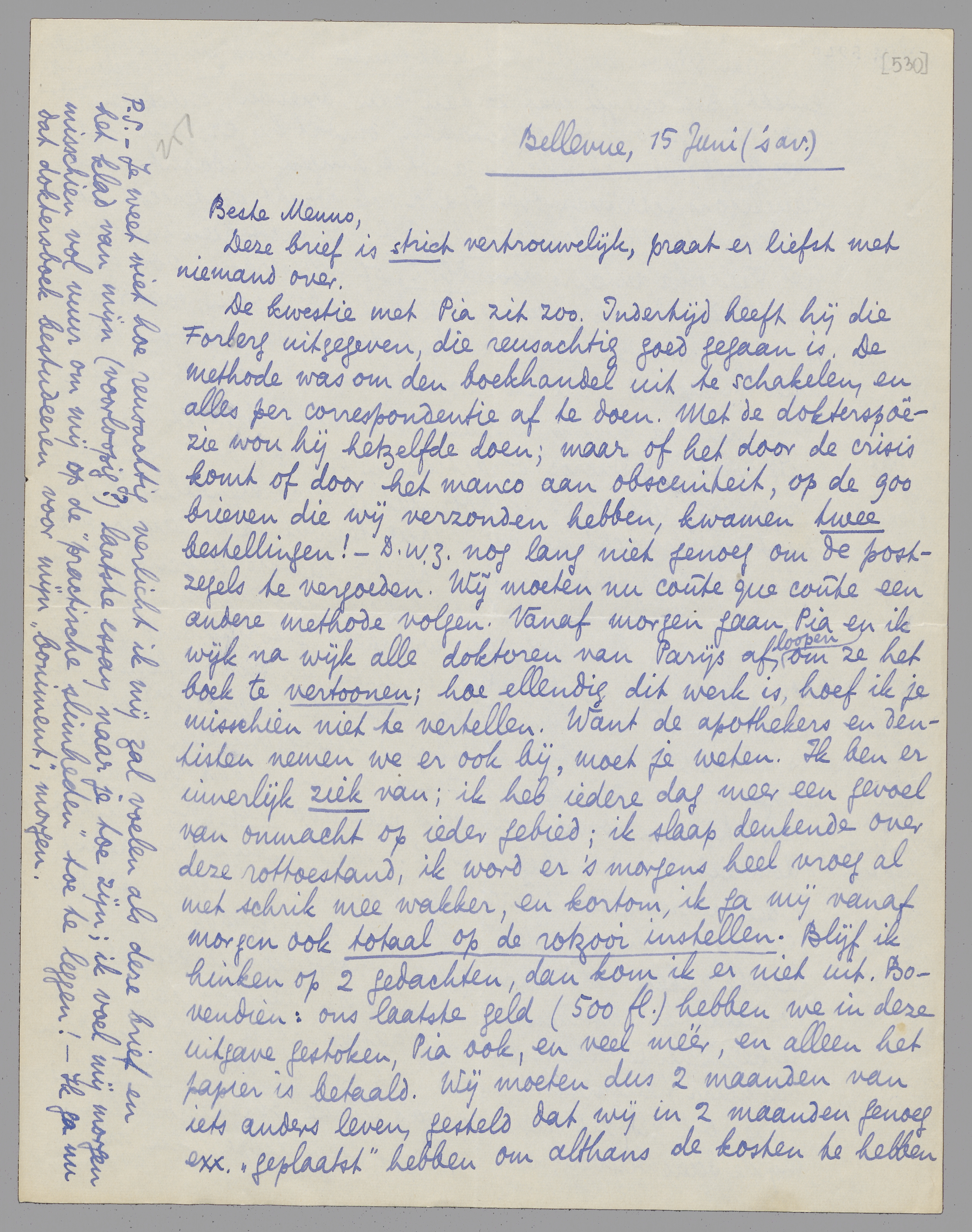 De kwestie met Pia zit zoo. Indertijd heeft hij die Forberg uitgegeven, die reusachtig goed gegaan is. De methode was om den boekhandel uit te schakelen, en alles per correspondentie af te doen. Met de dokterspoëzie wou hij hetzelfde doen; maar of het door de crisis komt of door het manco aan obsceniteit, op de 900 brieven die wij verzonden hebben, kwamen twee bestellingen! - D.w.z. nog lang niet genoeg om de postzegels te vergoeden. Wij moeten nu coûte que coûte een andere methode volgen. Vanaf morgen gaan Pia en ik wijk na wijk alle doktoren van Parijs afloopen, om ze het boek te vertoonen; hoe ellendig dit werk is, hoef ik je misschien niet te vertellen. Want de apothekers en dentisten nemen we er ook bij, moet je weten. Ik ben er innerlijk ziek van; ik heb iedere dag meer een gevoel van onmacht op ieder gebied; ik slaap denkende over deze rottoestand, ik word er 's morgens heel vroeg al met schrik mee wakker, en kortom, ik ga mij vanaf morgen ook totaal op de rotzooi instellen. Blijf ik hinken op 2 gedachten, dan kom ik er niet uit. Bovendien: ons laatste geld (500 fl.) hebben we in deze uitgave gestoken, Pia ook, en veel méér, en alleen het papier is betaald. Wij moeten dus 2 maanden van iets anders leven, gesteld dat wij in 2 maanden genoeg exx. ‘geplaatst’ hebben om althans de kosten te hebben gedekt. Aan Simone en Gille heb ik al minder moeten zenden, ondanks doktersrekeningen. Bep schrijft wat ze kan aan ‘brieven’; artikelen voor Vic zijn overbodig geworden, omdat hij er geen plaats voor heeft; ik heb allerlei andere dingen bedacht: als feuilletons schrijven over Spada (ik wacht op bericht hierover van de Nwe Arnhemsche Crt.) of misschien interviews met Fransche auteurs voor D.G.W., of illustraties voor de snertbladen die ik je vroeg. Ik wil alles doen; maar de proef van morgen geeft me het definitieve gevoel dat alles ook veranderd is, en als zoodanig moet worden aanvaard.