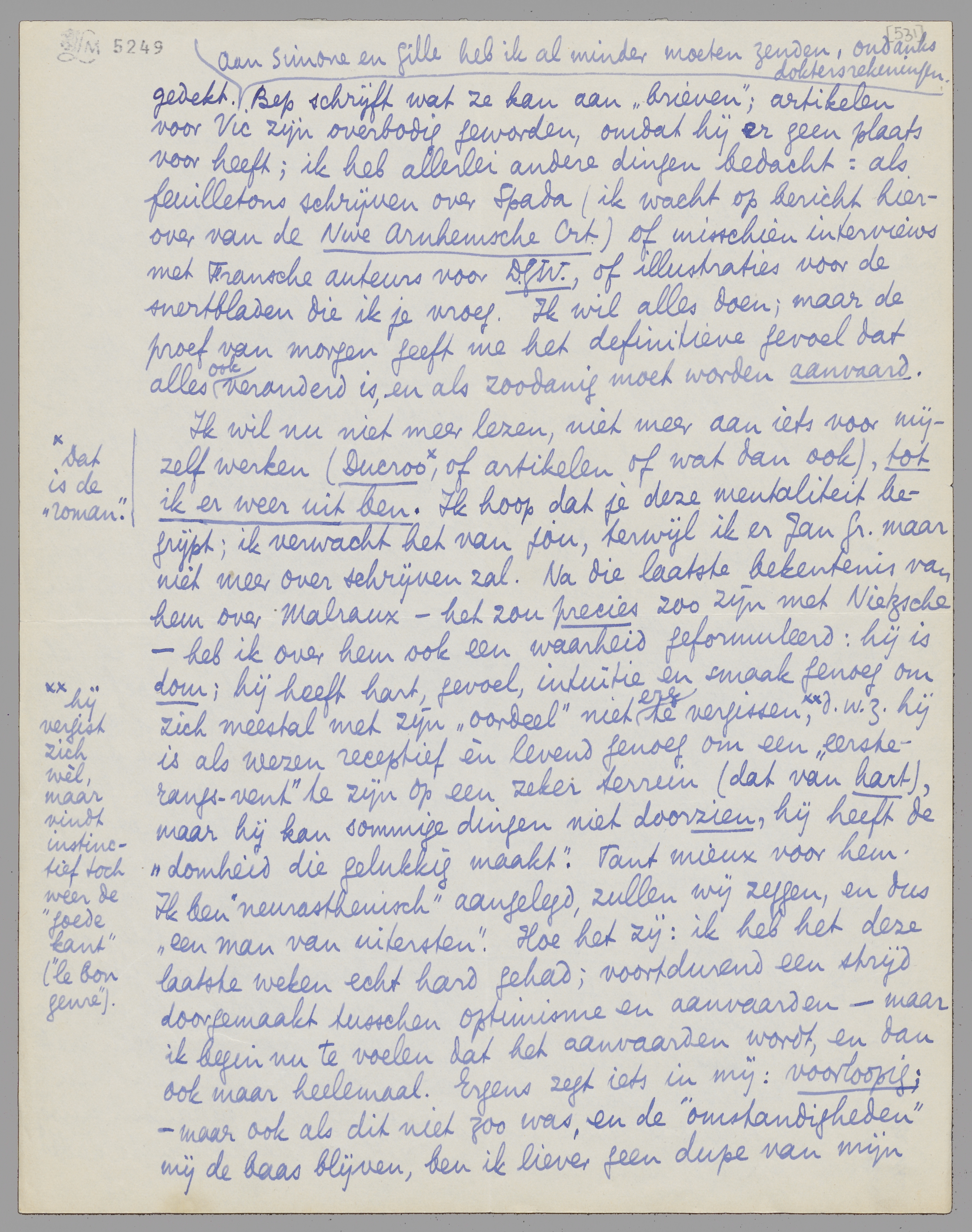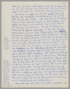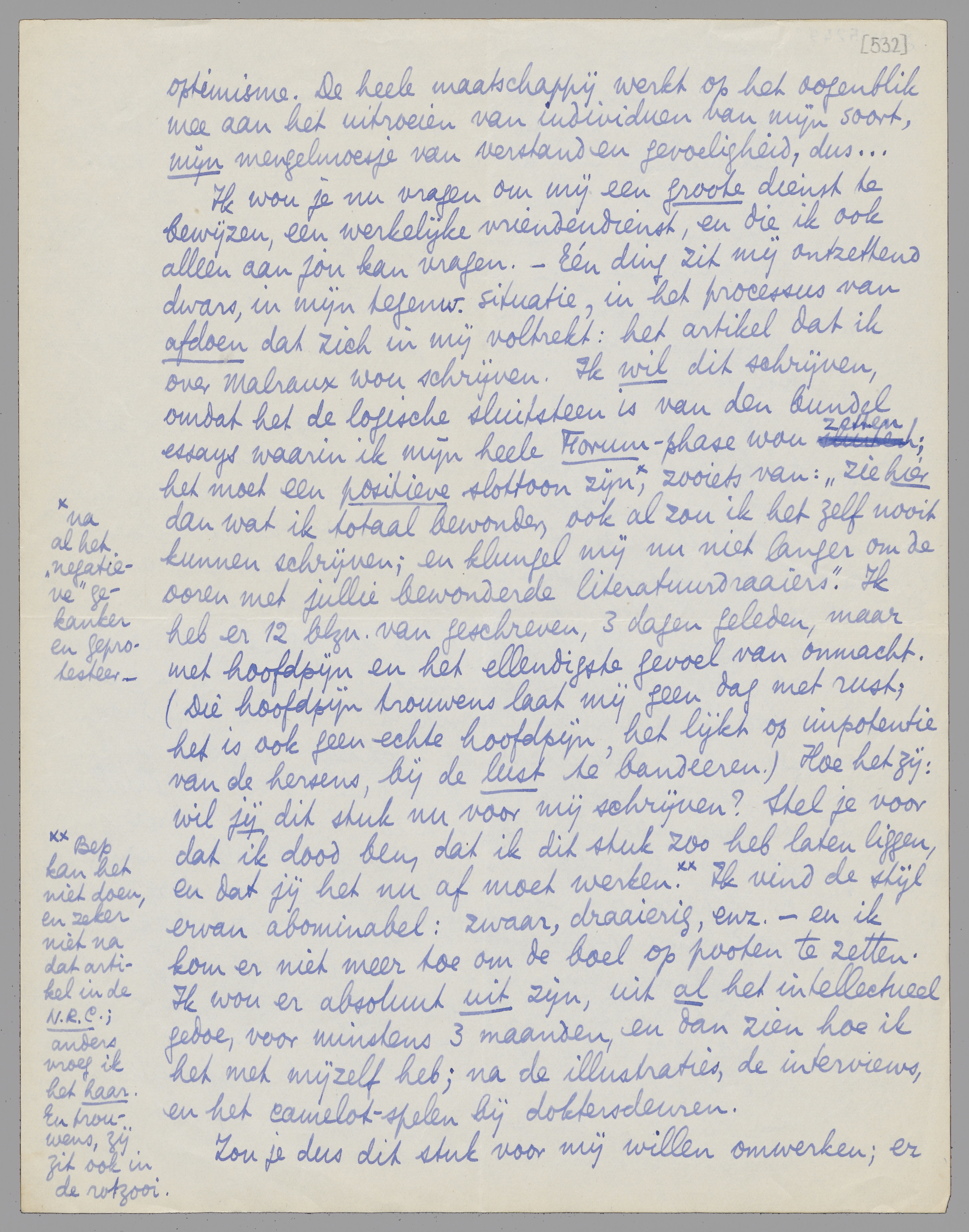 Ik wou je nu vragen om mij een groote dienst te bewijzen, een werkelijke vriendendienst, en die ik ook alleen aan jou kan vragen. - Eén ding zit mij ontzettend dwars, in mijn tegenw. situatie, in het processus van afdoen dat zich in mij voltrekt: het artikel dat ik over Malraux wou schrijven. Ik wil dit schrijven, omdat het de logische sluitsteen is van den bundel essays waarin ik mijn heele Forum-phase wou zetten; het moet een positieve slottoon zijn,** zooiets van: ‘zie hier dan wat ik totaal bewonder, ook al zou ik het zelf nooit kunnen schrijven; en klungel mij nu niet langer om de ooren met jullie bewonderde literatuurdraaiers’. Ik heb er 12 blzn. van geschreven, 3 dagen geleden, maar met hoofdpijn en het ellendigste gevoel van onmacht. (Die hoofdpijn trouwens laat mij geen dag met rust; het is ook geen echte hoofdpijn, het lijkt op impotentie van de hersens, bij de lust te bandeeren.) Hoe het zij: wil jij dit stuk nu voor mij schrijven? Stel je voor dat ik dood ben, dat ik dit stuk zoo heb laten liggen, en dat jij het nu af moet werken.*** Ik vind de stijl ervan abominabel: zwaar, draaierig, enz. - en ik kom er niet meer toe om de boel op pooten te zetten. Ik wou er absoluut uit zijn, uit al het intellectueel gedoe, voor minstens 3 maanden, en dan zien hoe ik het met mijzelf heb; na de illustraties, de interviews, en het camelot-spelen bij doktersdeuren.