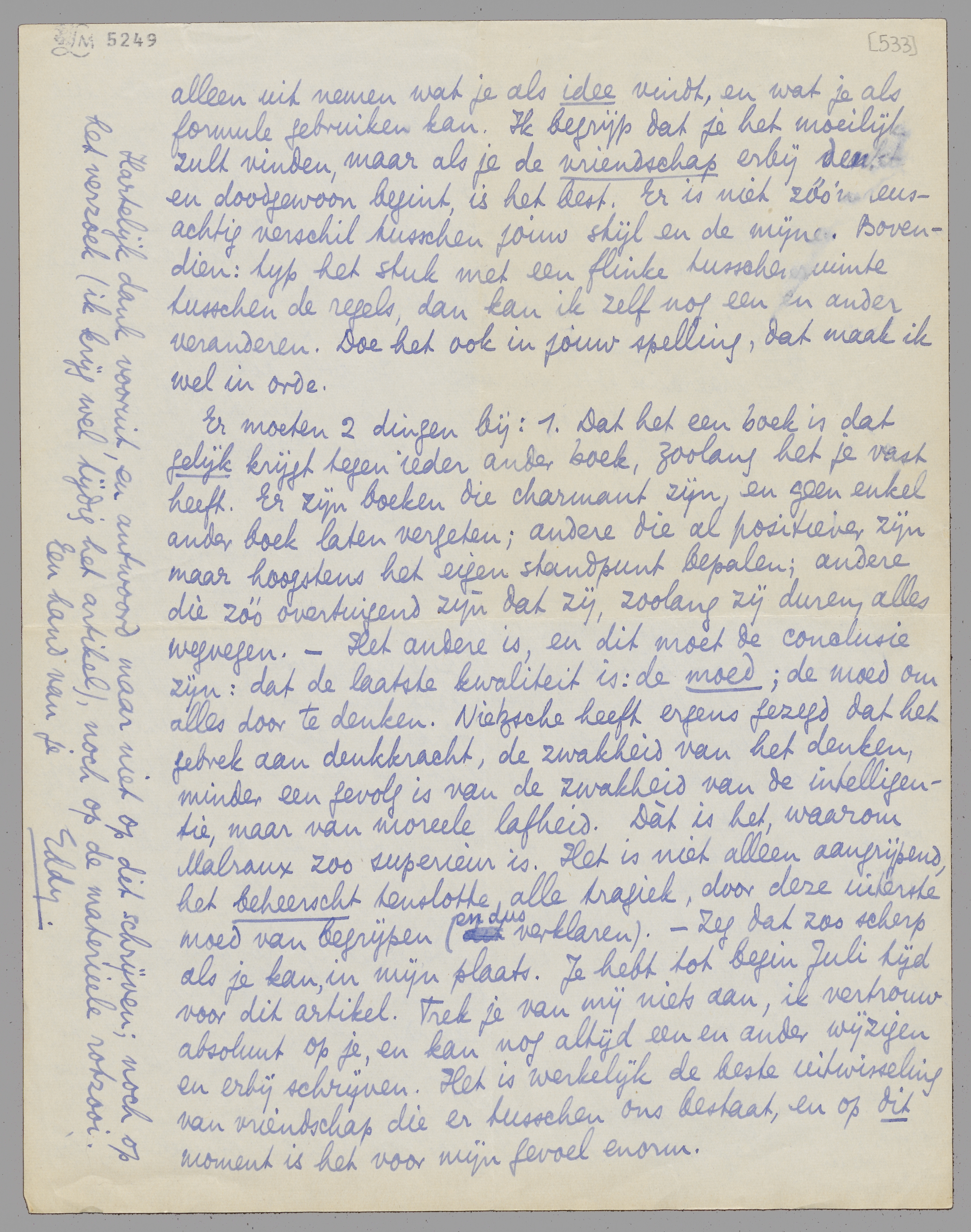 Er moeten 2 dingen bij: 1. Dat het een boek is dat gelijk krijgt tegen ieder ander boek, zoolang het je vast heeft. Er zijn boeken die charmant zijn, en geen enkel ander boek laten vergeten; andere die al positiever zijn maar hoogstens het eigen standpunt bepalen; andere die zóó overtuigend zijn dat zij, zoolang zij duren, alles wegvegen. - Het andere is, en dit moet de conclusie zijn: dat de laatste kwaliteit is: de moed; de moed om alles door te denken. Nietzsche heeft ergens gezegd dat het gebrek aan denkkracht, de zwakheid van het denken, minder een gevolg is van de zwakheid van de intelligentie, maar van moreele lafheid. Dàt is het, waarom Malraux zoo superieur is. Het is niet alleen aangrijpend, het beheerscht tenslotte alle tragiek, door deze uiterste moed van begrijpen (en dus verklaren). - Zeg dat zoo scherp als je kan, in mijn plaats. Je hebt tot begin Juli tijd voor dit artikel. Trek je van mij niets aan, ik vertrouw absoluut op je, en kan nog altijd een en ander wijzigen en erbij schrijven. Het is werkelijk de beste uitwisseling van vriendschap die er tusschen ons bestaat, en op dit moment is het voor mijn gevoel enorm.
