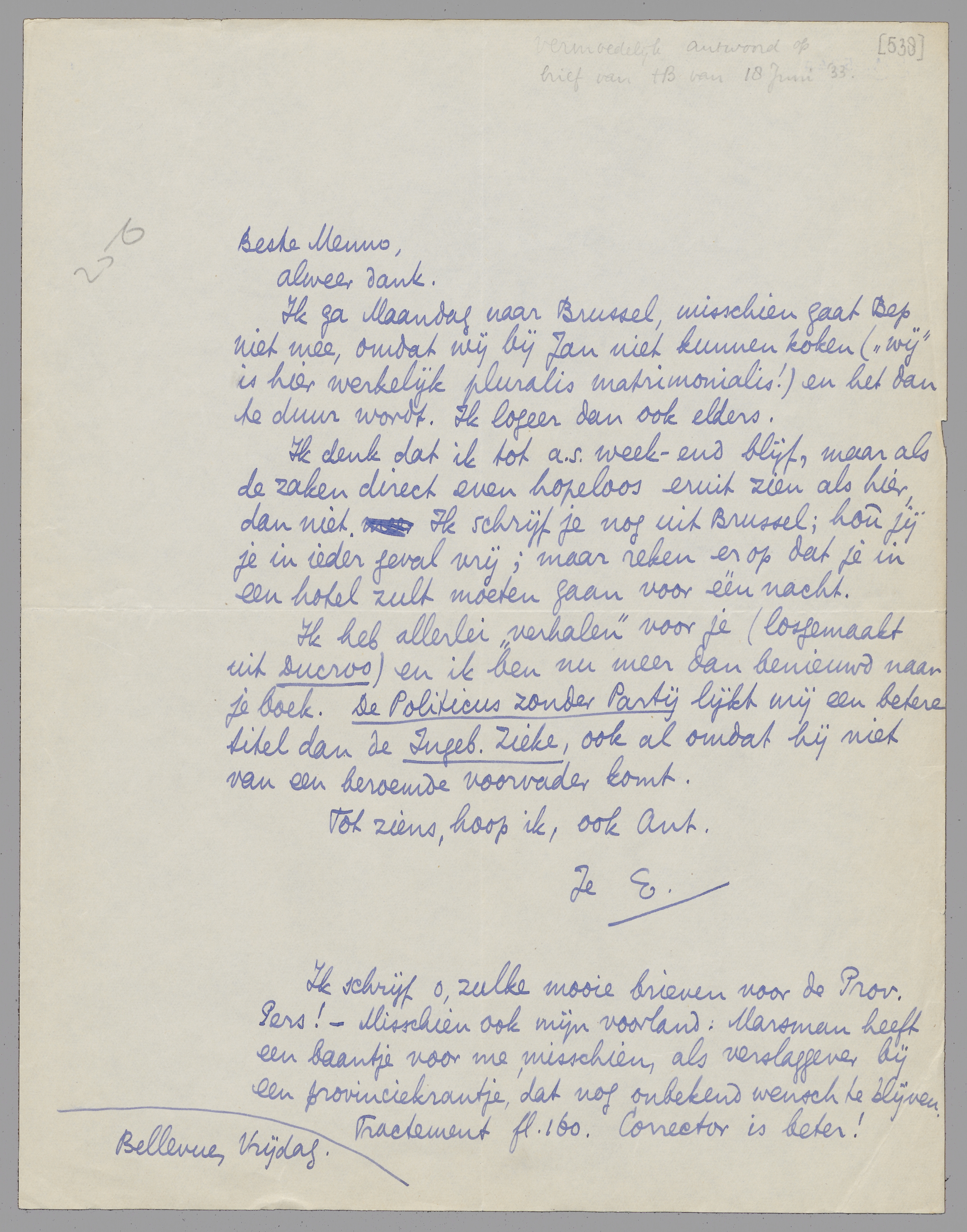 Ik ga Maandag naar Brussel, misschien gaat Bep niet mee, omdat wij bij Jan niet kunnen koken (‘wij’ is hier werkelijk pluralis matrimonialis!) en het dan te duur wordt. Ik logeer dan ook elders.