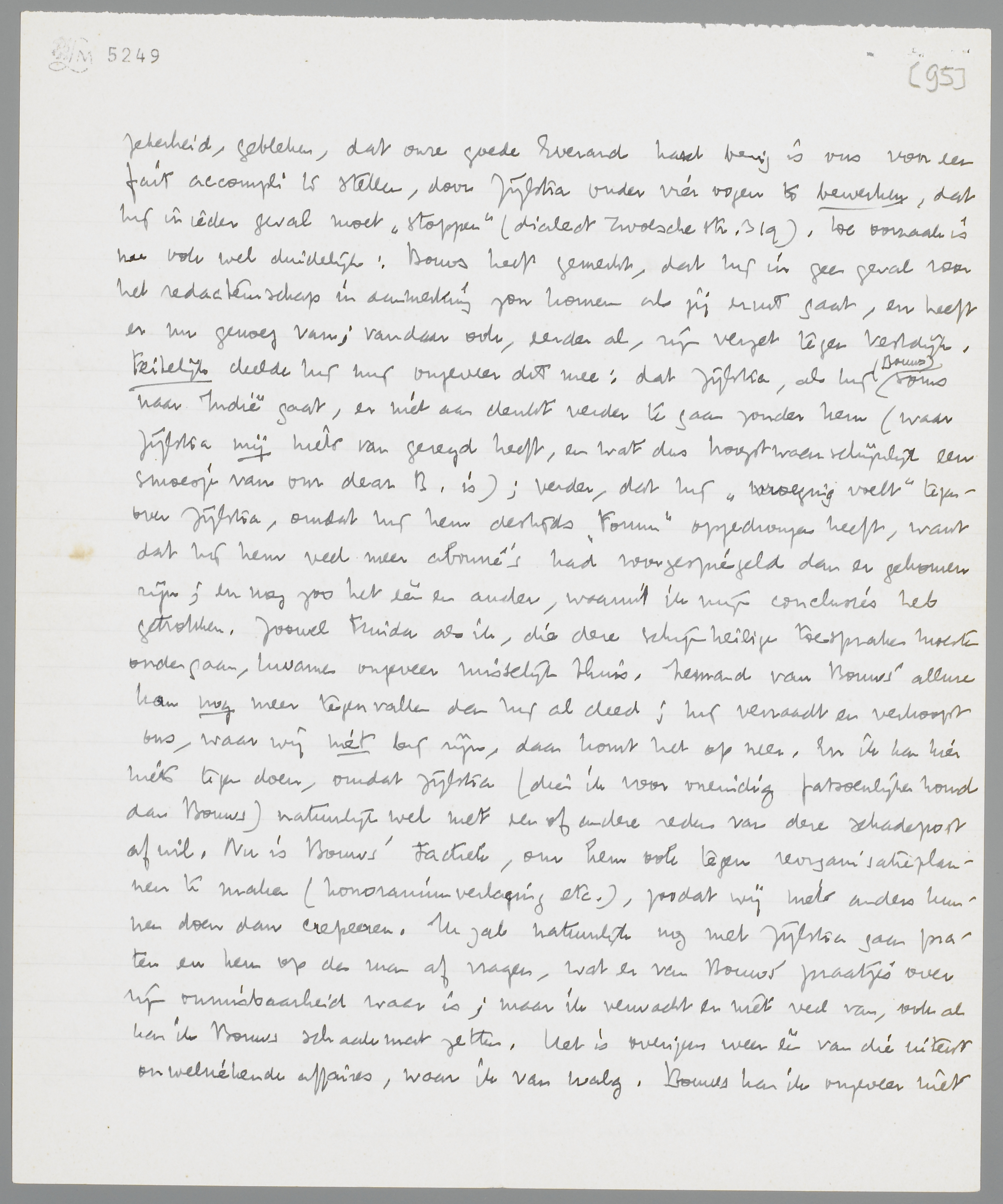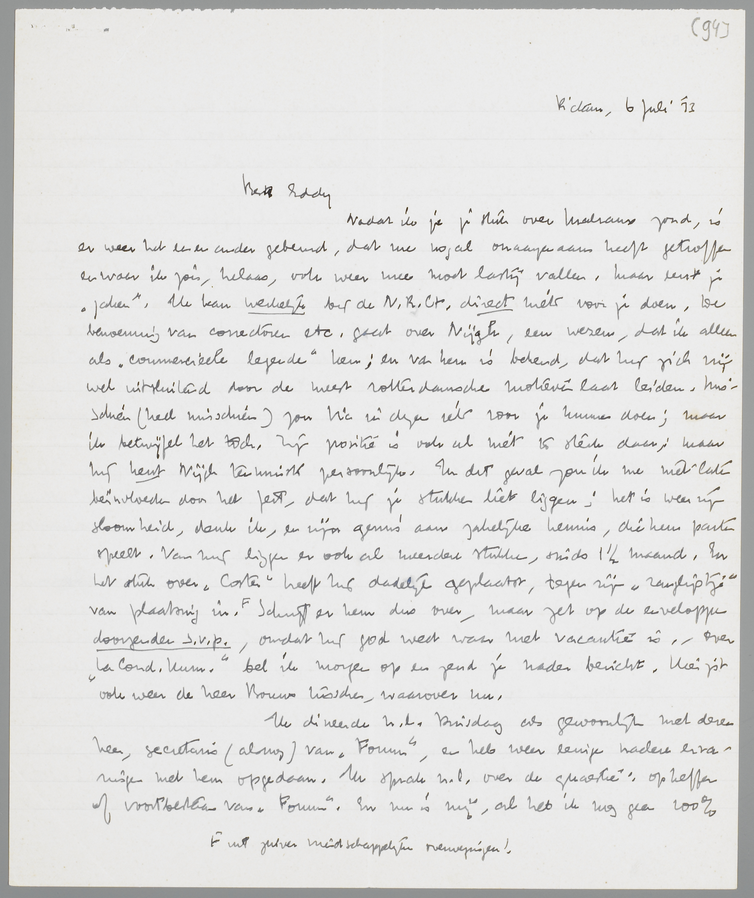 Ik dineerde n.l. Dinsdag als gewoonlijk met dezen heer, secretaris (alsnog) van Forum, en heb weer eenige nadere ervaringen met hem opgedaan. Ik sprak n.l. over de quaestie: opheffen of voortbestaan van Forum. En nu is mij, al heb ik nog geen 100% zekerheid, gebleken, dat onze goede Everhard hard bezig is ons voor een fait accompli te stellen, door Zijlstra onder vier oogen te bewerken, dat hij in ieder geval moet ‘stoppen’ (dialect Zwolschestr. 319). De oorzaak is nu ook wel duidelijk: Bouws heeft gemerkt, dat hij in geen geval voor het redacteurschap in aanmerking zou komen als jij eruit gaat, en heeft er nu genoeg van; vandaar ook, eerder al, zijn verzet tegen Vestdijk. Feitelijk deelde hij mij ongeveer dit mee: dat Zijlstra, als hij (Bouws) soms naar Indië gaat, er niet aan denkt verder te gaan zonder hem (waar Zijlstra mij niets van gezegd heeft, en wat dus hoogstwaarschijnlijk een smoesje van our dear B. is); verder, dat hij ‘wroeging voelt’ tegenover Zijlstra, omdat hij hem destijds Forum opgedrongen heeft, want dat hij hem veel meer abonné's had voorgespiegeld dan er gekomen zijn; en nog zoo het één en ander, waaruit ik mijn conclusies heb getrokken. Zoowel Truida als ik, die deze schijnheilige toespraken moesten ondergaan, kwamen ongeveer misselijk thuis. Iemand van Bouws allure kan nog meer tegenvallen dan hij al deed; hij verraadt en verkoopt ons, waar wij niet bij zijn, daar komt het op neer. En ik kan hier niets tegen doen, omdat Zijlstra (dien ik voor oneindig fatsoenlijker houd dan Bouws) natuurlijk wel met een of andere reden van deze schadepost af wil. Nu is Bouws tactiek, om hem ook tegen reorganisatieplannen te maken (honorarium verlaging etc.), zoodat wij niets anders kunnen doen dan crepeeren. Ik zal natuurlijk nog met Zijlstra gaan praten en hem op den man af vragen, wat er van Bouws' praatjes over zijn onmisbaarheid waar is; maar ik verwacht er niet veel van, ook al kan ik Bouws schaakmat zetten. Het is overigens weer één van die uiterst onwelriekende affaires, waar ik van walg. Bouws kan ik ongeveer niet meer zien. Maar bewijs me één vriendendienst en laat niets aan Bouws merken in je brieven voor ik absolute zekerheid heb, anders loopen we kans, dat de bom nog meer verkeerd springt. Ik wil in ieder geval van Zijlstra de verklaring hebben, dat hij onafhankelijk van Bouws de quaestie met ons zal behandelen.