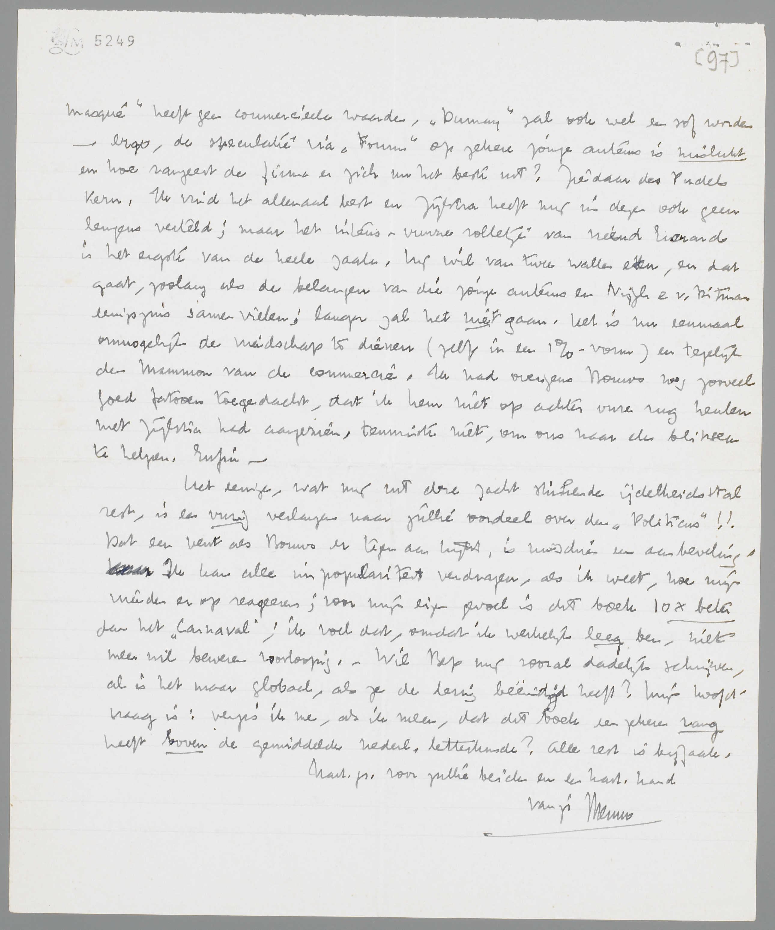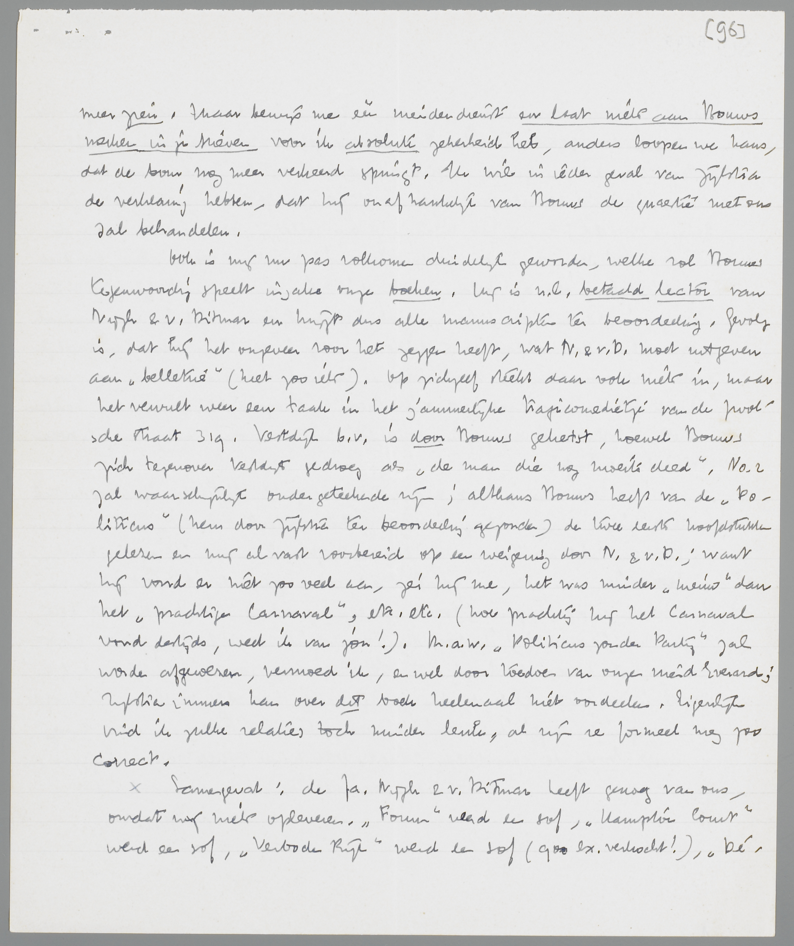 Het eenige, wat mij uit deze zacht stinkende ijdelheidsstal rest, is een vurig verlangen naar jullie oordeel over den Politicus!! Dat een vent als Bouws er tegen aan kijkt, is misschien een aanbeveling. Ik kan alle impopulariteit verdragen, als ik weet, hoe mijn vrienden er op reageeren; voor mijn eigen gevoel is dit boek 10 × beter dan het Carnaval; ik voel dat, omdat ik werkelijk leeg ben, niet meer wil beweren voorloopig. - Wil Bep mij vooral dadelijk schrijven, al is het maar globaal, als ze de lezing beëindigd heeft? Mijn hoofdvraag is: vergis ik me, als ik meen, dat dit boek een zekere rang heeft boven de gemiddelde nederl. letterkunde? Alle rest is bijzaak.