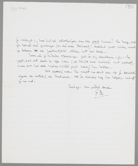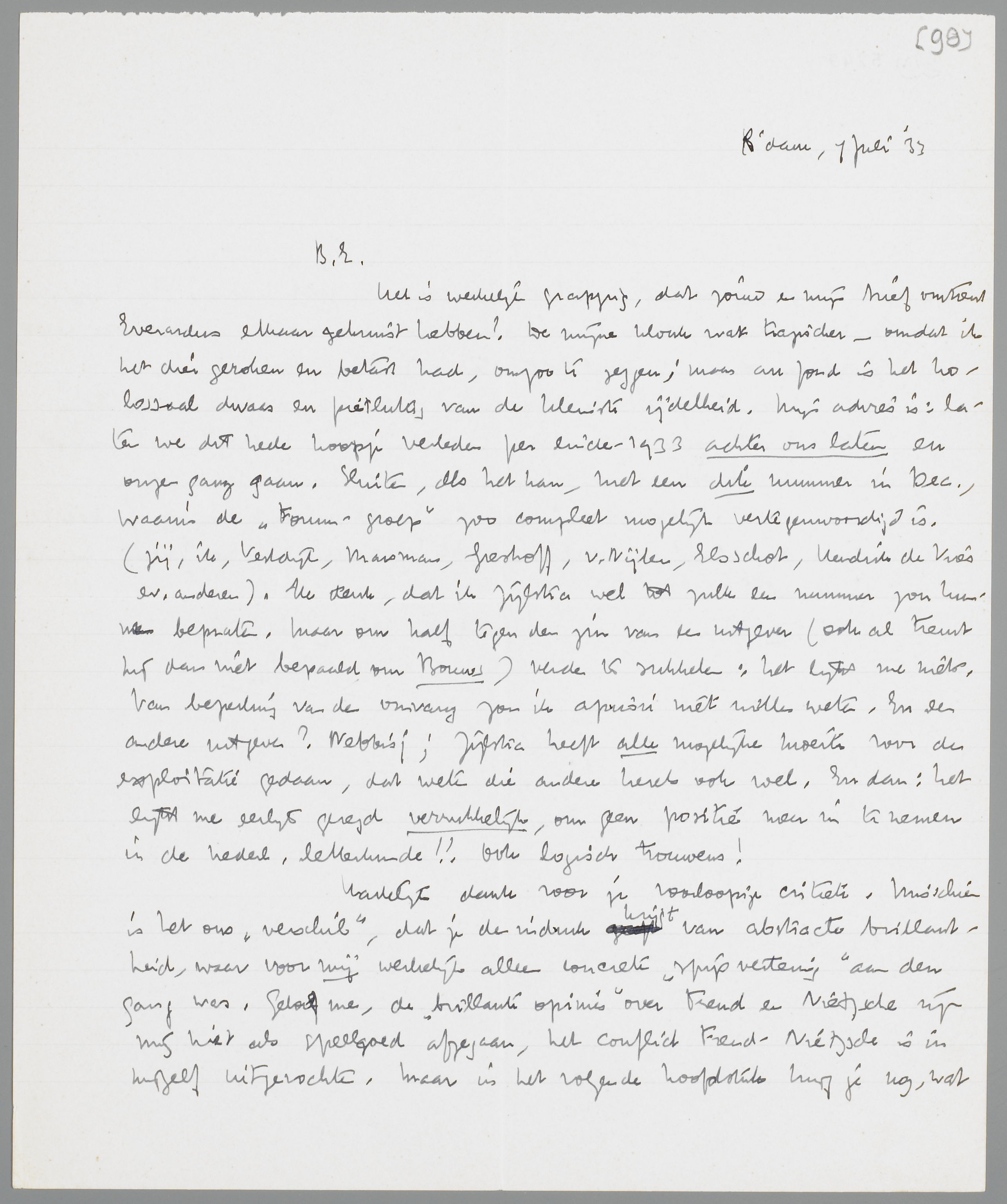 Hartelijk dank voor je voorloopige critiek. Misschien is het ons ‘verschil’, dat je den indruk krijgt van abstracte brillantheid, waar voor mij werkelijk alleen concrete ‘spijsvertering’ aan den gang was. Geloof mij, de ‘brillante opinies’ over Freud en Nietzsche zijn me niet als speelgoed afgegaan, het conflict Freud - Nietzsche is in mijzelf uitgevochten. Maar in het volgende hoofdstuk krijg je nog, wat je verlangt: ‘hoe hij als schooljongen aan den geest kwam’. Ik hoop, dat je vooral die passages (en die over Reinaert) boeiend zult vinden, want ze behooren tot de persoonlijkste stukken uit het boek.
