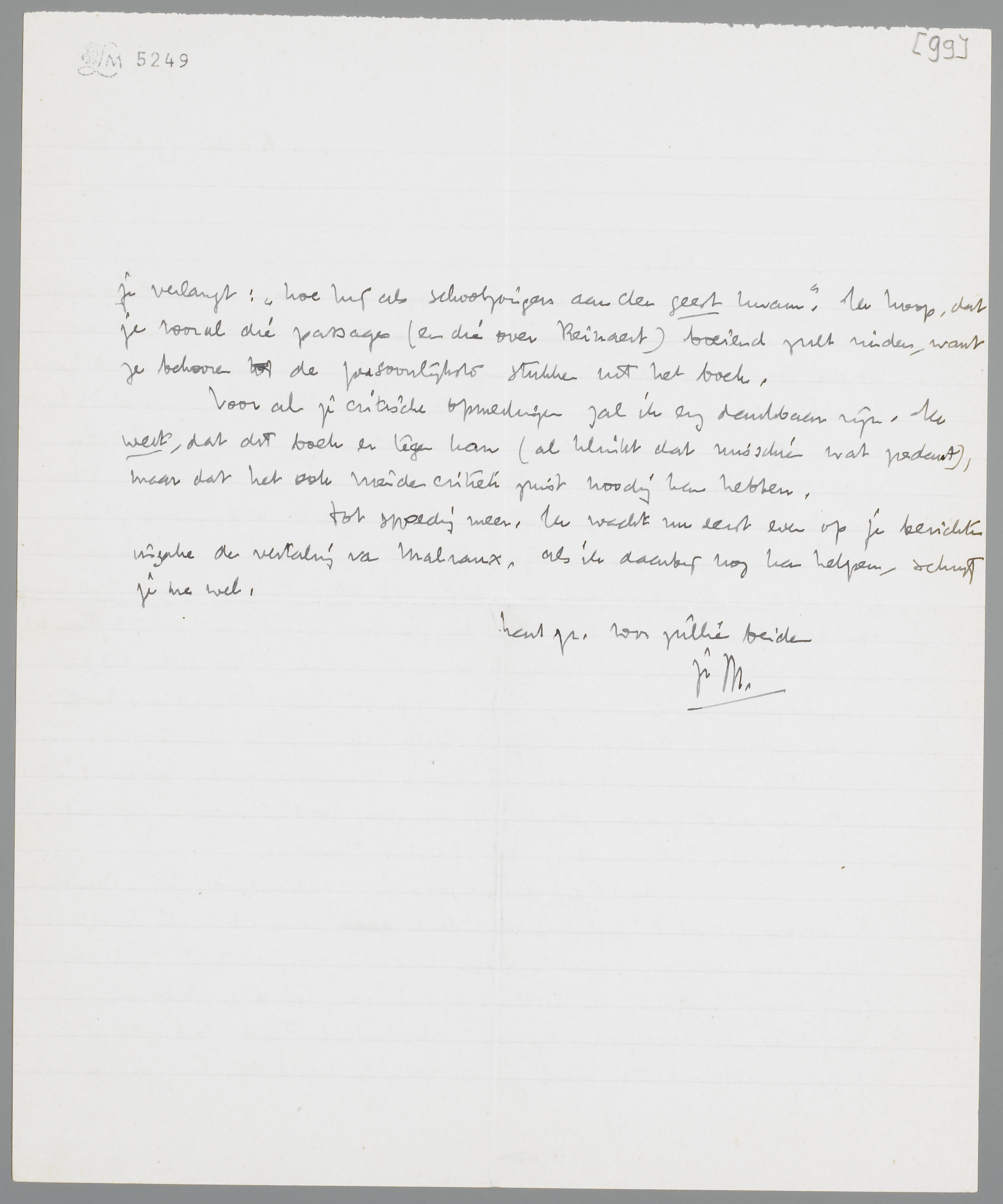 Voor al je critische opmerkingen zal ik erg dankbaar zijn. Ik weet, dat dit boek er tegen kan (al klinkt dat misschien wat pedant), maar dat het ook vriendencritiek juist nodig kan hebben. Tot spoedig meer. Ik wacht nu eerst even op je berichten inzake de vertaling van Malraux, als ik daarbij nog kan helpen, schrijf je me wel.