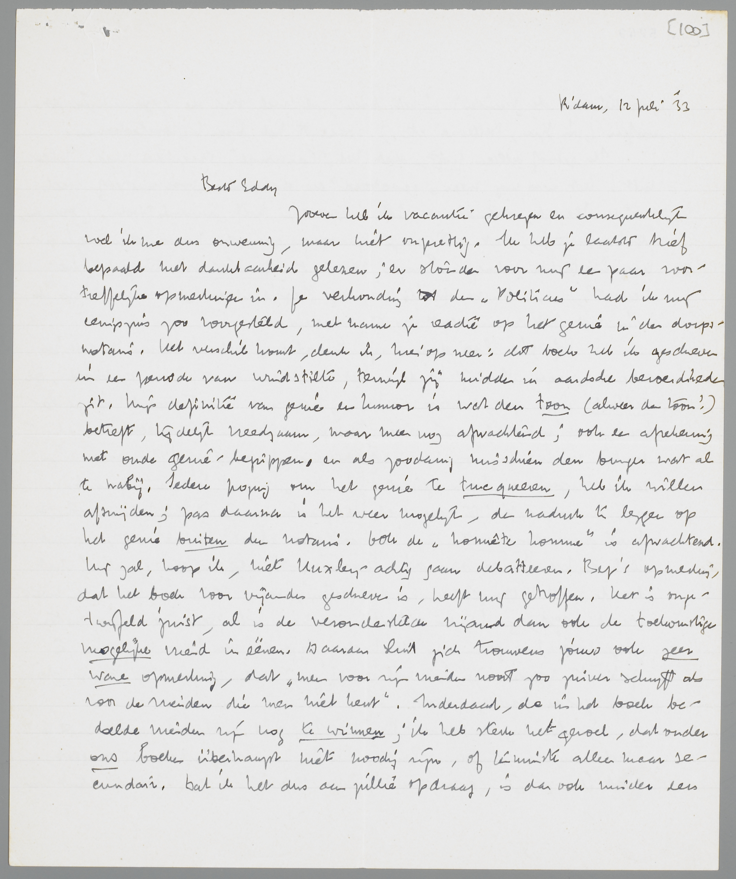 Zooeven heb ik vacantie gekregen en consequentelijk voel ik me dus onwennig, maar niet onprettig. Ik heb je laatste brief bepaald met dankbaarheid gelezen; er stonden voor mij een paar voortreffelijke opmerkingen in. Je verhouding tot den Politicus had ik mij eenigszins zoo voorgesteld, met name je reactie op het genie in den dorpsnotaris. Het verschil komt, denk ik, hierop neer: dit boek heb ik geschreven in een periode van windstilte, terwijl jij midden in aardsche beroerdheden zit. Mijn definitie van genie en humor is wat den toon (alweer den toon!) betreft, tijdelijk vreedzaam, maar meer nog afwachtend; ook een afrekening met oude genie-begrippen, en als zoodanig misschien den burger wat al te nabij. Iedere poging om het genie te trucqueeren, heb ik willen afsnijden: pas daarna is het weer mogelijk, den nadruk te leggen op het genie buiten den notaris. Ook de ‘honnête homme’ is afwachtend. Hij zal, hoop ik, niet Huxley-achtig gaan debatteeren. Bep's opmerking, dat het boek voor vijanden geschreven is, heeft mij getroffen. Het is ongetwijfeld juist, al is de veronderstelde vijand dan ook de toekomstige mogelijke vriend in éénen. Daaraan sluit zich trouwens jouw ook zeer ware opmerking, dat ‘men voor zijn vrienden nooit zoo zuiver schrijft als voor de vrienden die men niet kent’. Inderdaad, de in het boek bedoelde vrienden zijn nog te winnen; ik heb sterk het gevoel, dat onder ons boeken überhaupt niet noodig zijn, of tenminste alleen maar secundair. Dat ik het dus aan jullie opdraag, is dan ook minder een quaestie van de ‘vrienden’ in het boek, als wel van de gezamenlijke atmosfeer (in Spa, Bellevue etc.), waaruit het boek is voortgekomen.