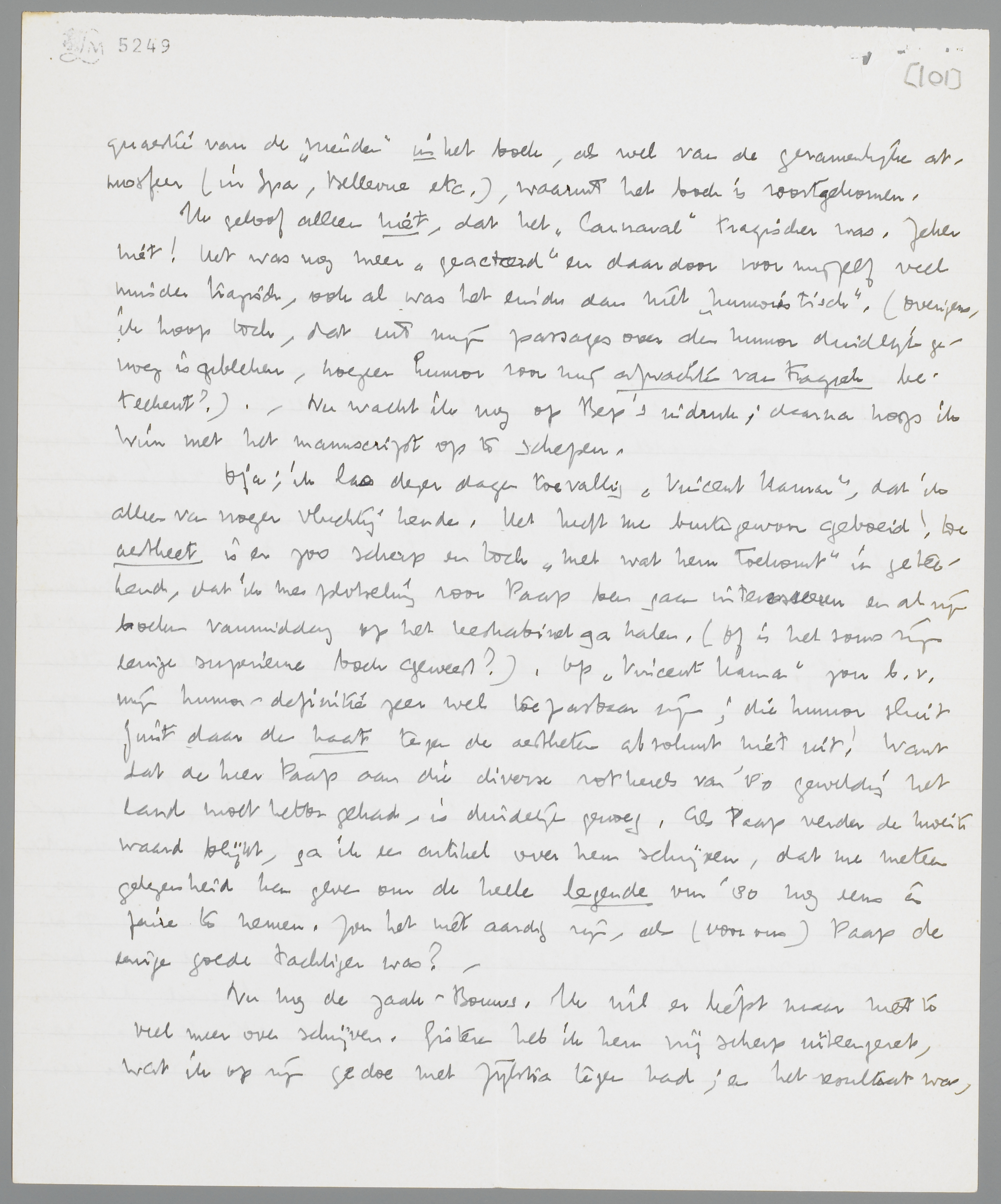 Oja; ik las dezer dagen toevallig Vincent Haman, dat ik alleen van vroeger vluchtig kende. Het heeft me buitengewoon geboeid! De aestheet is er zoo scherp en toch ‘met wat hem toekomt’ in geteekend, dat ik me plotseling voor Paap ben gaan interesseeren en al zijn boeken vanmiddag op het leeskabinet ga halen. (Of is het soms zijn eenige superieure boek geweest?). Op Vincent Haman zou b.v. mijn humor-definitie zeer wel toepasbaar zijn; die humor sluit juist daar de haat tegen de aestheten absoluut niet uit! Want dat de heer Paap aan die diverse rotkerels van '80 geweldig het land moet hebben gehad, is duidelijk genoeg. Als Paap verder de moeite waard blijkt, ga ik een artikel over hem schrijven, dat me meteen gelegenheid kan geven om de heele legende van '80 nog eens à faire te nemen. Zou het niet aardig zijn, als (voor ons) Paap de eenige goede tachtiger was? -