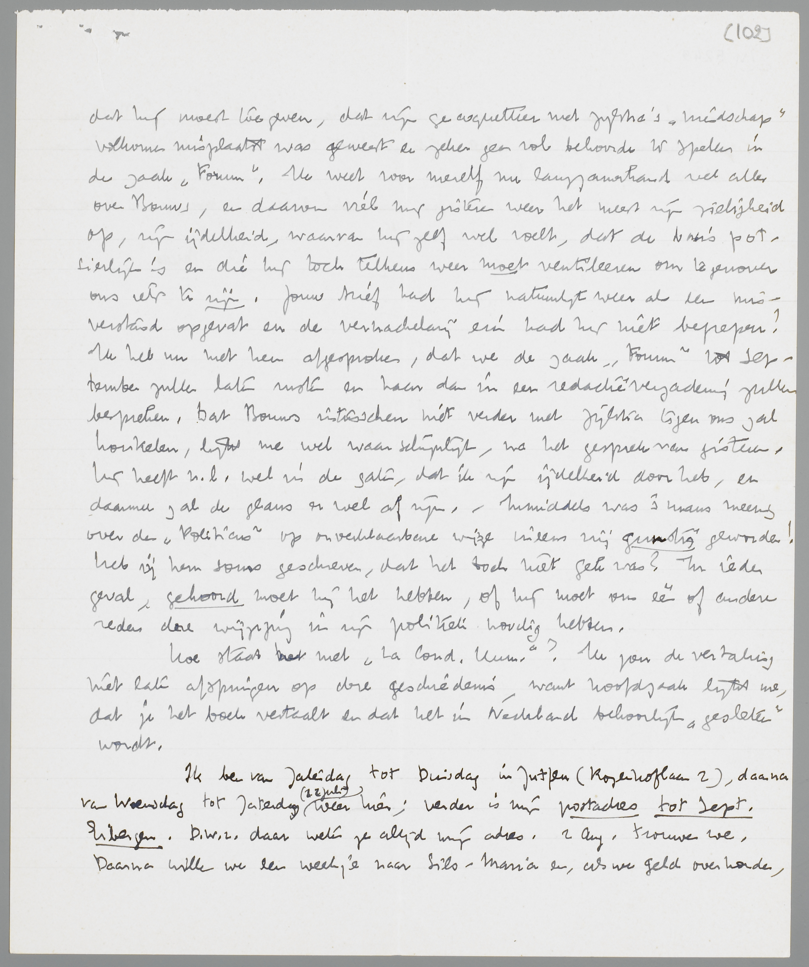 Nu nog de zaak-Bouws. Ik wil er liefst maar niet te veel meer over schrijven. Gisteren heb ik hem vrij scherp uiteengezet, wat ik op zijn gedoe met Zijlstra tegen had; en het resultaat was, dat hij moest toegeven, dat zijn gecoquetteer met Zijlstra's ‘vriendschap’ volkomen misplaatst was geweest en zeker geen rol behoorde te spelen in de zaak Forum. Ik weet voor mezelf nu langzamerhand wel alles over Bouws, en daarom viel mij gisteren weer het meest zijn zieligheid op, zijn ijdelheid, waarvan hij zelf wel voelt, dat de basis potsierlijk is en die hij toch telkens weer moet ventileeren om tegenover ons iets te zijn. Jouw brief had hij natuurlijk weer als een misverstand opgevat en de vernachelerij erin had hij niet begrepen! Ik heb nu met hem afgesproken, dat we de zaak Forum tot September zullen laten rusten en haar dan in een redactievergadering zullen bespreken. Dat Bouws intusschen niet verder met Zijlstra tegen ons zal konkelen, lijkt me wel waarschijnlijk, na het gesprek van gisteren. Hij heeft n.l. wel in de gaten, dat ik zijn ijdelheid door heb, en daarmee zal de glans er wel af zijn. - Inmiddels was 's mans meening over den Politicus op onverklaarbare wijze ineens vrij gunstig geworden! Heb jij hem soms geschreven, dat het toch niet gek was? In ieder geval, gehoord moet hij het hebben, of hij moet om één of andere reden deze wijziging in zijn politiek noodig hebben.