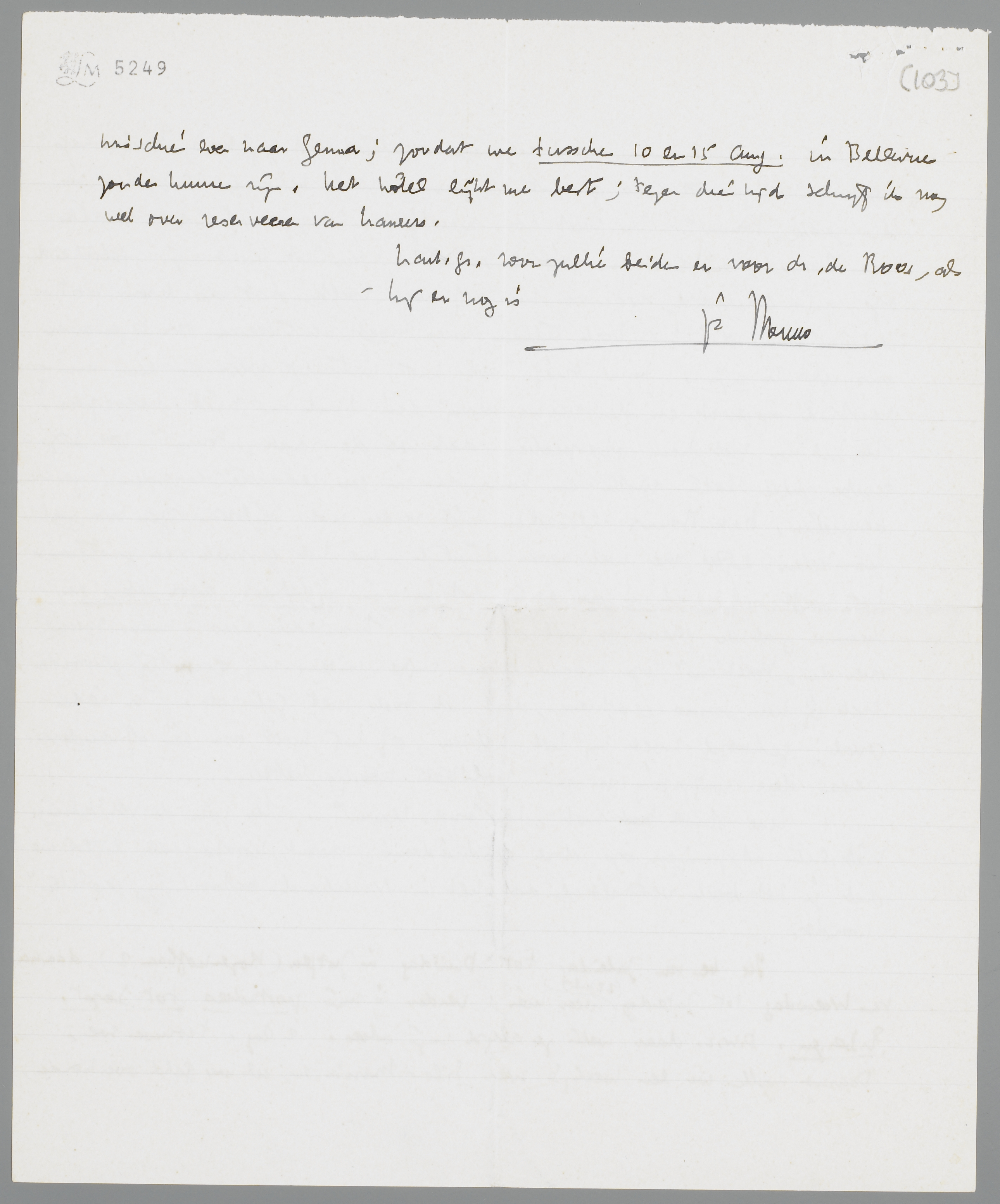 Ik ben van Zaterdag tot Dinsdag in Zutfen (Rozenhoflaan 2), daarna van Woensdag tot Zaterdag 22 Juli weer hier; verder is mijn postadres tot Sept. Eibergen. D.w.z. daar weten ze altijd mijn adres. 2 Aug. trouwen we. Daarna willen we een weekje naar Sils-Maria en, als we geld overhouden, misschien even naar Genua; zoodat we tusschen 10 en 15 Aug. in Bellevue zouden kunnen zijn. Het hotel lijkt me best; tegen die tijd schrijf ik nog wel over reserveeren van kamers. hart. gr. voor jullie beiden en voor dr. de Roos, als hij er nog is je