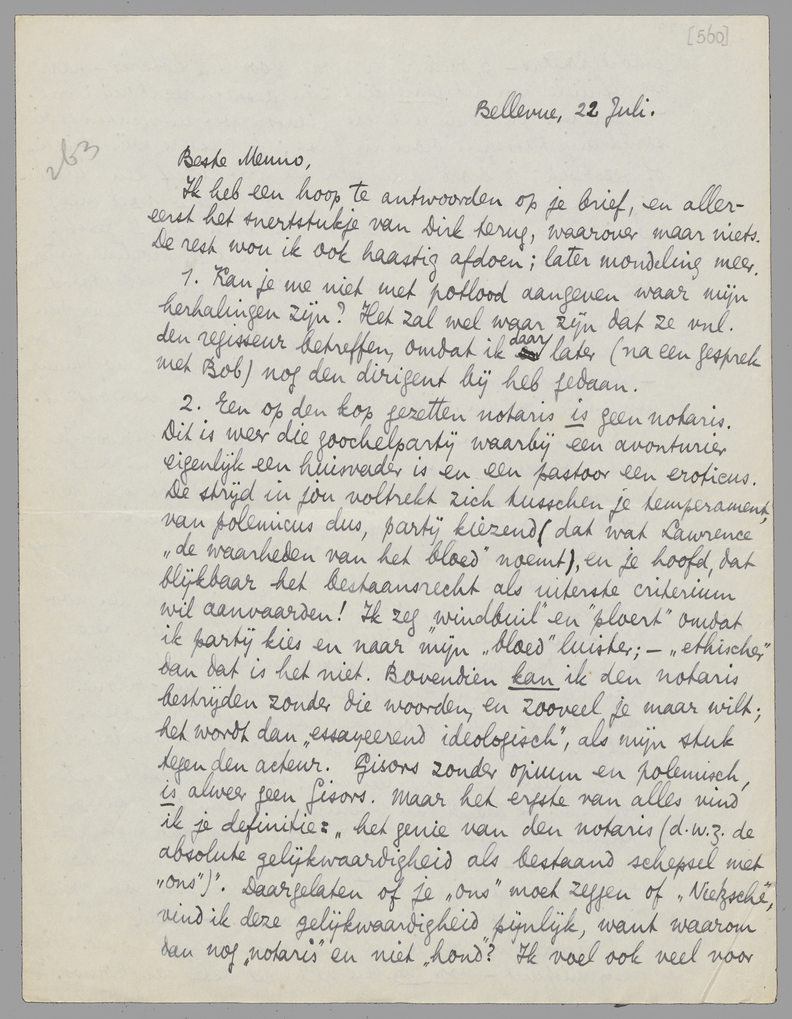 2. Een op den kop gezetten notaris is geen notaris. Dit is weer die goochelpartij waarbij een avonturier eigenlijk een huisvader is en een pastoor een eroticus. De strijd in jou voltrekt zich tusschen je temperament, van polemicus dus, partij kiezend (dat wat Lawrence ‘de waarheden van het bloed’ noemt), en je hoofd, dat blijkbaar het bestaansrecht als uiterste criterium wil aanvaarden! Ik zeg ‘windbuil’ en ‘ploert’ omdat ik partij kies en naar mijn ‘bloed’ luister; - ‘ethischer’ dan dat is het niet. Bovendien kan ik den notaris bestrijden zonder die woorden, en zooveel je maar wilt; het wordt dan ‘essayeerend ideologisch’, als mijn stuk tegen den acteur. Gisors zonder opium en polemisch, is alweer geen Gisors. Maar het ergste van alles vind ik je definitie: ‘het genie van den notaris (d.w.z. de absolute gelijkwaardigheid als bestaand schepsel met “ons”)’. Daargelaten of je ‘ons’ moet zeggen of ‘Nietzsche’, vind ik deze gelijkwaardigheid pijnlijk, want waarom dan nog ‘notaris’ en niet ‘hond’? Ik voel ook veel voor je hond Loelaps - o, oneindig meer dan voor den notaris - maar als definitie van het genie lijkt zijn bestaansrecht mij zwak. - Nogmaals: wat je in de eerste plaats moet uitvechten is die strijd in je tusschen ‘bloed’ en ‘geest’; je geest is wijs- objectief, of sceptisch; je ‘bloed’ polemisch en wat jijzelf een ‘instinctief verzetsleven’ noemt. Kies je nog (met je bloed mee) partij, of ga je alles (sceptisch!) ‘begrijpen’ met je geest? Dat is de vraag. Kies je partij, dan zal je moeten strijden ook met alle middelen van den geest; zonder de woorden ‘windbuil’ en ‘ploert’ (à la Multatuli), soit - maar dan met al de doeltreffendheid van de ‘ideologie’ (à la Benda). - De kwestie van heroïsme wordt hier alleen nog maar een ander stadium, lijkt mij, en onafhankelijk van onszelf.