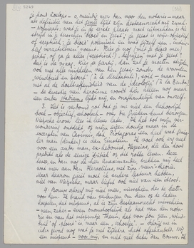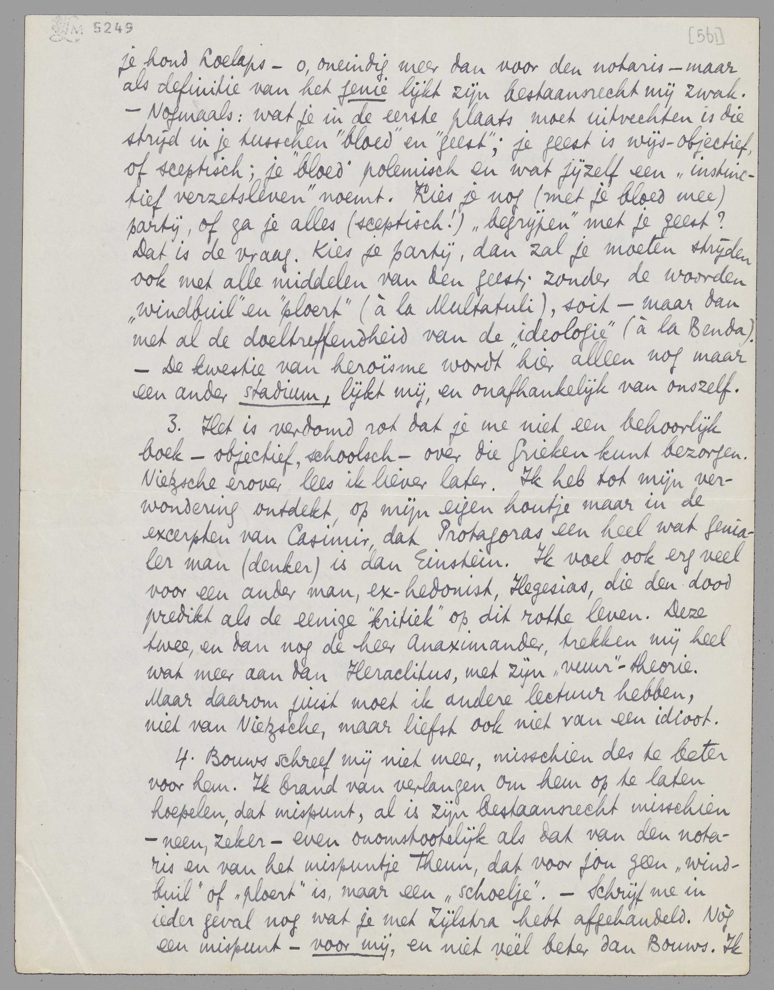3. Het is verdomd rot dat je me niet een behoorlijk boek - objectief, schoolsch - over die Grieken kunt bezorgen. Nietzsche erover lees ik liever later. Ik heb tot mijn verwondering ontdekt, op mijn eigen houtje maar in de excerpten van Casimir, dat Protagoras een heel wat genialer man (denker) is dan Einstein. Ik voel ook erg veel voor een ander man, ex-hedonist, Hegesias, die den dood predikt als de eenige ‘kritiek’ op dit rotte leven. Deze twee, en dan nog de heer Anaximander, trekken mij heel wat meer aan dan Heraclitus, met zijn ‘vuur’-theorie. Maar daarom juist moet ik andere lectuur hebben, niet van Nietzsche, maar liefst ook niet van een idioot.