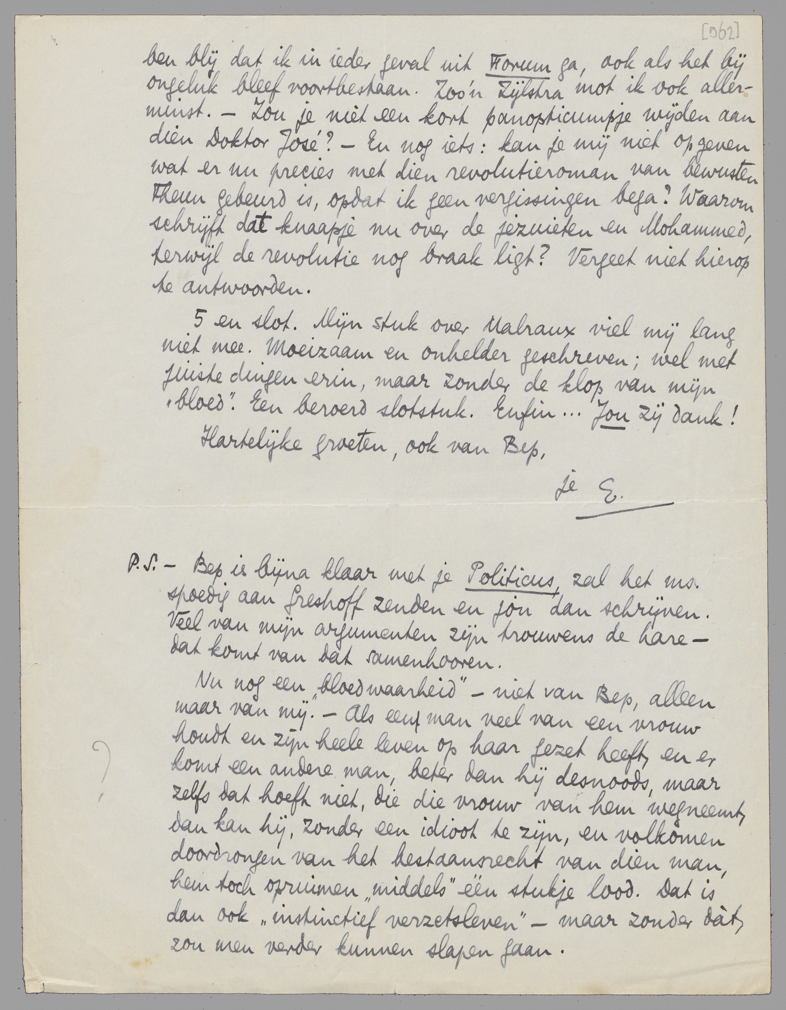 P.S. - Bep is bijna klaar met je Politicus, zal het ms. spoedig aan Greshoff zenden en jou dan schrijven. Veel van mijn argumenten zijn trouwens de hare - dat komt van dat samenhooren.