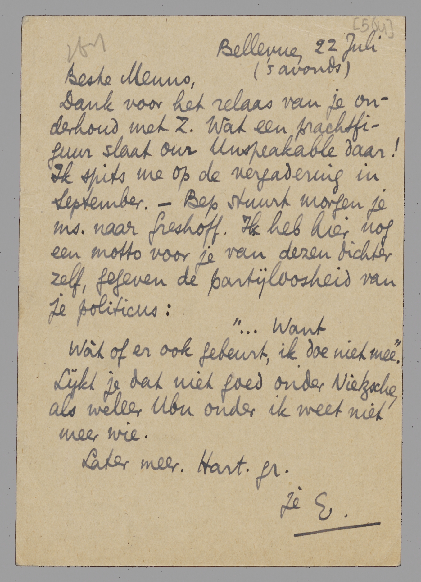 Dank voor het relaas van je onderhoud met Z. Wat een prachtfiguur slaat our Unspeakable daar! Ik spits me op de vergadering in September. - Bep stuurt morgen je ms. naar Greshoff. Ik heb hier nog een motto voor je van dezen dichter zelf, gegeven de partijloosheid van je politicus: