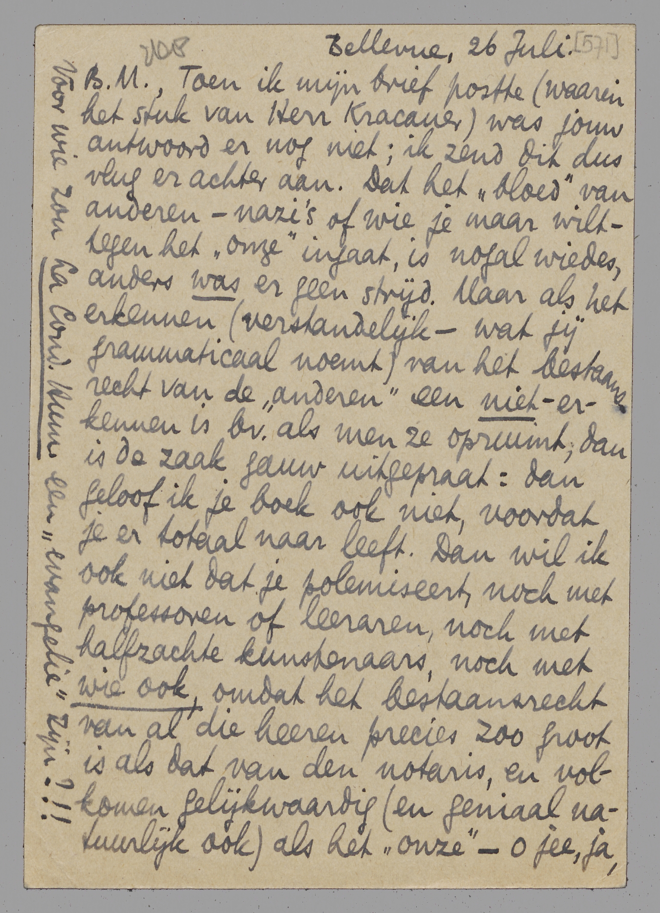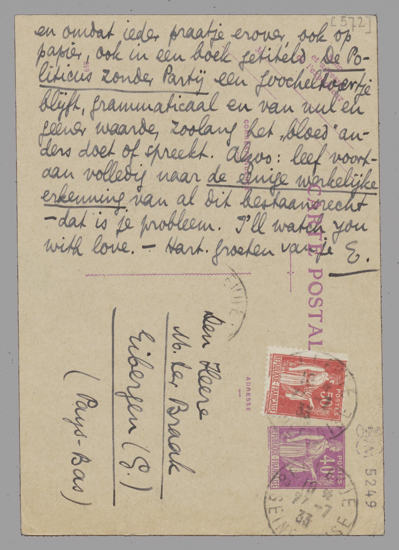 Toen ik mijn brief postte (waarin het stuk van Herr Kracauer) was jouw antwoord er nog niet; ik zend dit dus vlug er achter aan. Dat het ‘bloed’ van anderen - nazi's of wie je maar wilt - tegen het ‘onze’ ingaat, is nogal wiedes, anders was er geen strijd. Maar als het erkennen (verstandelijk - wat jij grammaticaal noemt) van het bestaansrecht van de ‘anderen’ een niet-erkennen is bv. als men ze opruimt, dan is de zaak gauw uitgepraat: dan geloof ik je boek ook niet, voordat je er totaal naar leeft. Dan wil ik ook niet dat je polemiseert, noch met professoren of leeraren, noch met halfzachte kunstenaars, noch met wie ook, omdat het bestaansrecht van al die heeren precies zoo groot is als dat van den notaris, en volkomen gelijkwaardig (en geniaal natuurlijk ook) als het ‘onze’ - o jee, ja, en omdat ieder praatje erover, ook op papier, ook in een boek getiteld De Politicus zonder Partij een goocheltoertje blijft, grammaticaal en van nul en geener waarde, zoolang het ‘bloed’ anders doet of spreekt. Alzoo: leef voortaan volledig naar de eenige werkelijke erkenning van al dit bestaansrecht - dat is je probleem. I'll watch you with love, - Hart. groeten van je