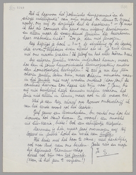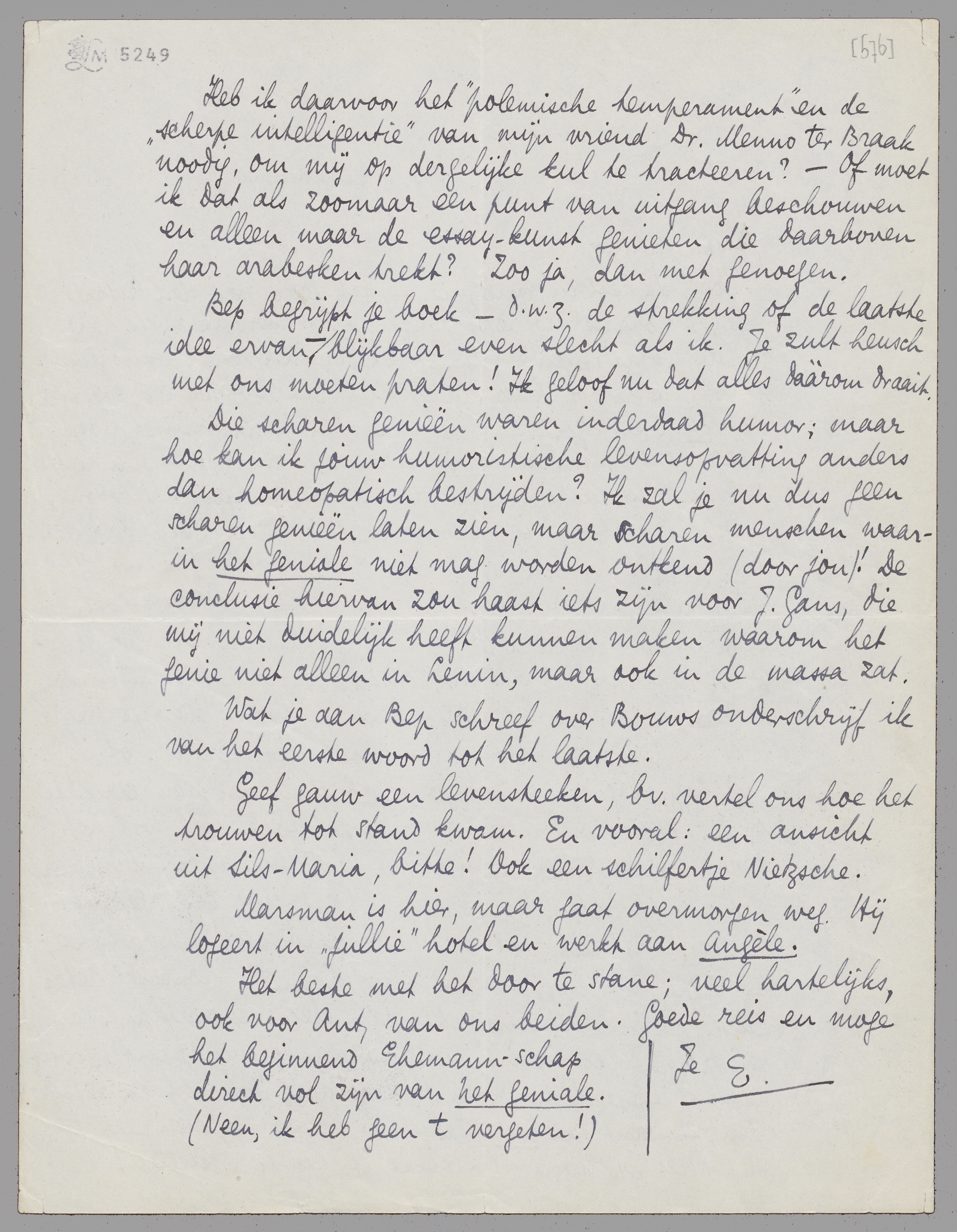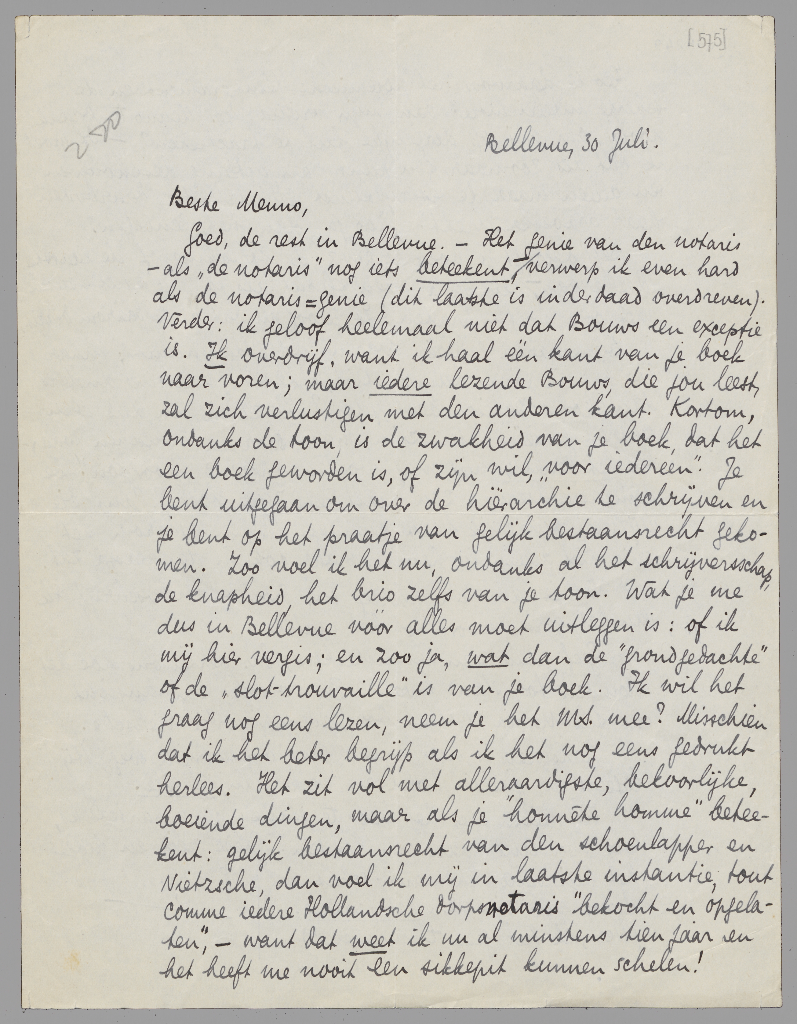 Goed, de rest in Bellevue. - Het genie van den notaris - als ‘de notaris’ nog iets beteekent - verwerp ik even hard als de notaris = genie (dit laatste is inderdaad overdreven). Verder: ik geloof heelemaal niet dat Bouws een exceptie is. Ik overdrijf, want ik haal één kant van je boek naar voren; maar iedere lezende Bouws, die jou leest, zal zich verlustigen met den anderen kant. Kortom, ondanks de toon, is de zwakheid van je boek, dat het een boek geworden is, of zijn wil, ‘voor iedereen’. Je bent uitgegaan om over de hiërarchie te schrijven en je bent op het praatje van gelijk bestaansrecht gekomen. Zoo voel ik het nu, ondanks al het schrijversschap, de knapheid, het brio zelfs van je toon. Wat je me dus in Bellevue vóór alles moet uitleggen is: of ik mij hier vergis: en zoo ja, wat dan de ‘grondgedachte’ of de ‘slot-trouvaille’ is van je boek. Ik wil het graag nogeens lezen, neem je het MS. mee? Misschien dat ik het beter begrijp als ik het nog eens gedrukt herlees. Het zit vol met alleraardigste, bekoorlijke, boeiende dingen, maar als je ‘honnête homme’ beteekent: gelijk bestaansrecht van den schoenlapper en Nietzsche, dan voel ik mij in laatste instantie, tout comme iedere Hollandsche dorpsnotaris ‘bekocht en opgelaten’, - want dat weet ik nu al minstens tien jaar en het heeft me nooit een sikkepit kunnen schelen!