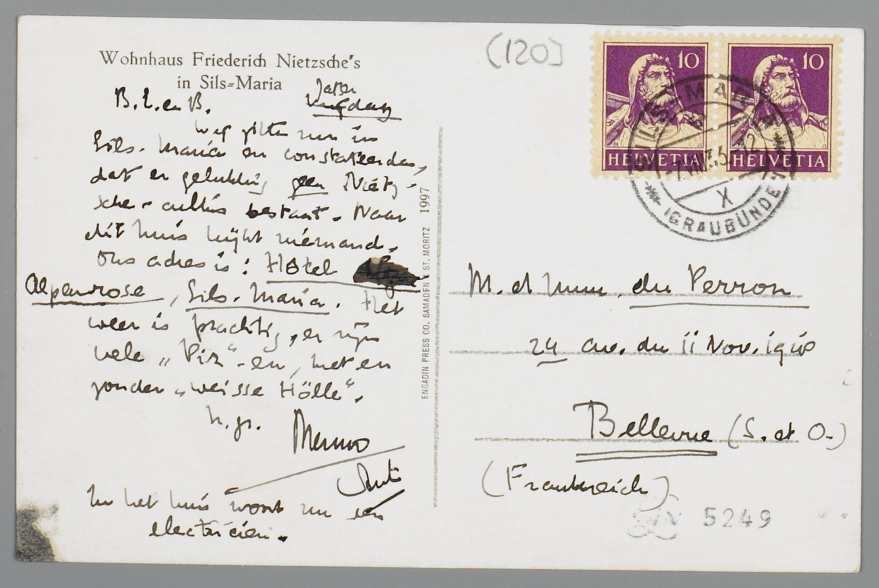 Wij zitten nu in Sils-Maria en constateerden, dat er gelukkig geen Nietzsche-cultus bestaat. Naar dit huis kijkt niemand. Ons adres is: Hôtel Alpenrose, Sils-Maria. Het weer is prachtig, er zijn vele ‘Piz’-en, met en zonder ‘weisse Hölle’. hr. gr.