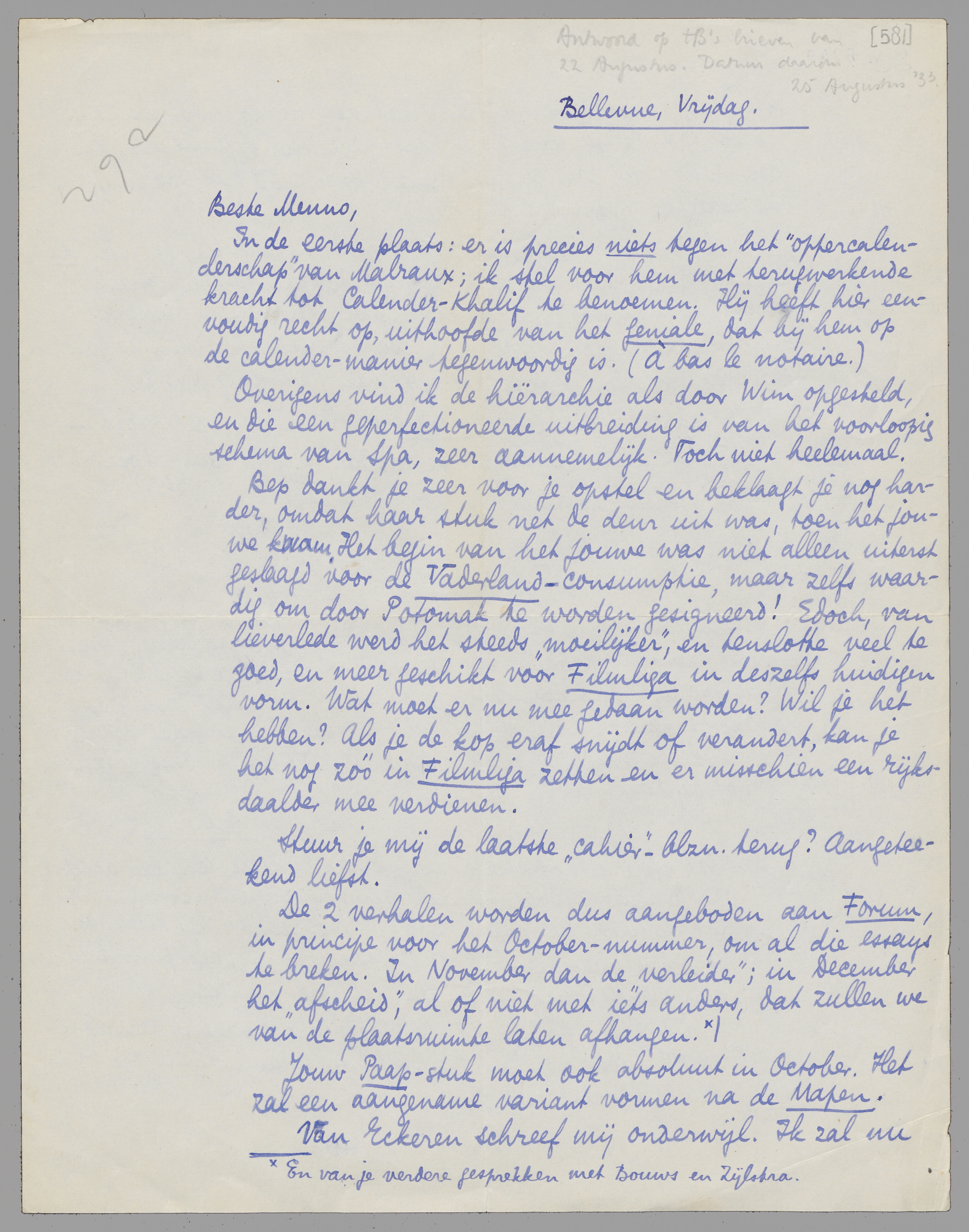 De 2 verhalen worden dus aangeboden aan Forum, in principe voor het October-nummer, om al die essays te breken. In November dan de ‘verleider’; in December het ‘afscheid’, al of niet met iets anders, dat zullen we van de plaatsruimte laten afhangen. En van je verdere gesprekken met Bouws en Zijlstra. Jouw Paap-stuk moet ook absoluut in October. Het zal een aangename variant vormen na de Mapen.