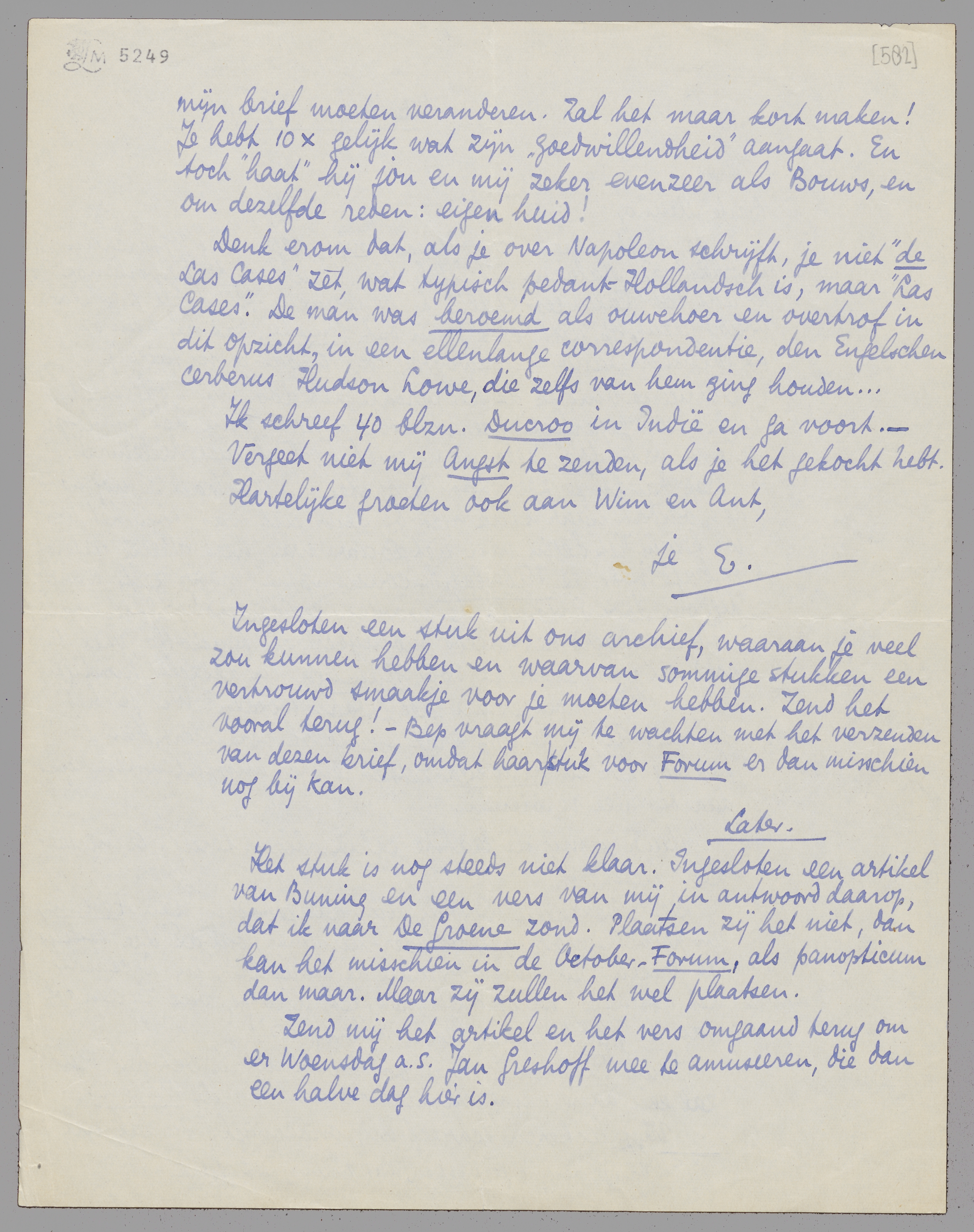 Denk erom dat, als je over Napoleon schrijft, je niet ‘de Las Cases’ zet, wat typisch pedant-Hollandsch is, maar ‘Las Cases’. De man was beroemd als ouwehoer en overtrof in dit opzicht, in een ellenlange correspondentie, den Engelschen cerberus Hudson Lowe, die zelfs van hem ging houden...