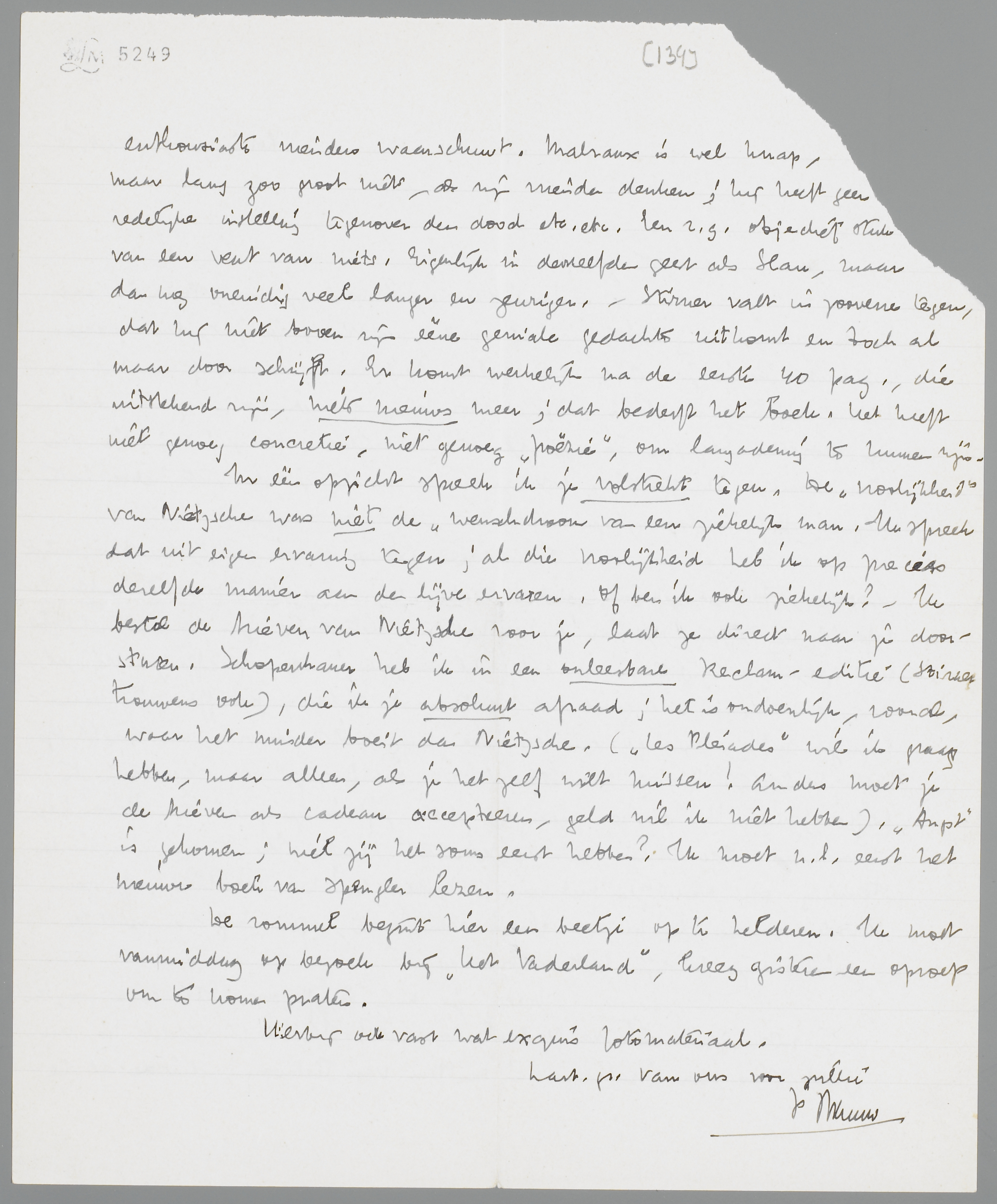 In één opzicht spreek ik je volstrekt tegen. De ‘vroolijkheid’ van Nietzsche was niet de wenschdroom van een ziekelijk man. Ik spreek dat uit eigen ervaring tegen; al die vroolijkheid heb ik op precies dezelfde manier aan den lijve ervaren. Of ben ik ook ziekelijk? - Ik bestel de brieven van Nietzsche voor je, laat ze direct naar je doorsturen. Schopenhauer heb ik in een onleesbare Reclam-editie (Stirner trouwens ook), die ik je absoluut afraad; het is ondoenlijk, vooral, waar het minder boeit dan Nietzsche. (Les Pléiades wil ik graag hebben, maar alleen, als je het zelf wilt missen! Anders moet je de brieven als cadeau accepteeren, geld wil ik niet hebben). Angst is gekomen; wil jij het soms eerst hebben? Ik moet n.l. eerst het nieuwe boek van Spengler lezen.