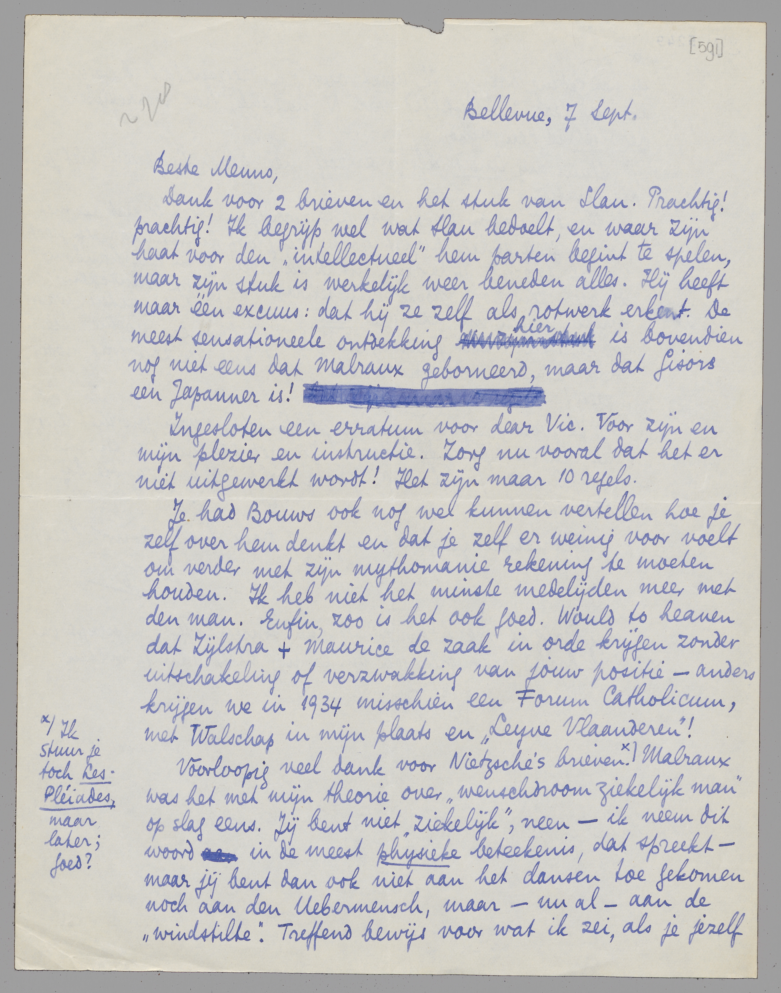 Voorloopig veel dank voor Nietzsche's brieven.* Malraux was het met mijn theorie over ‘wenschdroom ziekelijk man’ op slag eens. Jij bent niet ‘ziekelijk’, neen - ik neem dit woord in de meest physieke beteekenis, dat spreekt - maar jij bent dan ook niet aan het dansen toe gekomen noch aan den Uebermensch, maar - nu al - aan de ‘windstilte’. Treffend bewijs voor wat ik zei, als je jezelf in het geding brengt. Ik moet overigens zeggen dat hoe meer ik over deze ziekelijkheid van N. nadenk, hoe werkelijker heroïsch ik hem vind.
