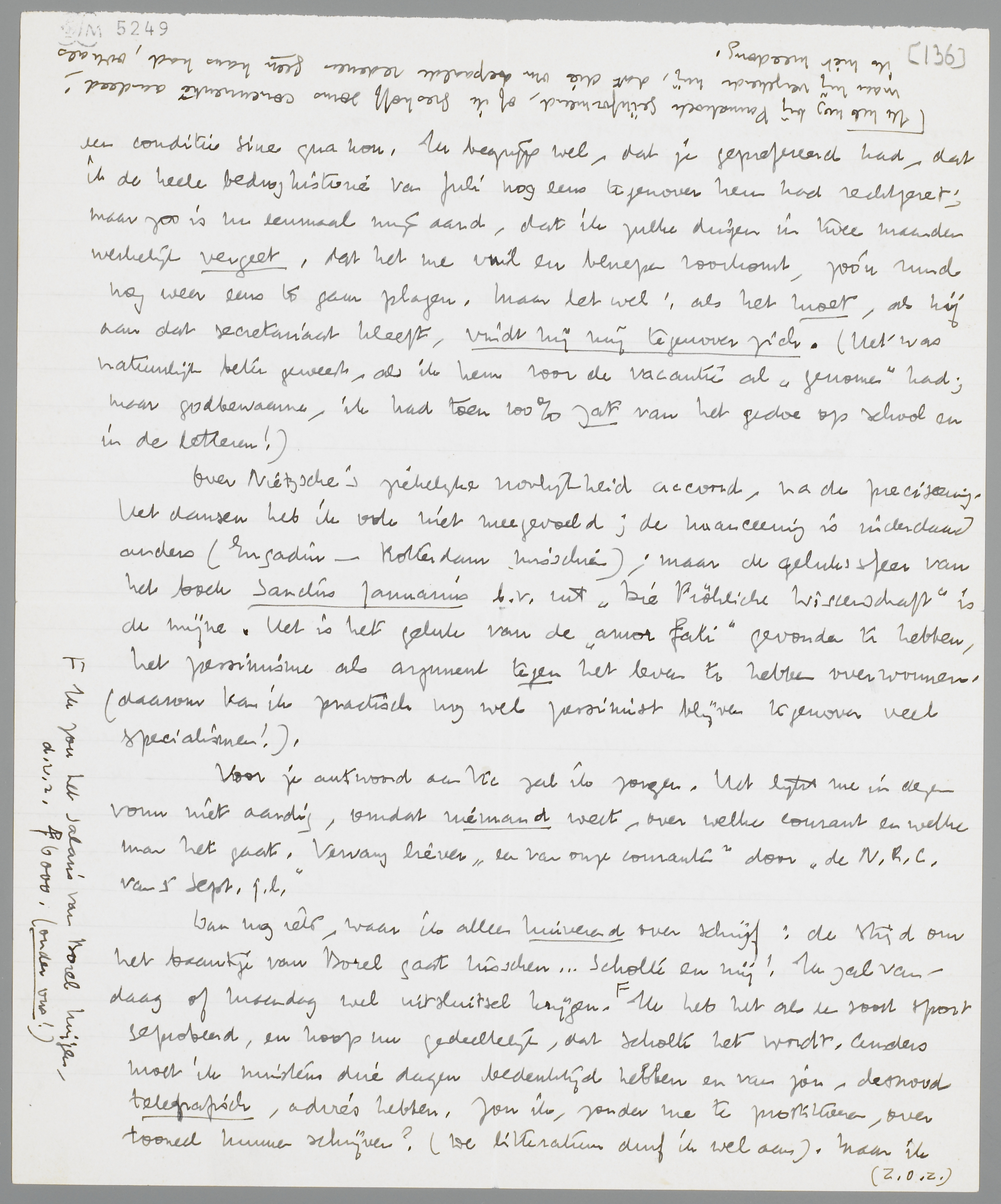 Over Nietzsche's ziekelijke vroolijkheid accoord, na de preciseering. Het dansen heb ik ook niet meegevoeld; de nuanceering is inderdaad anders (Engadin - Rotterdam misschien); maar de geluksfeer van het boek Sanctus Januarius b.v. uit Die Fröhliche Wissenschaft is de mijne. Het is het geluk van de ‘amor fati’ gevonden te hebben, het pessimisme als argument tegen het leven te hebben overwonnen. (daarom kan ik practisch nog wel pessimist blijven tegenover veel specialismen!).