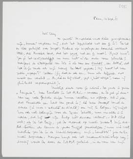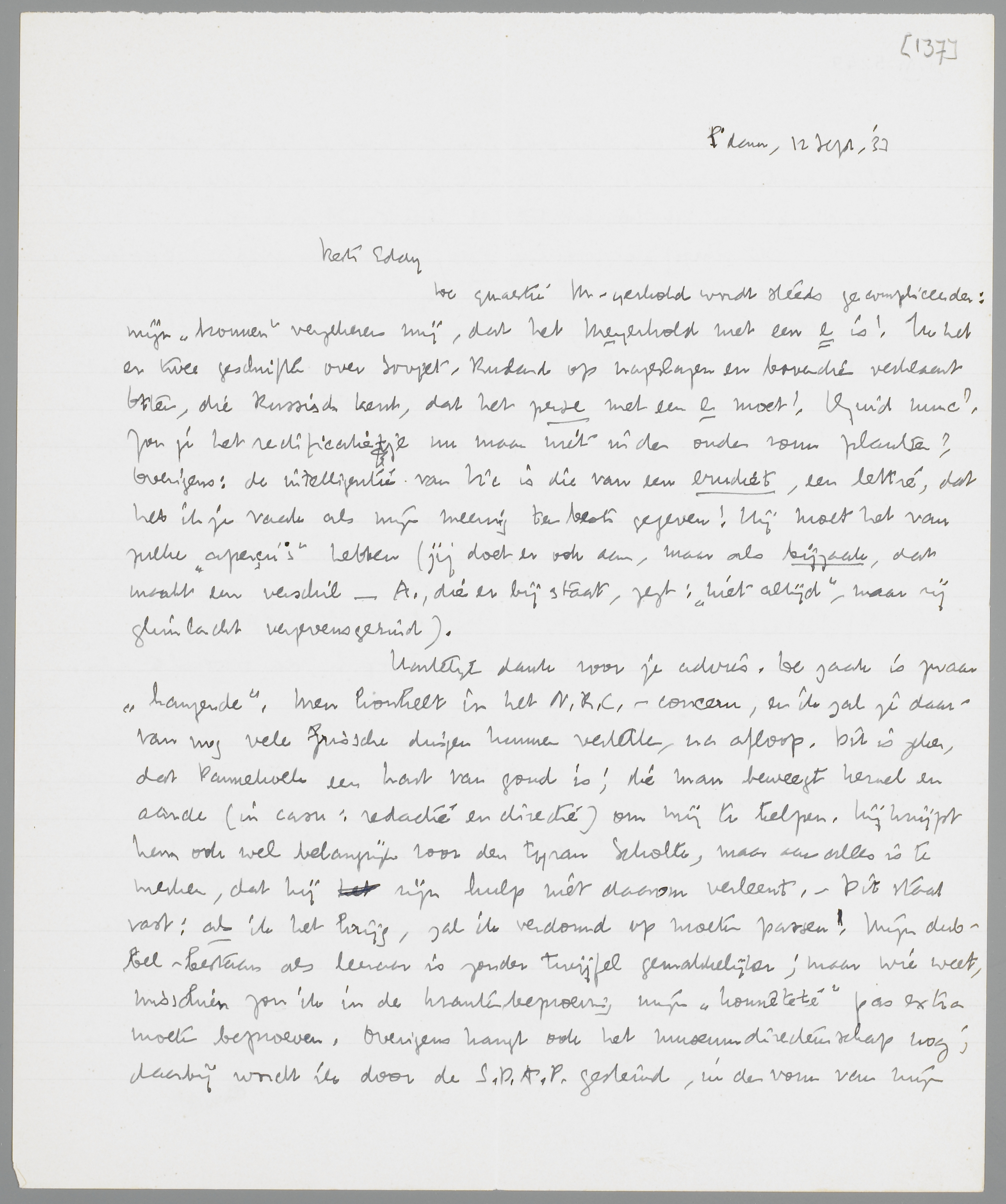 De quaestie M-yerhold wordt steeds gecompliceerder: mijn ‘bronnen’ verzekeren mij, dat het Meyerhold met een e is! Ik heb er twee geschriften over Sovjet-Rusland op nageslagen en bovendien verklaart Otten, die Russisch kent, dat het perse met een e moet! Quid nunc? Zou je het rectificatietje nu maar niet in den ouden vorm plaatsen? Overigens: de intelligentie van Vic is die van een erudiet, een lettré, dat heb ik je vaak als mijn meening ten beste gegeven! Hij moet het van zulke ‘apercu's’ hebben (jij doet er ook aan, maar als bijzaak, dat maakt een verschil - A., die er bij staat, zegt: ‘niet altijd’, maar zij glimlacht vergevensgezind).