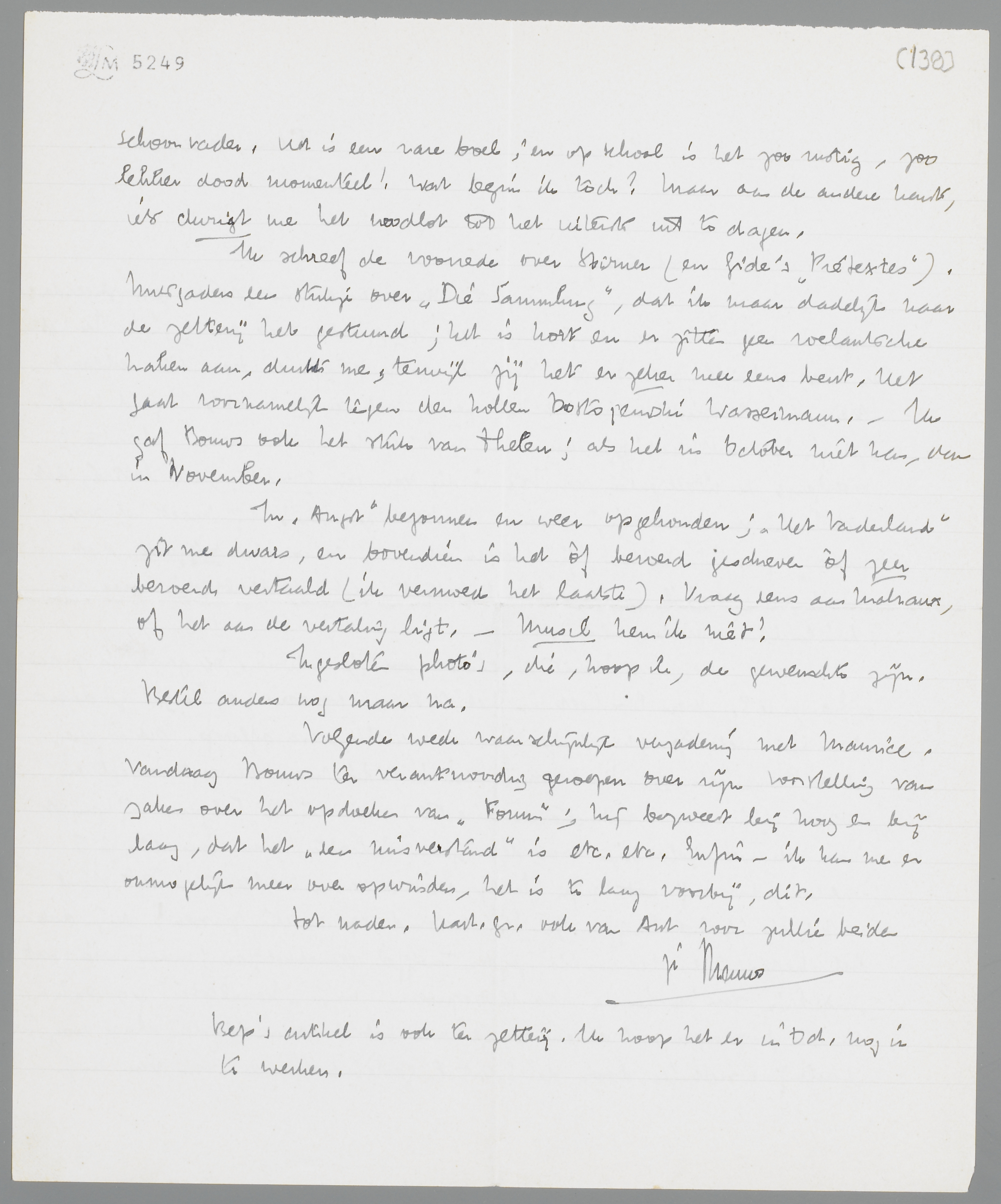 Ik schreef de voorrede over Stirner (en Gide's Prétextes). Mitsgaders een stukje over Die Sammlung, dat ik maar dadelijk naar de zetterij heb gestuurd; het is kort en er zitten geen roelantsche haken aan, dunkt me, terwijl jij het er zeker mee eens bent. Het gaat voornamelijk tegen den hollen Dostojewski Wassermann. - Ik gaf Bouws ook het stuk van Thelen; als het in October niet kan, dan in November.