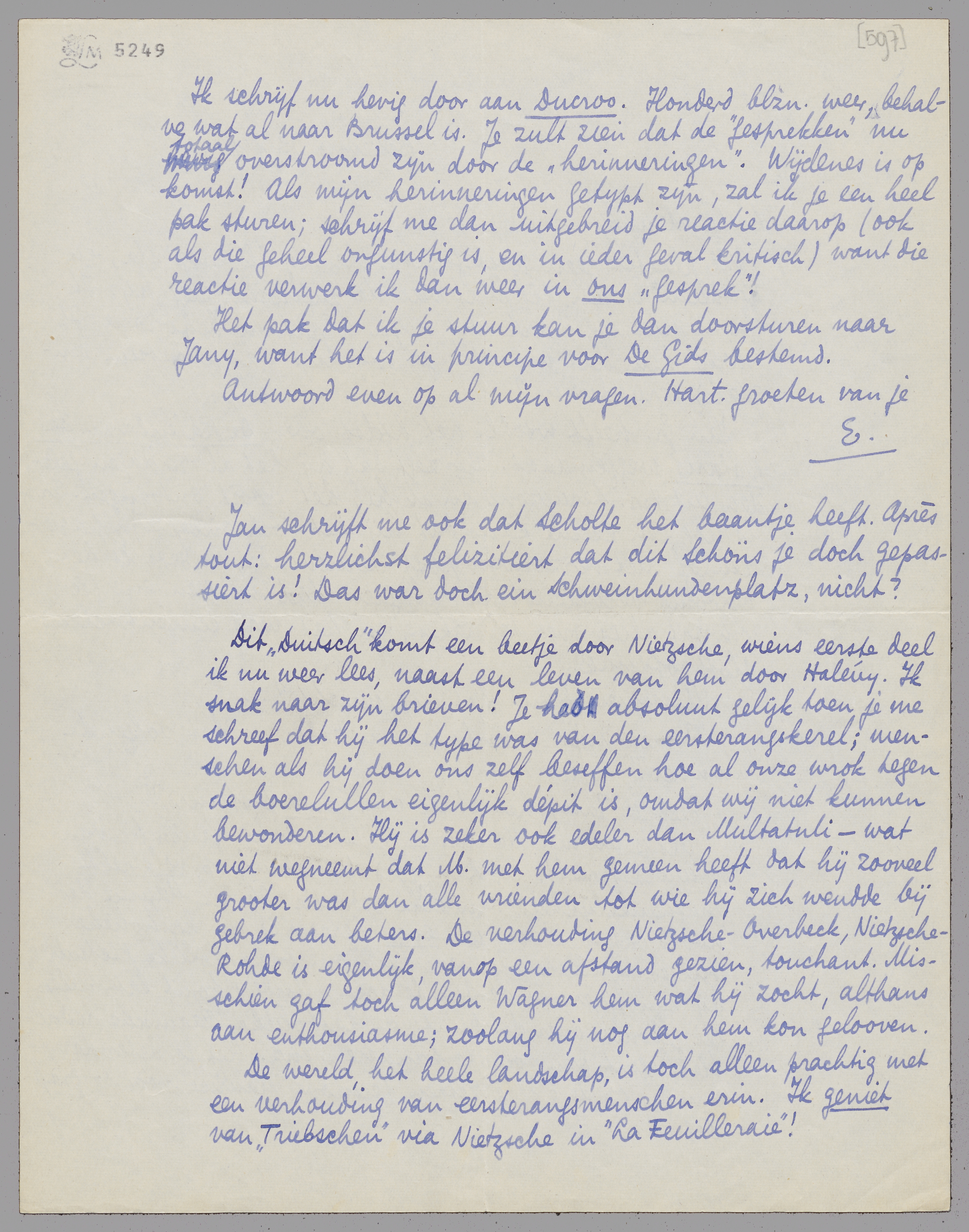 Dit ‘Duitsch’ komt een beetje door Nietzsche, wiens eerste deel ik nu weer lees, naast een leven van hem door Halévy. Ik snak naar zijn brieven! Je had absoluut gelijk toen je me schreef dat hij het type was van den eersterangskerel; menschen als hij doen ons zelf beseffen hoe al onze wrok tegen de boerelullen eigenlijk dépit is, omdat wij niet kunnen bewonderen. Hij is zeker ook edeler dan Multatuli - wat niet wegneemt dat M. met hem gemeen heeft dat hij zooveel grooter was dan alle vrienden tot wie hij zich wendde bij gebrek aan beters. De verhouding Nietzsche - Overbeck, Nietsche - Rohde is eigenlijk, vanop een afstand gezien, touchant. Misschien gaf toch alleen Wagner hem wat hij zocht, althans aan enthousiasme; zoolang hij nog aan hem kon gelooven.
