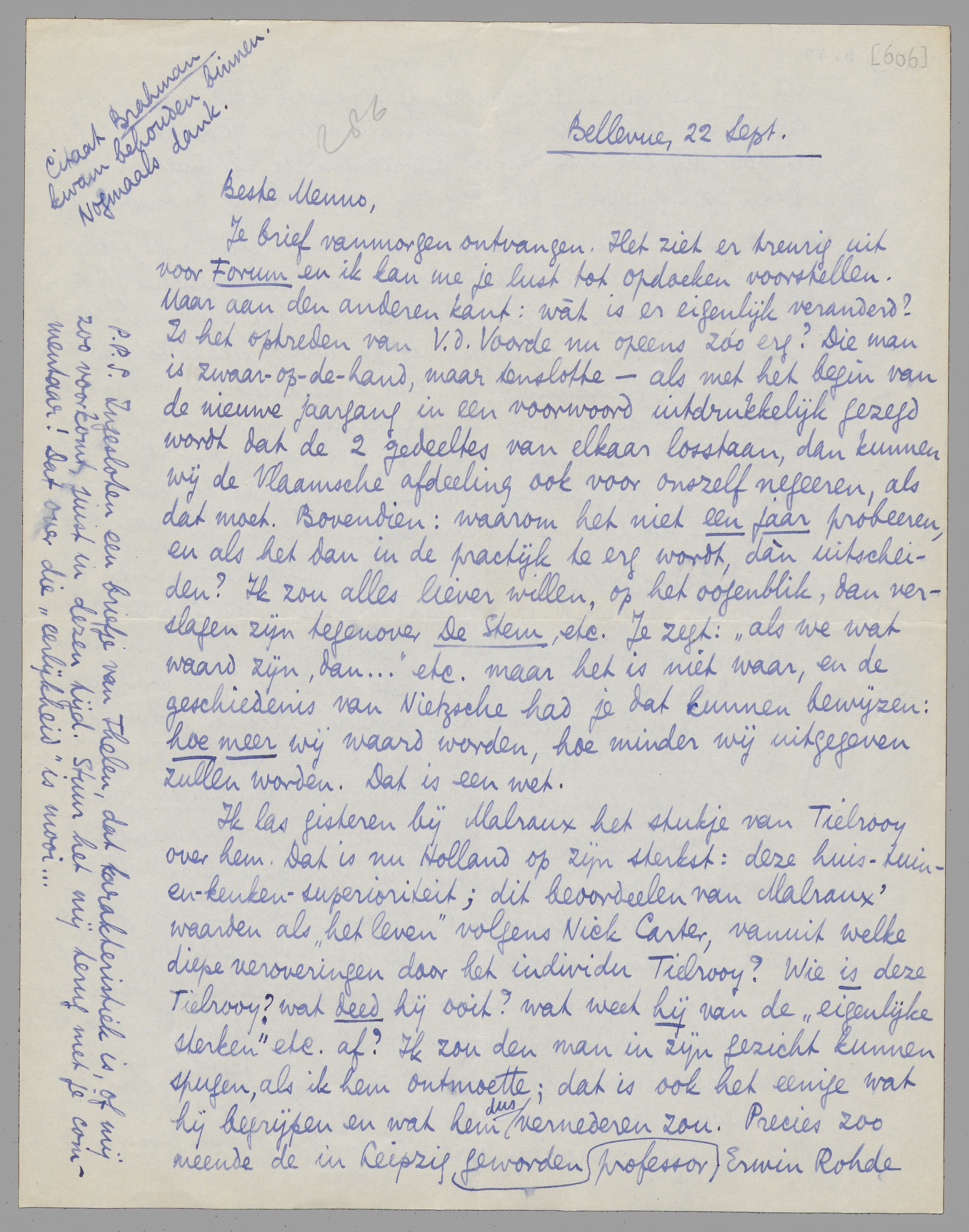 Ik las gisteren bij Malraux het stukje van Tielrooy over hem. Dat is nu Holland op zijn sterkst: deze huis-tuin-en-keuken-superioriteit; dit beoordeelen van Malraux' waarden als ‘het leven’ volgens Nick Carter, vanuit welke diepe veroveringen door het individu Tielrooy? Wie is deze Tielrooy? wat deed hij ooit? wat weet hij van de ‘eigenlijke sterken’ etc. af? Ik zou den man in zijn gezicht kunnen spugen, als ik hem ontmoette; dat is ook het eenige wat hij begrijpen en wat hem dus vernederen zou. Precies zoo meende de in Leipzig professor geworden Erwin Rohde dat zijn bevestigde, geconsacreerde levenswijsheid totaal opwoog tegen de rariteiten van zijn mislukten vriend Nietzsche. Die Rohde is voor mij ook een van de bedroevendste individuën in het leven van Nietzsche, dat mij nog altijd hevig ontmoedigt.
