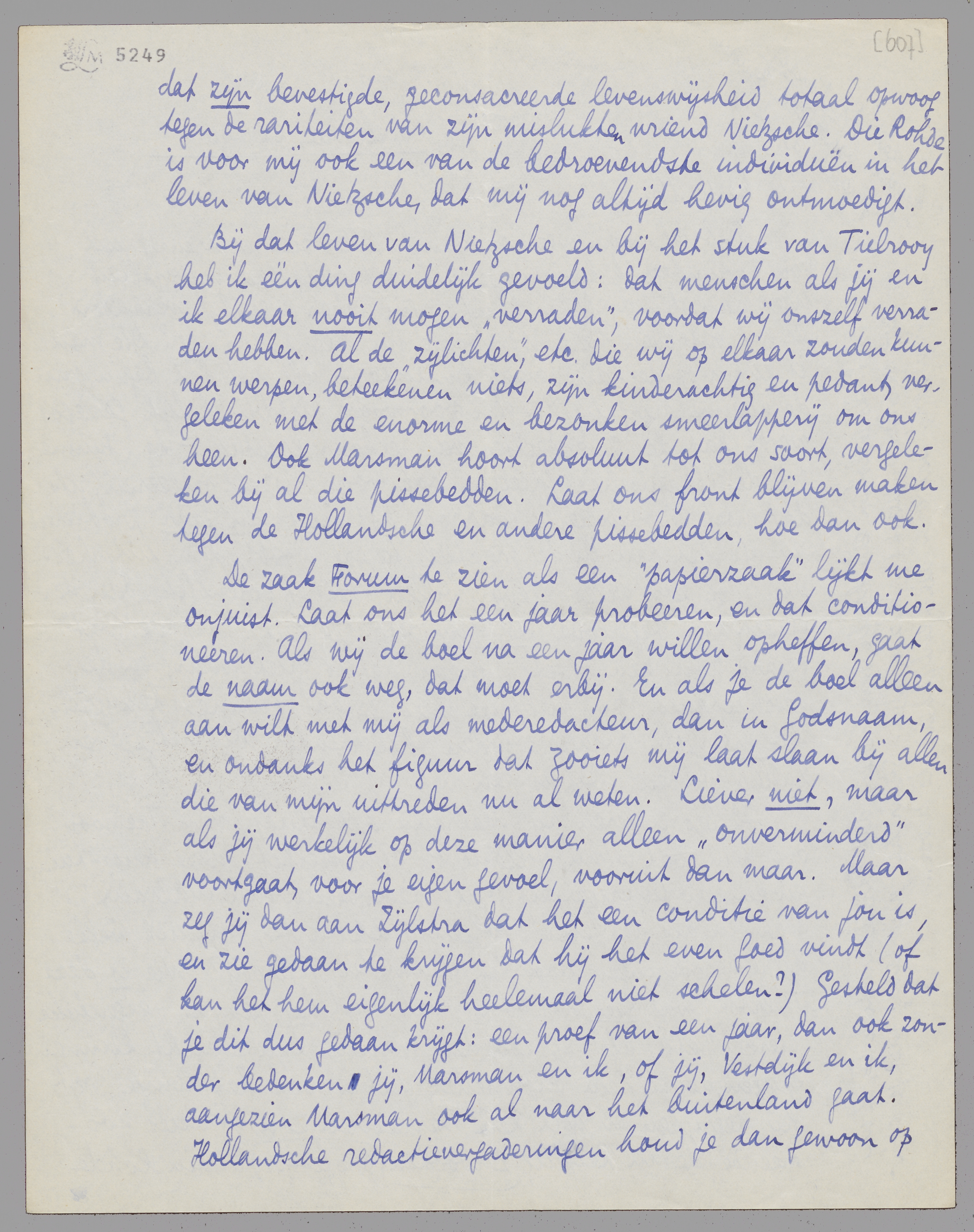 Bij dat leven van Nietzsche en bij het stuk van Tielrooy heb ik één ding duidelijk gevoeld: dat menschen als jij en ik elkaar nooit mogen ‘verraden’, voordat wij onszelf verraden hebben. Al de ‘zijlichten’, etc. die wij op elkaar zouden kunnen werpen, beteekenen niets, zijn kinderachtig en pedant vergeleken met de enorme en bezonken smeerlapperij om ons heen. Ook Marsman hoort absoluut tot ons soort, vergeleken bij al die pissebedden. Laat ons front blijven maken tegen de Hollandsche en andere pissebedden, hoe dan ook.