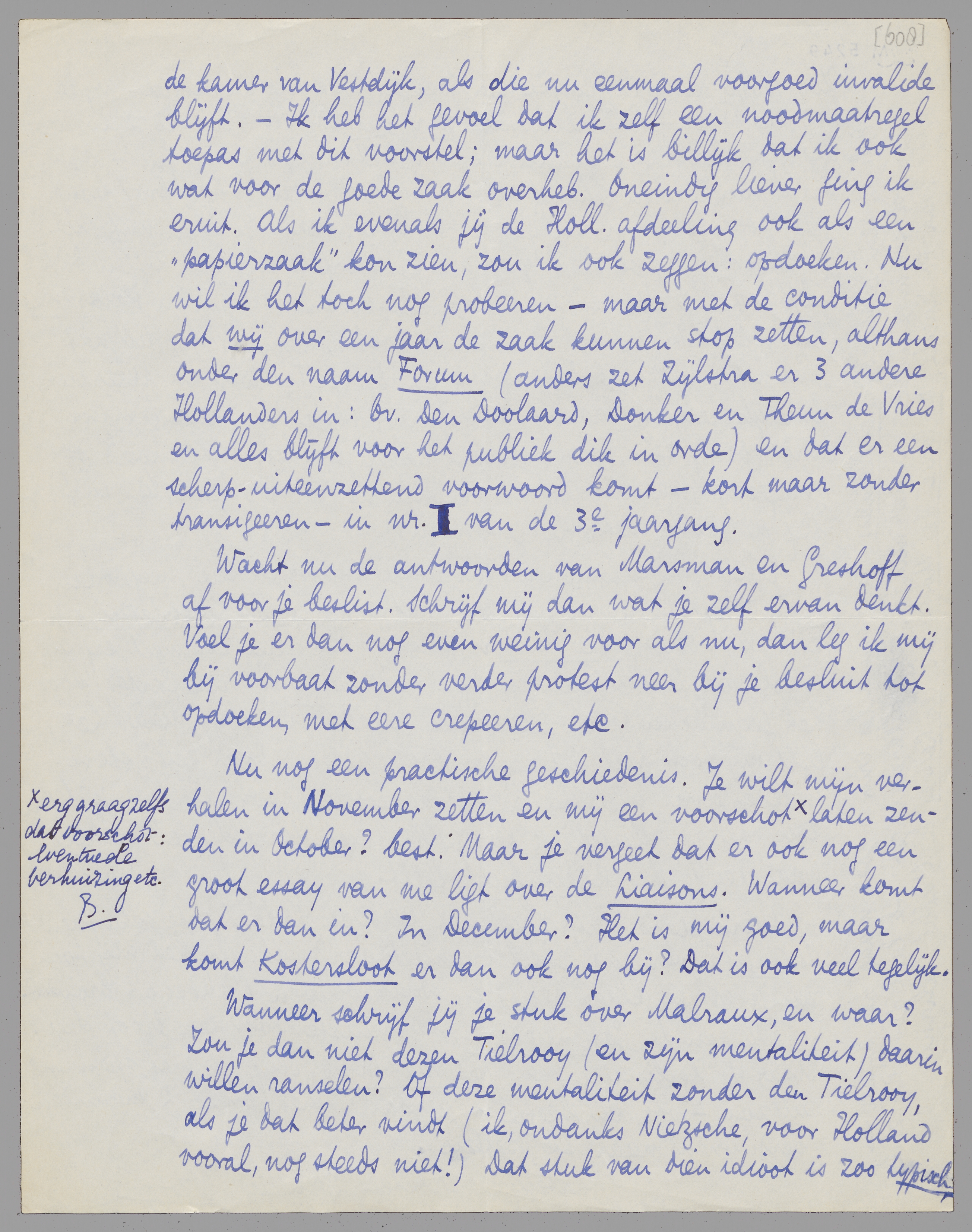 De zaak Forum te zien als een ‘papierzaak’ lijkt me onjuist. Laat ons het een jaar probeeren, en dat conditioneeren. Als wij de boel na een jaar willen opheffen, gaat de naam ook weg, dat moet erbij. En als je de boel alleen aan wilt met mij als mederedacteur, dan in Godsnaam, en ondanks het figuur dat zooiets mij laat slaan bij allen die van mijn uittreden nu al weten. Liever niet, maar als jij werkelijk op deze manier alleen ‘onverminderd’ voortgaat voor je eigen gevoel, vooruit dan maar. Maar zeg jij dan aan Zijlstra dat het een conditie van jou is, en zie gedaan te krijgen dat hij het even goed vindt (of kan het hem eigenlijk heelemaal niet schelen?) Gesteld dat je dit dus gedaan krijgt: een proef van een jaar, dan ook zonder bedenken jij, Marsman en ik, of jij, Vestdijk en ik, aangezien Marsman ook al naar het buitenland gaat. Hollandsche redactievergaderingen houd je dan gewoon op de kamer van Vestdijk, als die nu eenmaal voorgoed invalide blijft. - Ik heb het gevoel dat ik zelf een noodmaatregel toepas met dit voorstel; maar het is billijk dat ik ook wat voor de goede zaak over heb. Oneindig liever ging ik eruit. Als ik evenals jij de Holl. afdeeling ook als een ‘papierzaak’ kon zien, zou ik ook zeggen: opdoeken. Nu wil ik het toch nog probeeren - maar met de conditie dat wij over een jaar de zaak kunnen stop zetten, althans onder den naam Forum (anders zet Zijlstra er 3 andere Hollanders in: bv. Den Doolaard, Donker en Theun de Vries en alles blijft voor het publiek dik in orde) en dat er een scherp-uiteenzettend voorwoord komt - kort maar zonder transigeeren - in nr. 1 van de 3e jaargang.