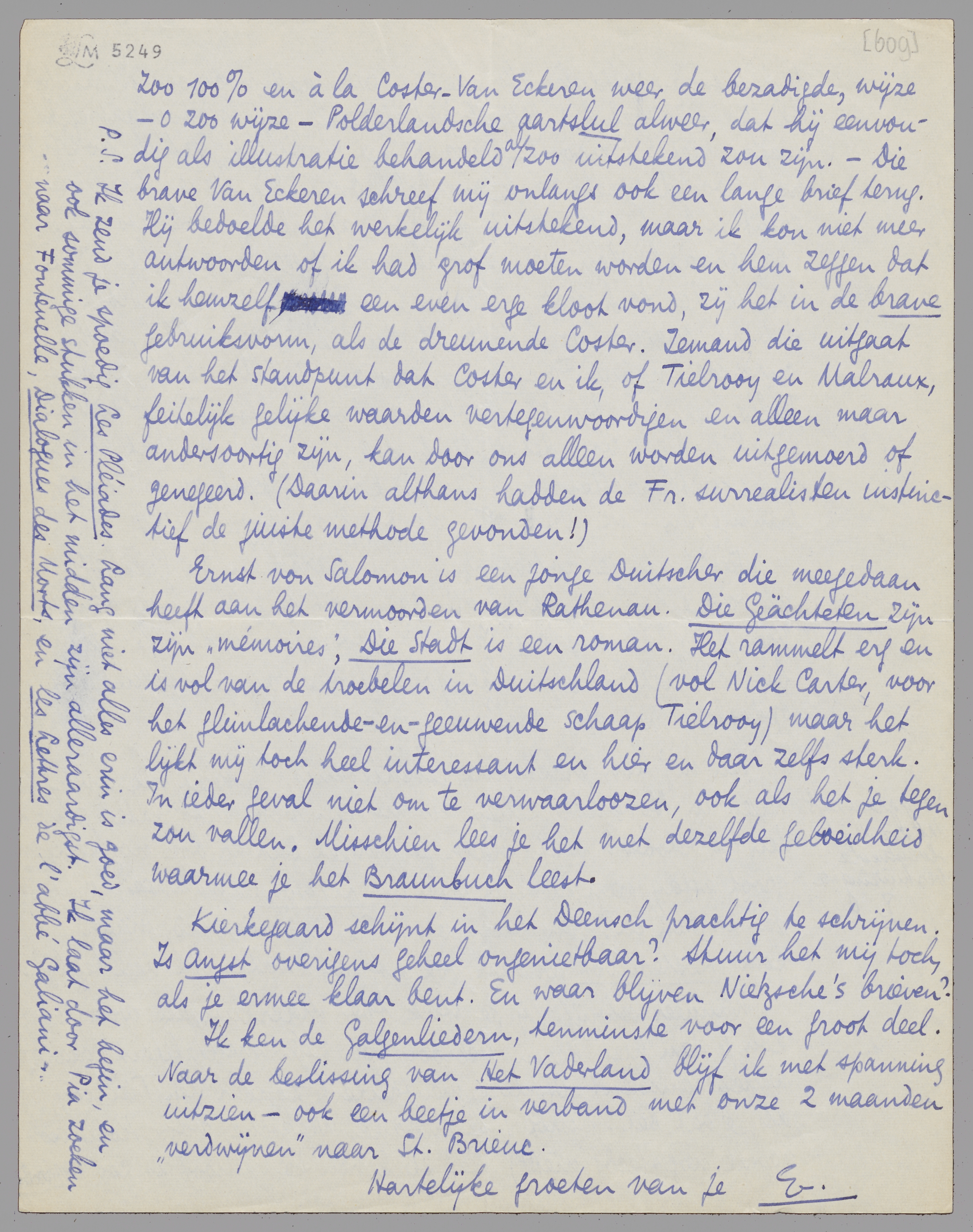 Wanneer schrijf jij je stuk over Malraux, en waar? Zou je dan niet dezen Tielrooy (en zijn mentaliteit) daarin willen ranselen? Of deze mentaliteit zonder den Tielrooy, als je dat beter vindt (ik, ondanks Nietzsche, voor Holland vooral, nog steeds niet!) Dat stuk van dien idioot is zoo typisch zoo 100% en à la Coster-Van Eckeren weer de bezadigde, wijze - o zoo wijze - Polderlandsche aartslul alweer, dat hij eenvoudig als illustratie behandeld al zoo uitstekend zou zijn. - Die brave Van Eckeren schreef mij onlangs ook een lange brief terug. Hij bedoelde het werkelijk uitstekend, maar ik kon niet meer antwoorden of ik had grof moeten worden en hem zeggen dat ik hemzelf een even erge kloot vond, zij het in de brave gebruiksvorm, als de dreunende Coster. Iemand die uitgaat van het standpunt dat Coster en ik, of Tielrooy en Malraux, feitelijk gelijke waarden vertegenwoordigen en alleen maar andersoortig zijn, kan door ons alleen worden uitgemoerd of genegeerd. (Daarin althans hadden de Fr. surrealisten instinctief de juiste methode gevonden!)