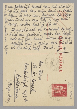 Gelijk hiermee zend ik je een stuk waarvan ik niet weet wat ermee gebeuren moet. Als Forum ophoudt te bestaan, kan het misschien alleen in D.G.W. Bep zegt dat het beter is het juist niet direct te plaatsen, om het niet zoo absoluut het karakter te geven van een antikritiek. Ik geloof dat dit zeer juist is. Hier en daar zal ik het nog wel veranderen; een citaat wat korter maken, een herhaling schrappen. Ik stuur het je nu maar voor je opinie (maak in potlood kanttekeningen als je wilt) en wat je me aanraadt. Heelemaal in ms. laten tot het boek uitkomt wil zeggen over ± 7 mndn. pas - ergens als artikel over bv. 3 mnd. lijkt mij dan beter. Ik heb een goddelijk gevoel van opluchting nu dit pak van mijn hart is. Straks begin ik weer aan Ducroo. De copy van J.v.N. en van J. Gr. is nog niet terug; anders had je die al.